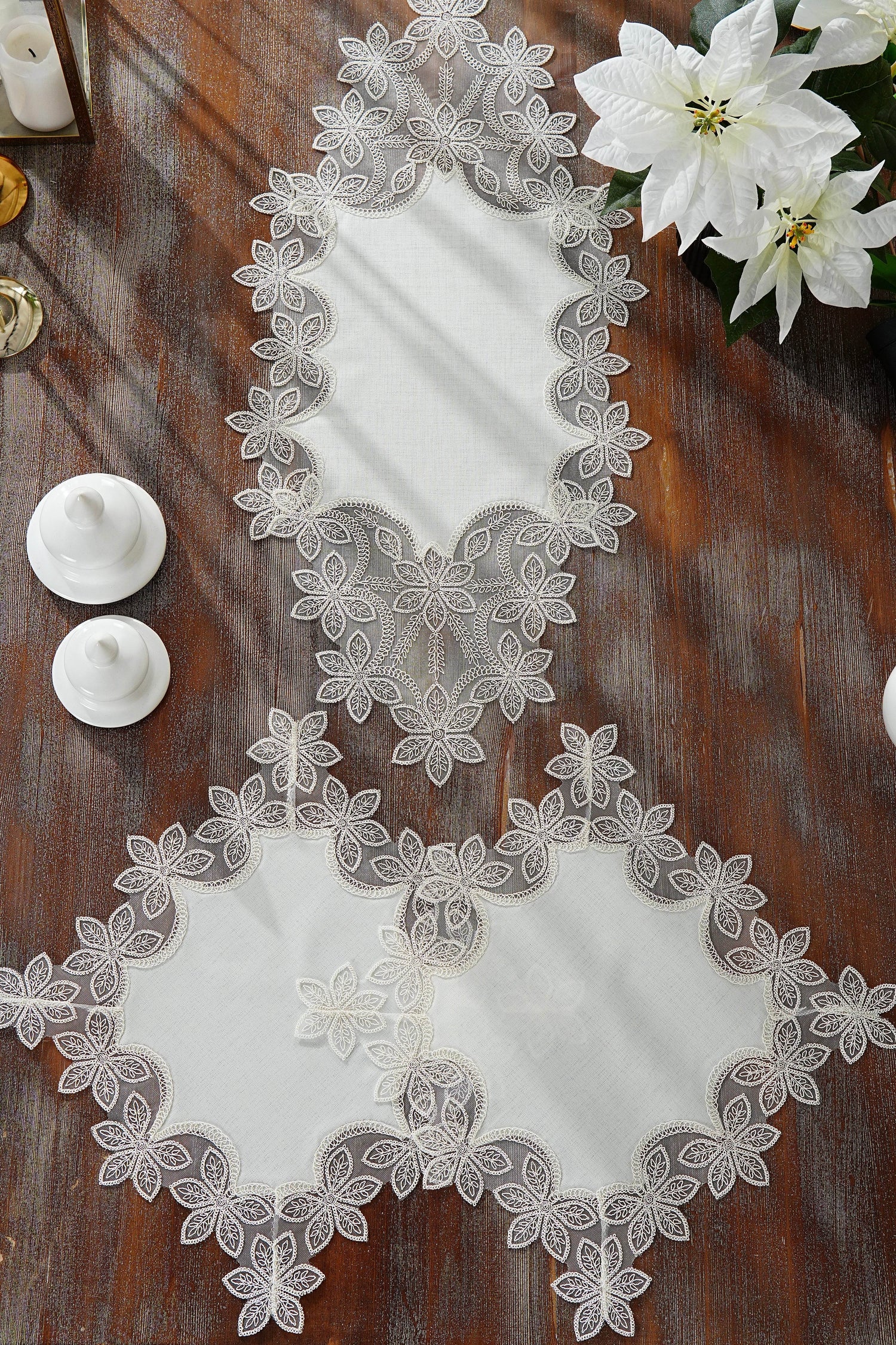 طقم مفارش سفرة مزين بدانتيل اوف وايت - موديل دينا – شامل المناديل - ٣٧ قطعة – ١٢ شخص - قماش كتان مقاوم للبقع