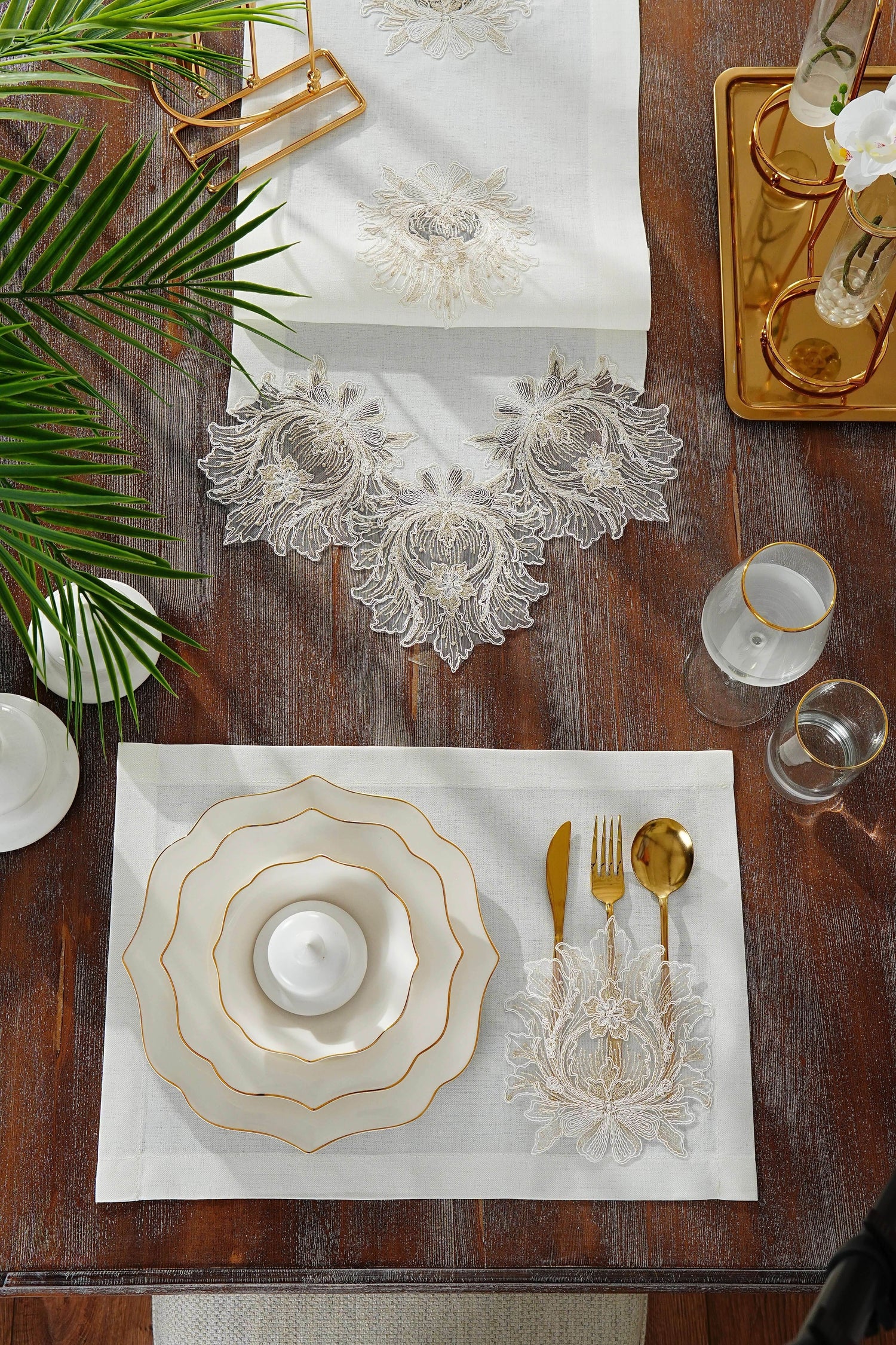طقم مفارش سفرة مزين بدانتيل ذهبى واوف وايت - موديل اوركيد – شامل المناديل - ٣٧ قطعة – ١٢ شخص - قماش كتان مقاوم للبقع