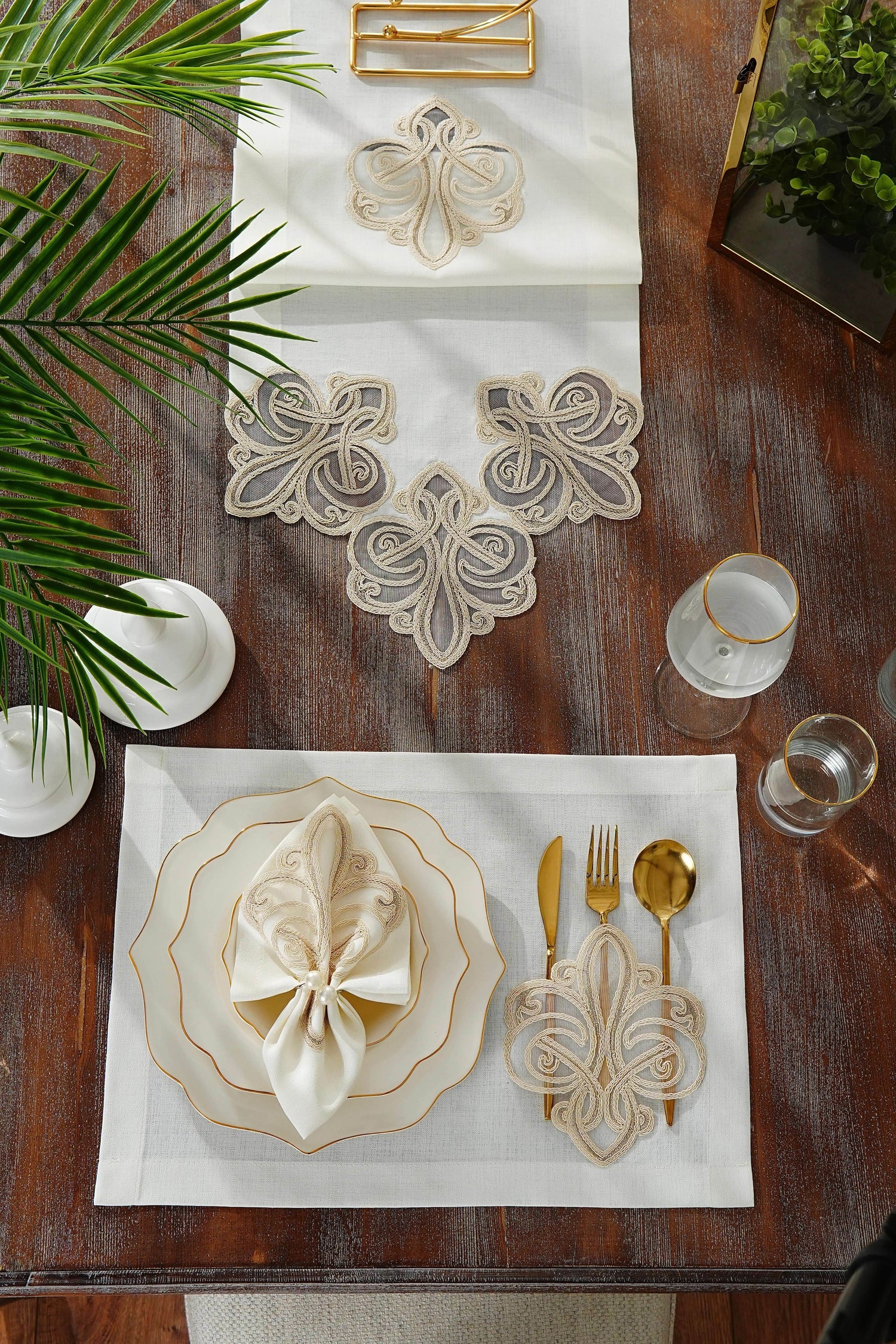 طقم مفارش سفرة مزين بدانتيل ذهبى - موديل نيدا – شامل المناديل - ٣٧ قطعة – ١٢ شخص - قماش كتان مقاوم للبقع