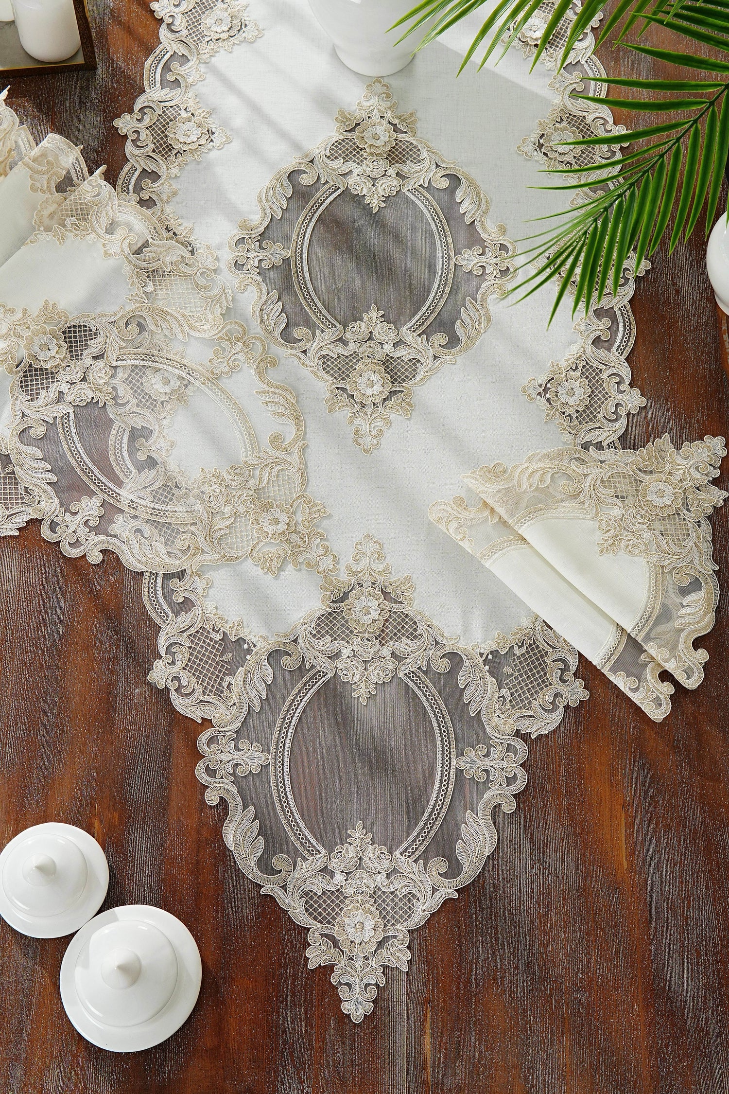 طقم مفارش سفرة مزين بدانتيل كابتشينو - موديل ڤينتو – شامل المناديل - ٣٧ قطعة – ١٢ شخص - قماش كتان مقاوم للبقع