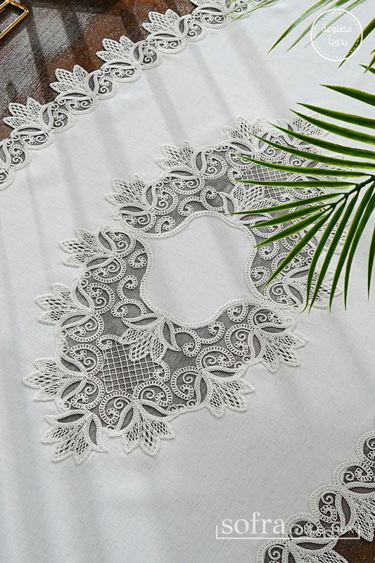 طقم مفارش سفرة كامل مزين بدانتيل اوف وايت - موديل لالى – ٣٨ قطعة – ١٢ شخص - قماش كتان مقاوم للبقع