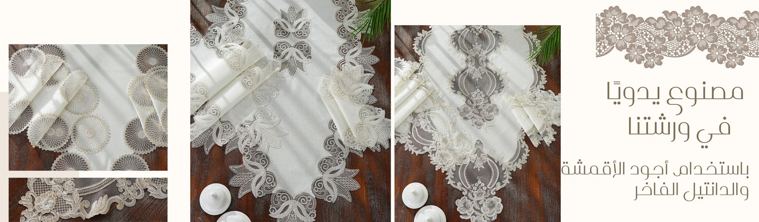 كل قطعة تُصنع بعناية وحرفية في ورشتنا باستخدام أجود الأقمشة وأفخم الدانتيل المختار بعناية. من مائدتكم إلى غرفة نومكم، ومن صالونكم إلى غرفة الضيوف، لتضيف لمسة من الأناقة الخالدة لكل