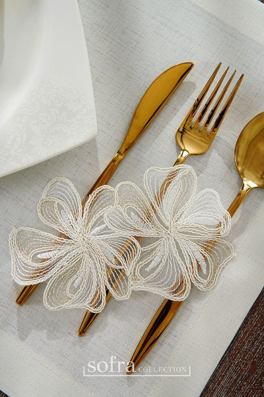 طقم مفارش سفرة مزين بدانتيل ذهبى واوف وايت - موديل اوركيد – شامل المناديل - ٣٧ قطعة – ١٢ شخص - قماش كتان مقاوم للبقع