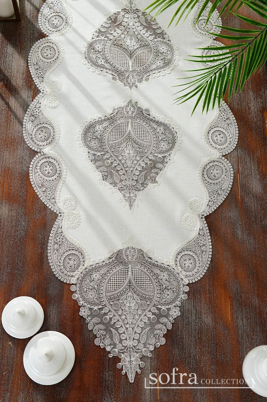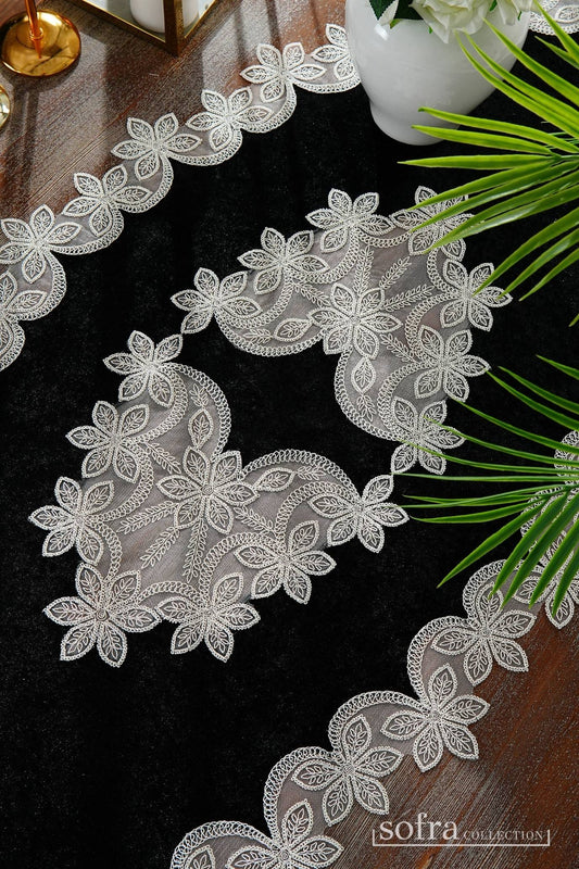 طقم مفارش صالون ٥ قطع مزين بدانتيل فضى واوف وايت – موديل سفير - قماش كتان فاخر مقاوم للبقع