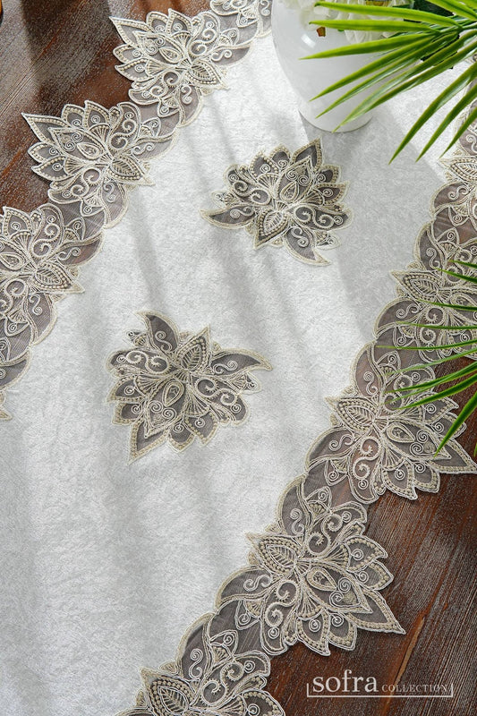 طقم مفارش صالون ٥ قطع مزين بدانتيل بلاتينى – موديل سالكم - قماش كتان فاخر مقاوم للبقع