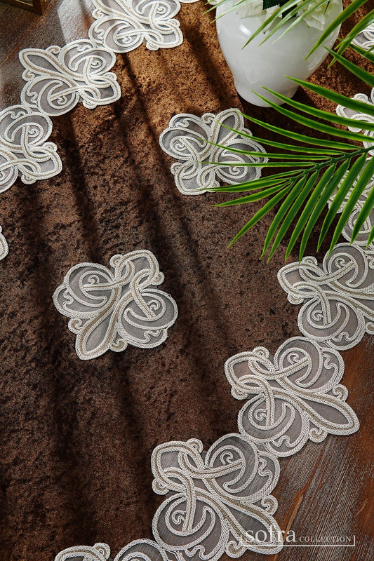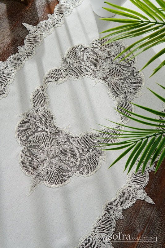 طقم مفارش صالون ٥ قطع مزين بدانتيل اوف وايت – موديل صوفيا - قماش كتان فاخر مقاوم للبقع
