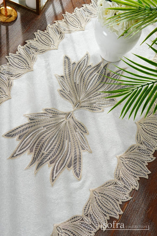 طقم مفارش صالون ٥ قطع مزين بدانتيل ذهبى – موديل كاكتوس – قماش قطيفة فاخر اوف وايت اللون