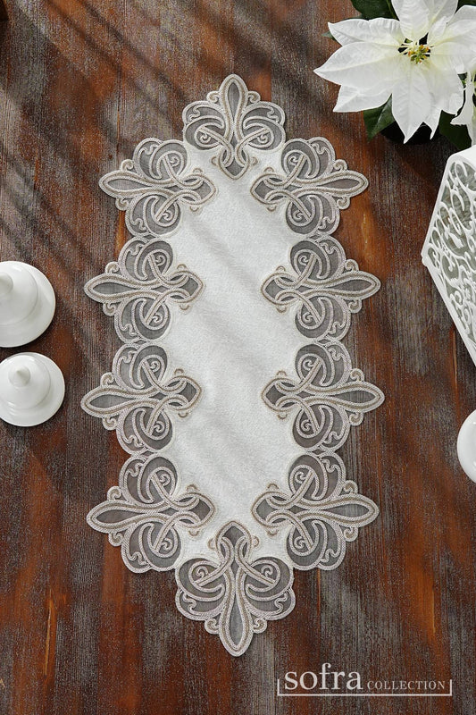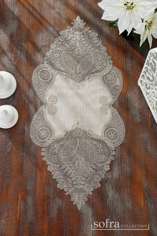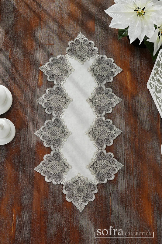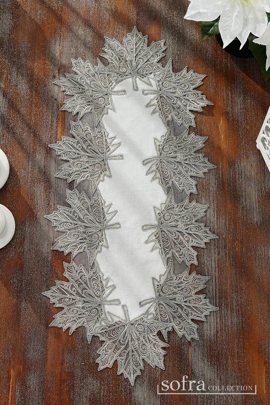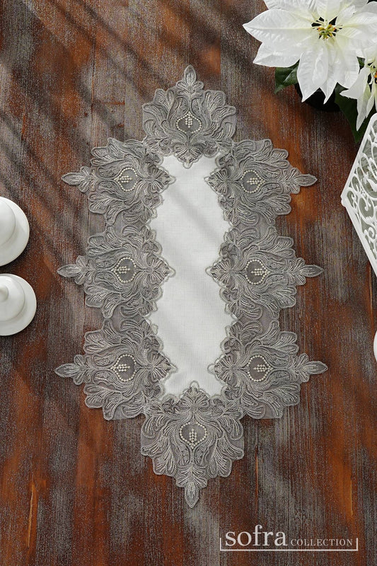 طقم مفارش ٣ قطع مزين بدانتيل رمادى وفضى – موديل ورق الغار - قماش كتان فاخر مقاوم للبقع