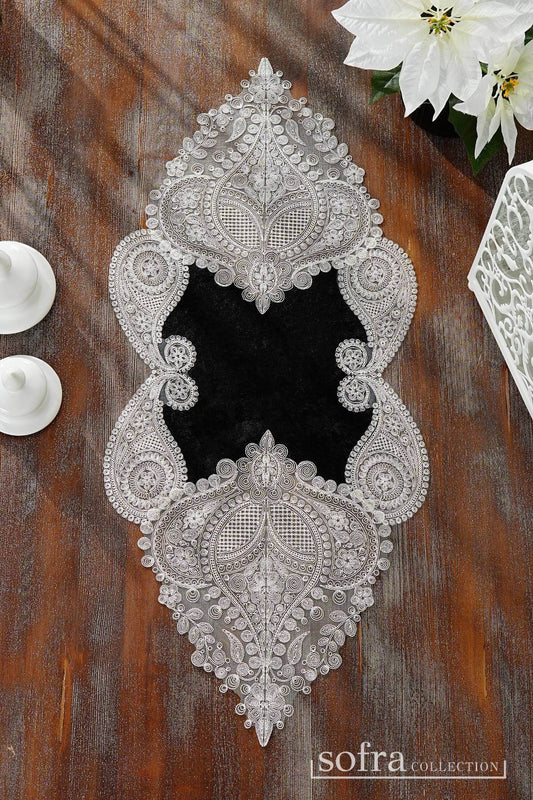 طقم مفارش٣ قطع مزين بدانتيل اوف وايت – موديل سالكم – قماش قطيفة فاخر اسود اللون