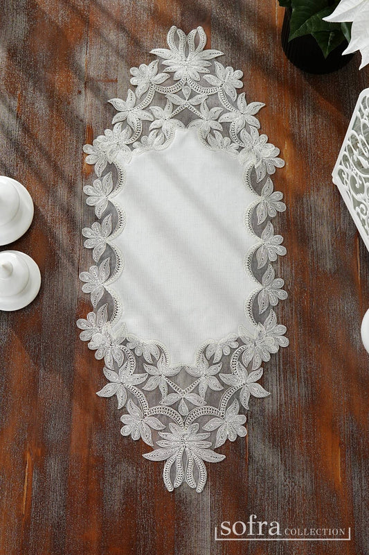 طقم مفارش ٣ قطع مزين بدانتيل اوف وايت – موديل زهرة الصيف - قماش كتان فاخر مقاوم للبقع