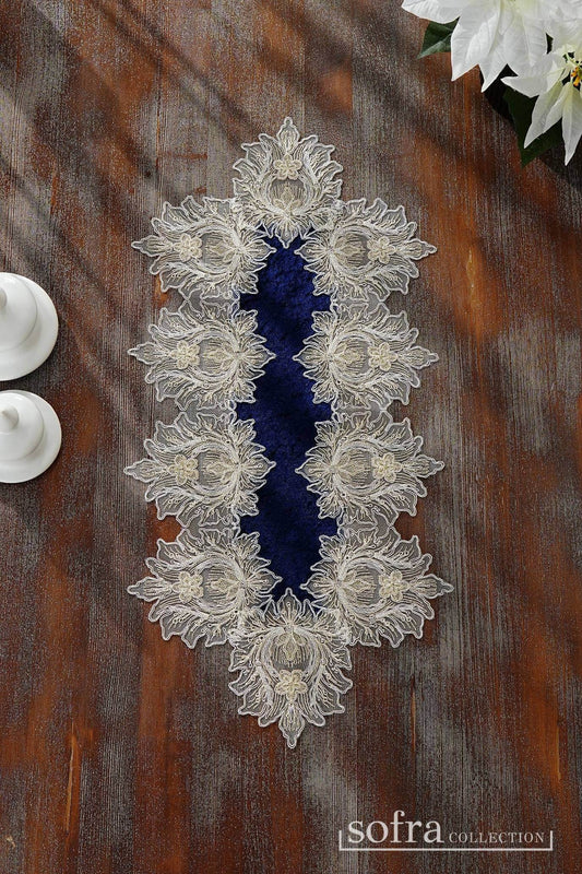 طقم مفارش٣ قطع مزين بدانتيل ذهبى – موديل تاج محل – قماش قطيفة فاخر ازرق داكن اللون