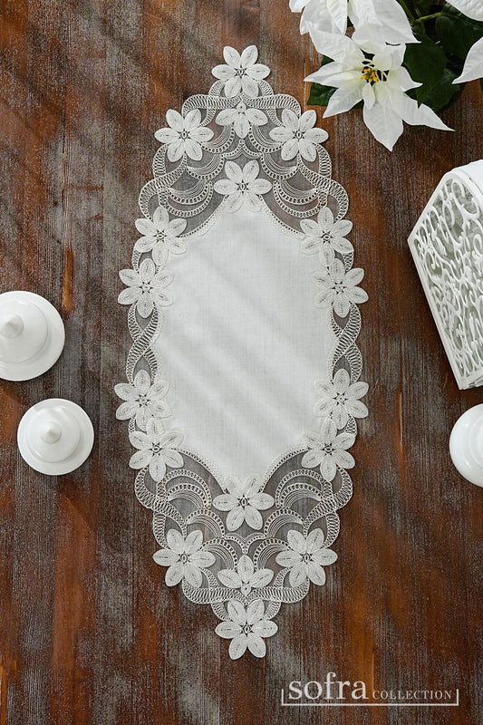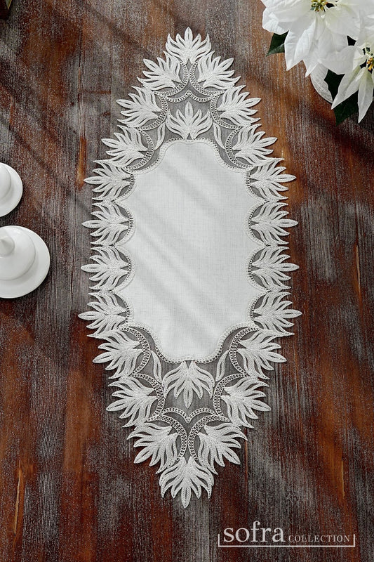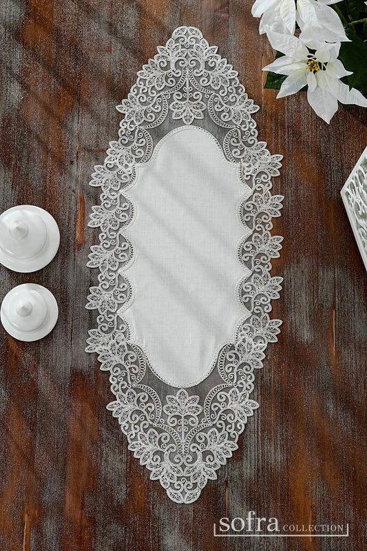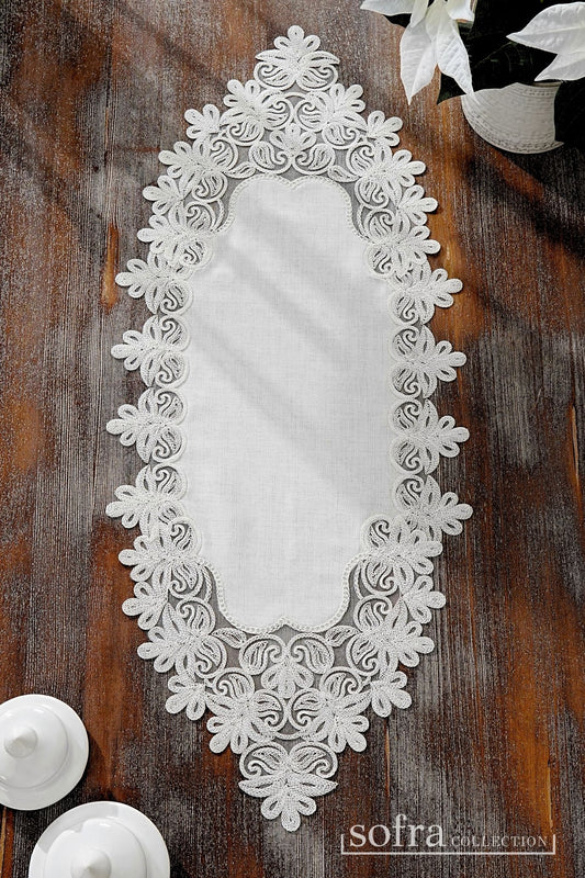 طقم مفارش ٣ قطع مزين بدانتيل فضى واوف وايت – موديل سفير - قماش كتان فاخر مقاوم للبقع