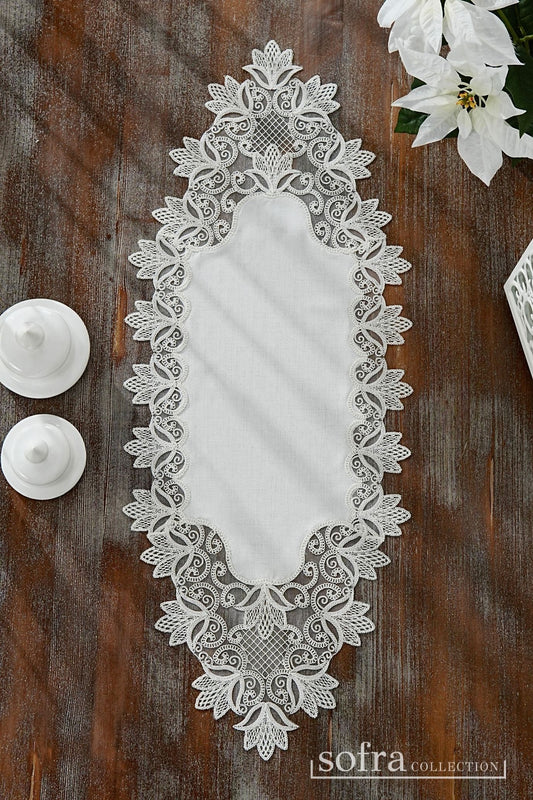طقم مفارش ٣ قطع مزين بدانتيل اوف وايت – موديل هنزاده - قماش كتان فاخر مقاوم للبقع