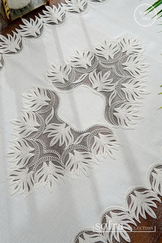 طقم مفارش صالون ٥ قطع مزين بدانتيل اوف وايت – موديل فوليا - قماش كتان فاخر مقاوم للبقع