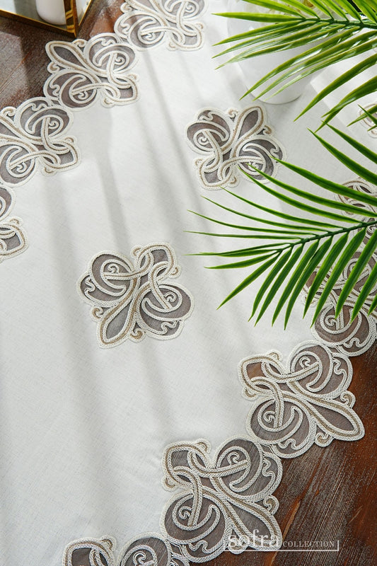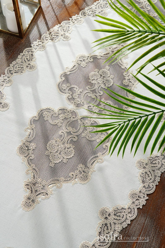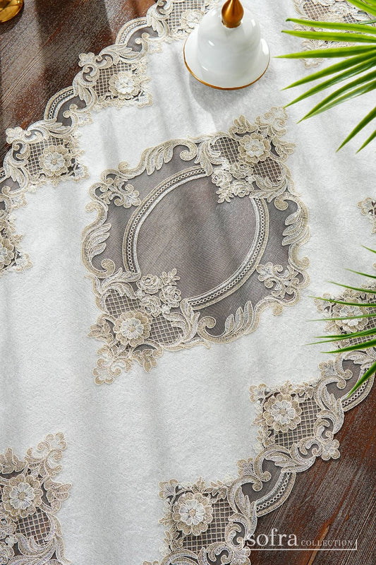 طقم مفارش صالون ٥ قطع مزين بدانتيل اوف وايت – موديل صوفيا - قماش كتان فاخر مقاوم للبقع
