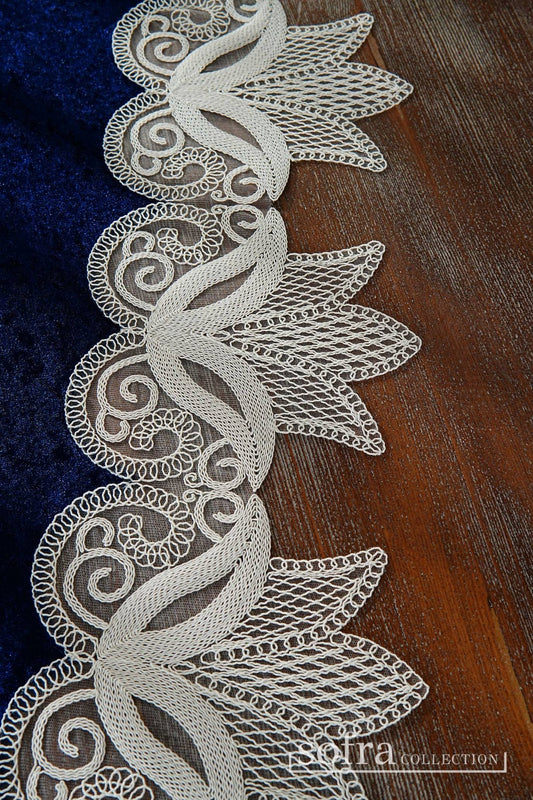طقم مفارش صالون ٥ قطع مزين بدانتيل اوف وايت – موديل لالى - قماش قطيفة فاخر ازرق داكن اللون