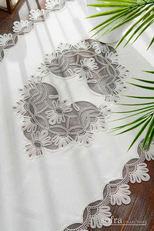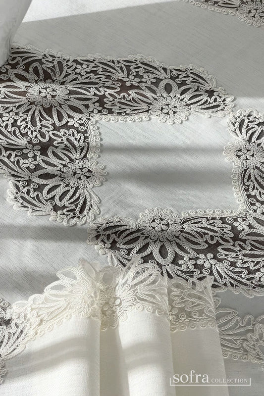 طقم مفارش صالون ٥ قطع مزين بدانتيل اوف وايت – موديل إيلا - قماش كتان فاخر مقاوم للبقع