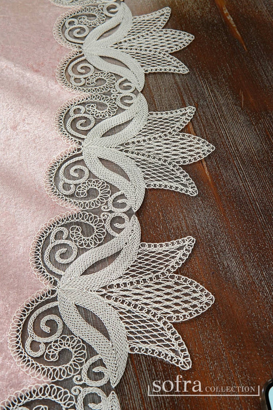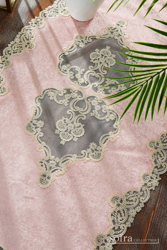 طقم مفارش صالون ٥ قطع مزين بدانتيل اوف وايت – موديل فينتاج - قماش قطيفة فاخر وردي فاتح اللون