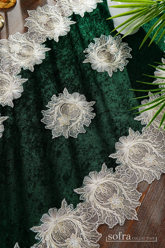 طقم مفارش صالون ٥ قطع مزين بدانتيل اوف وايت – موديل شمس – قماش قطيفة فاخر أخضر اللون