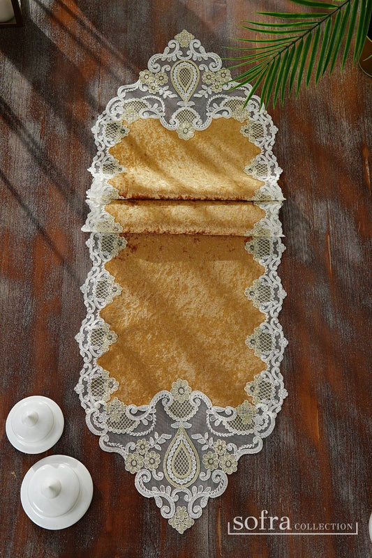 طقم مفارش صالون ٥ قطع مزين بدانتيل اوف وايت – موديل فينتو – قماش قطيفة فاخر بنى اللون