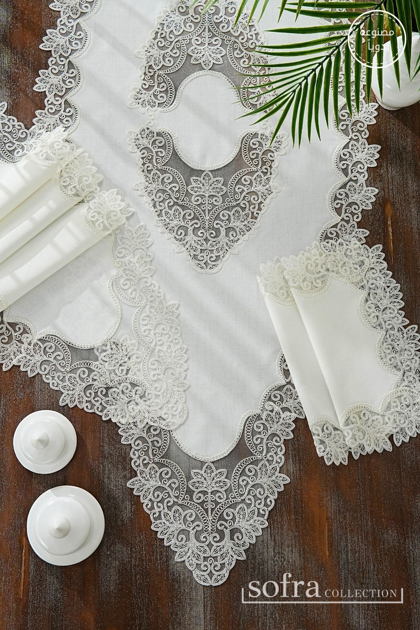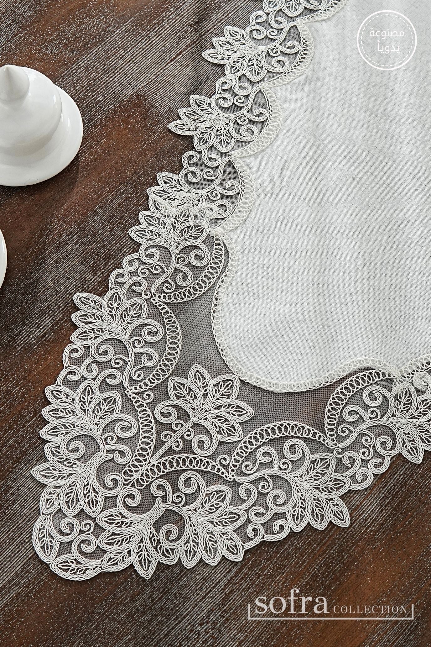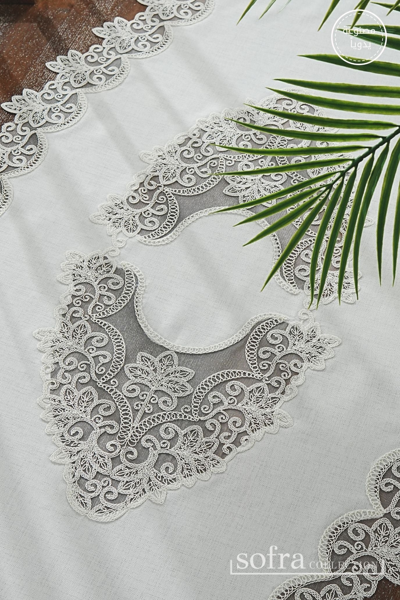 طقم مفارش صالون ٥ قطع مزين بدانتيل اوف وايت – موديل اتشاليا - قماش كتان فاخر مقاوم للبقع