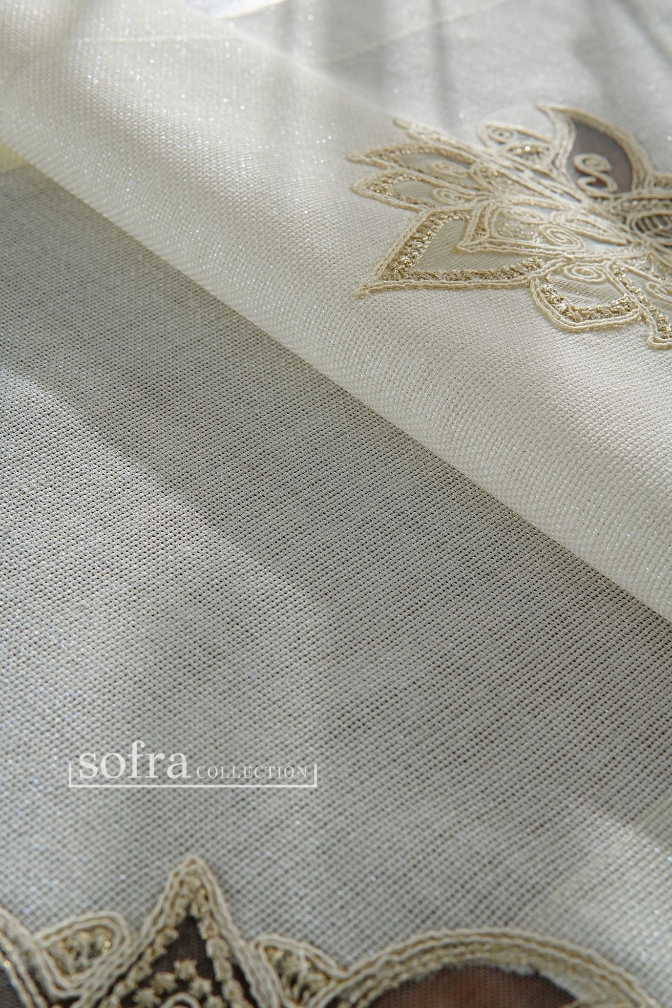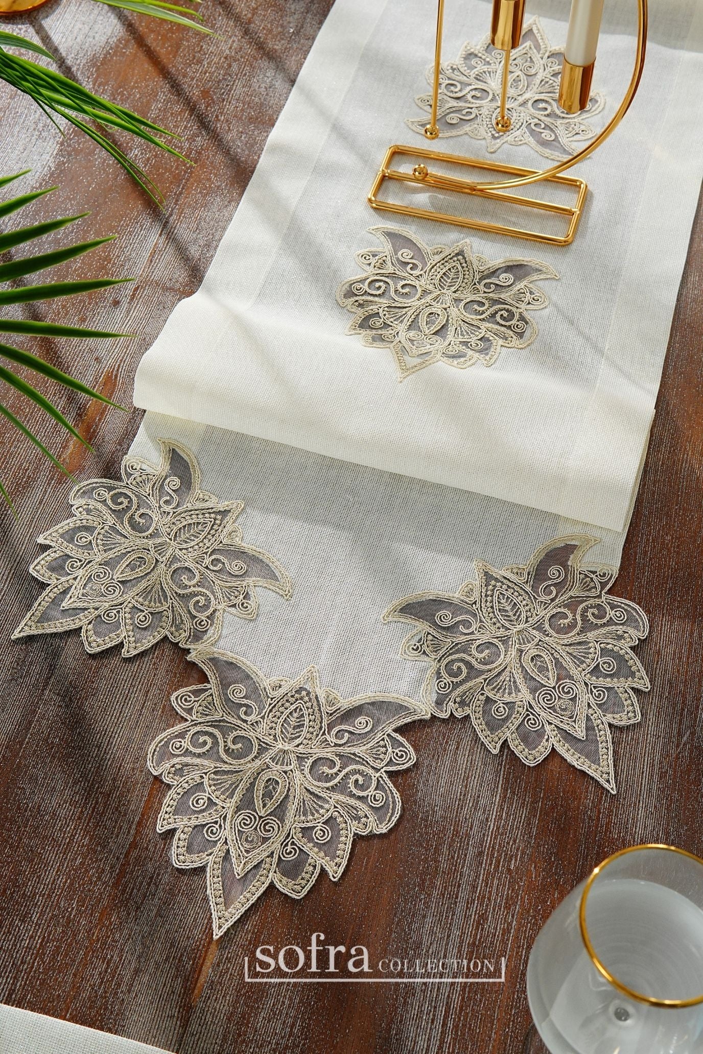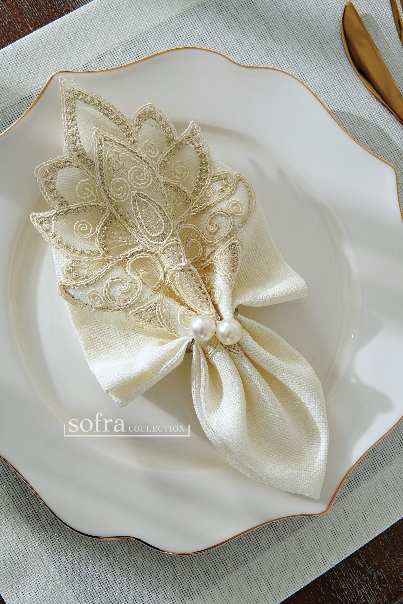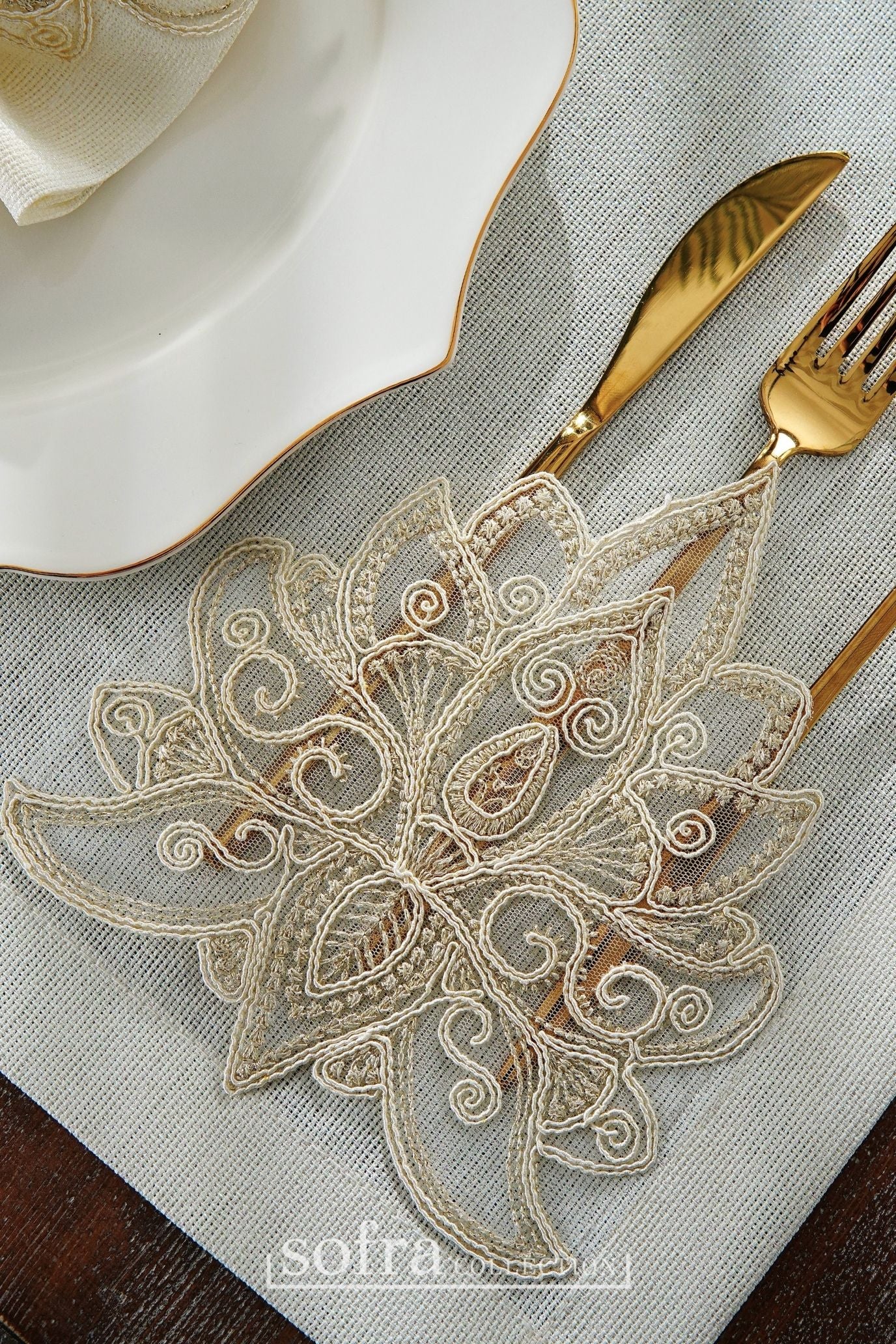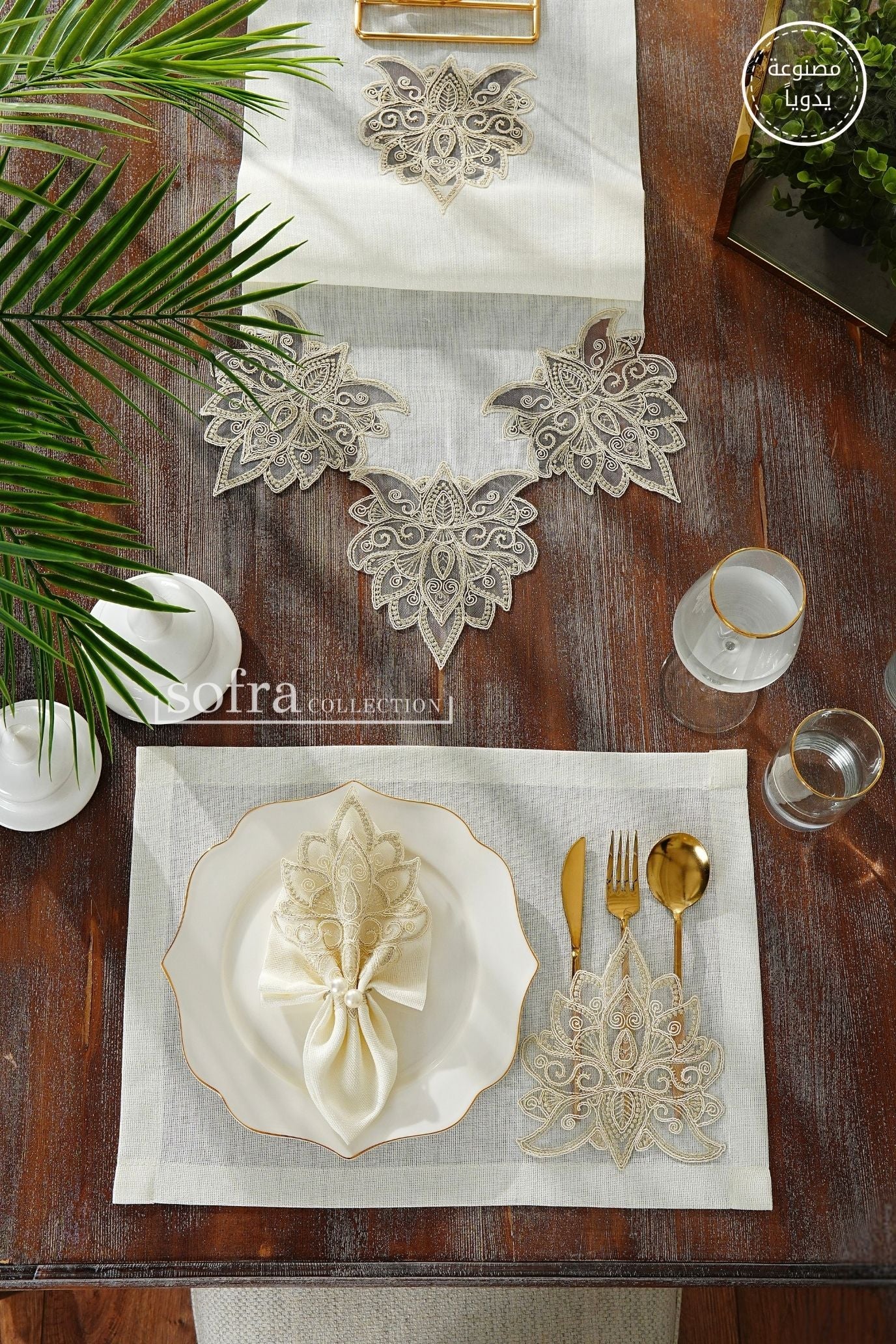 طقم مفارش سفرة مزين بدانتيل ذهبى - موديل انكا – شامل المناديل - ٣٧ قطعة – ١٢ شخص - قماش كتان مقاوم للبقع