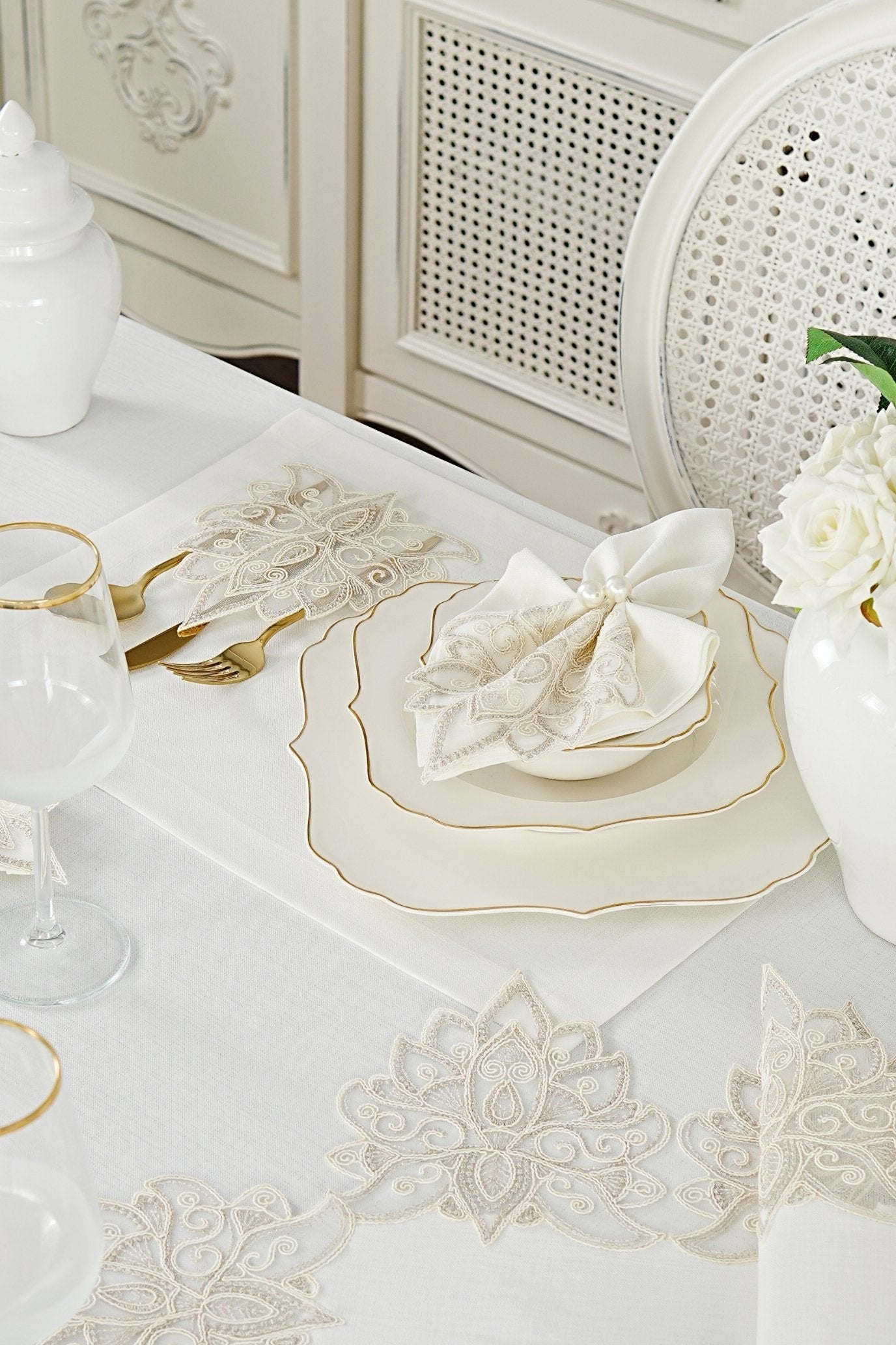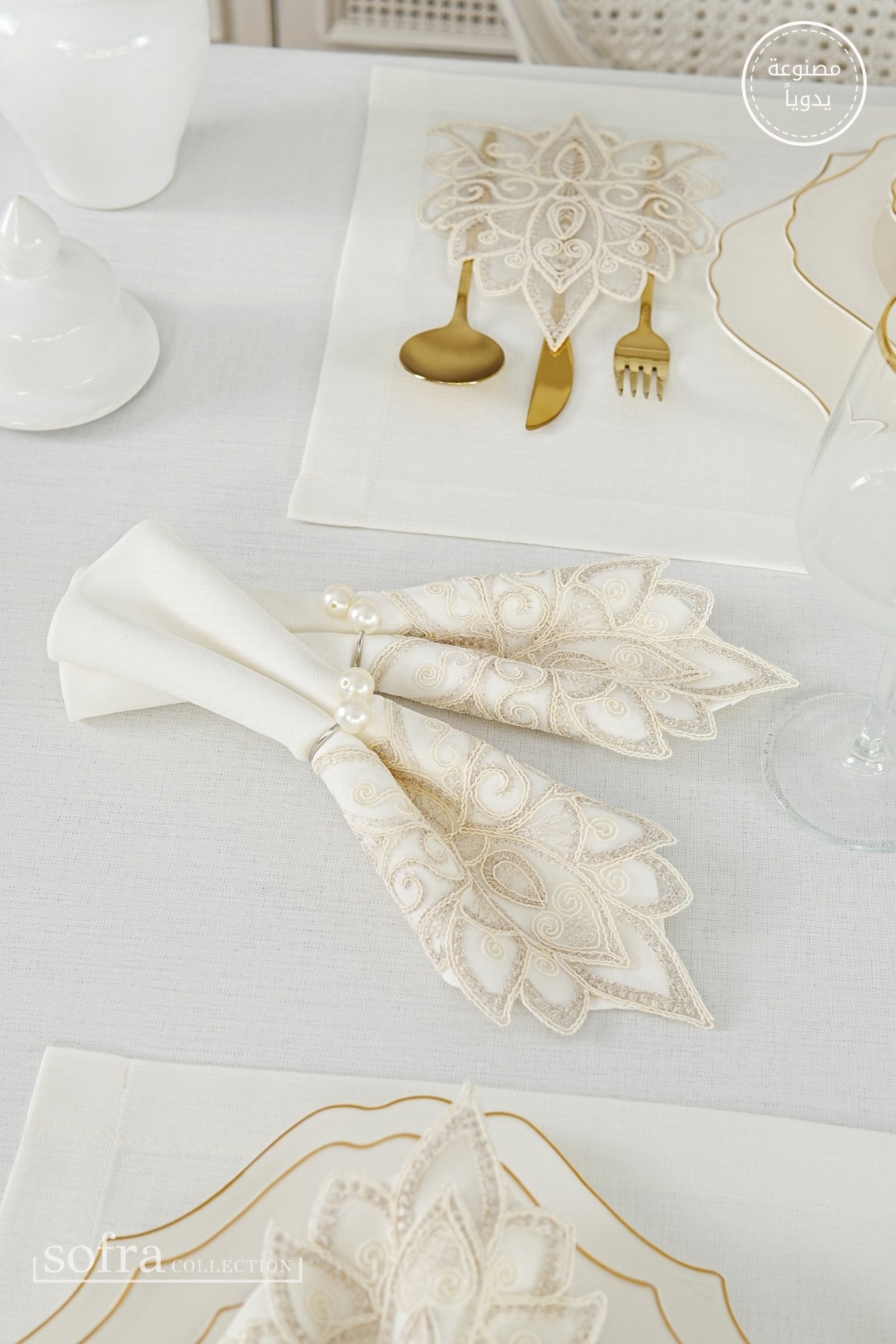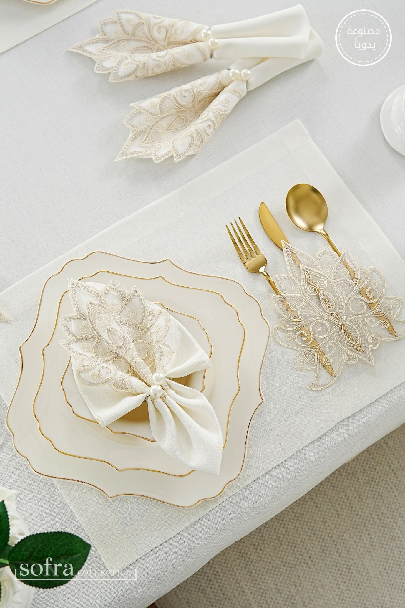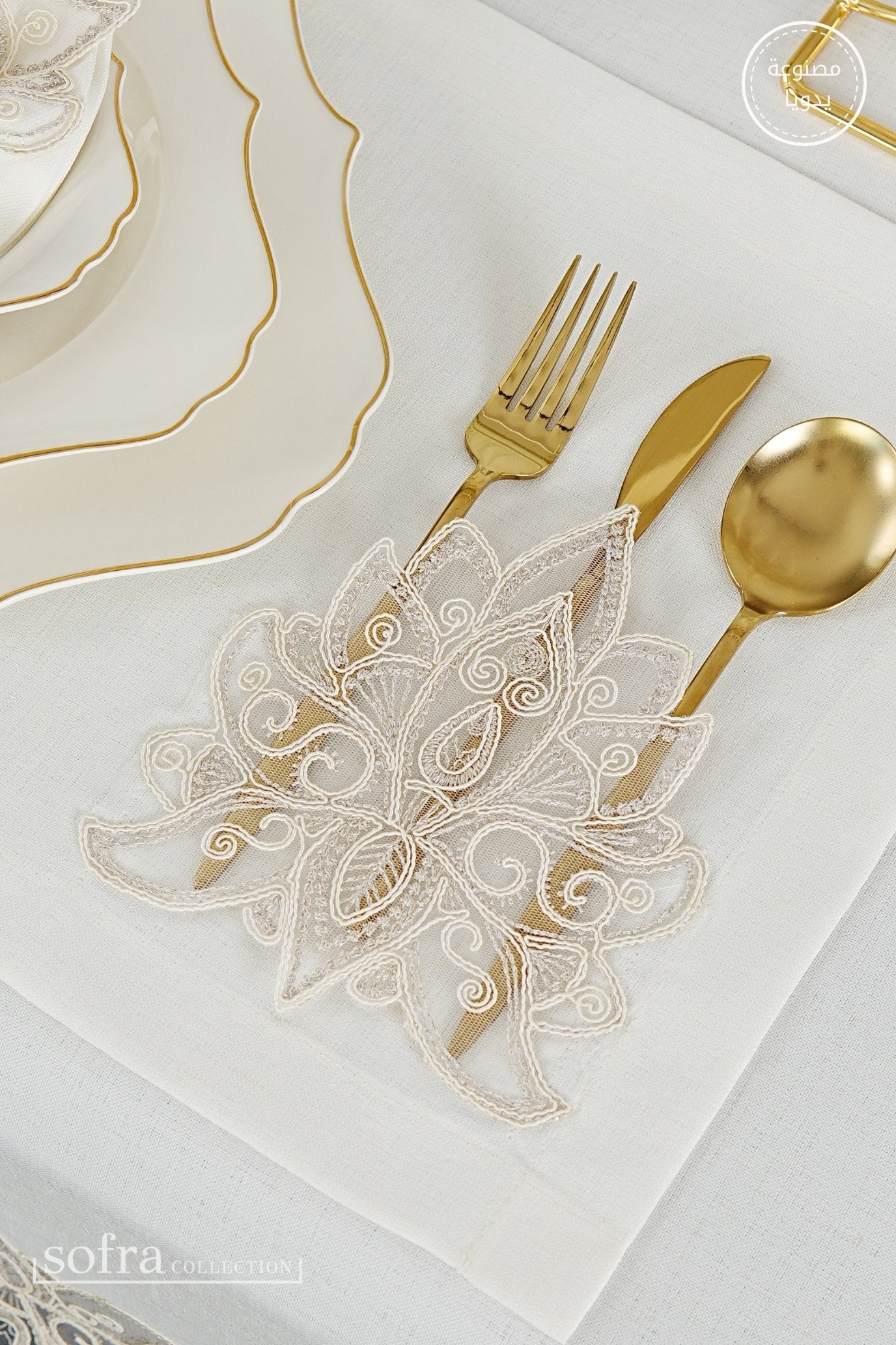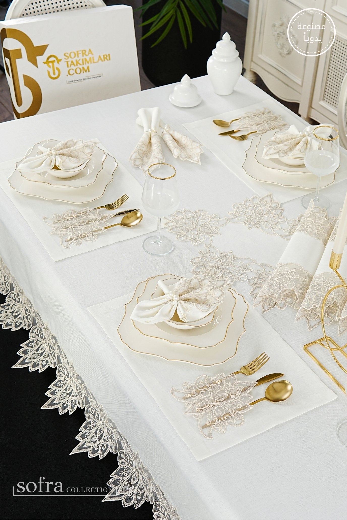 طقم مفارش سفرة كامل مزين بدانتيل ذهبى - موديل انكا – ٣٨ قطعة – ١٢ شخص - قماش كتان مقاوم للبقع