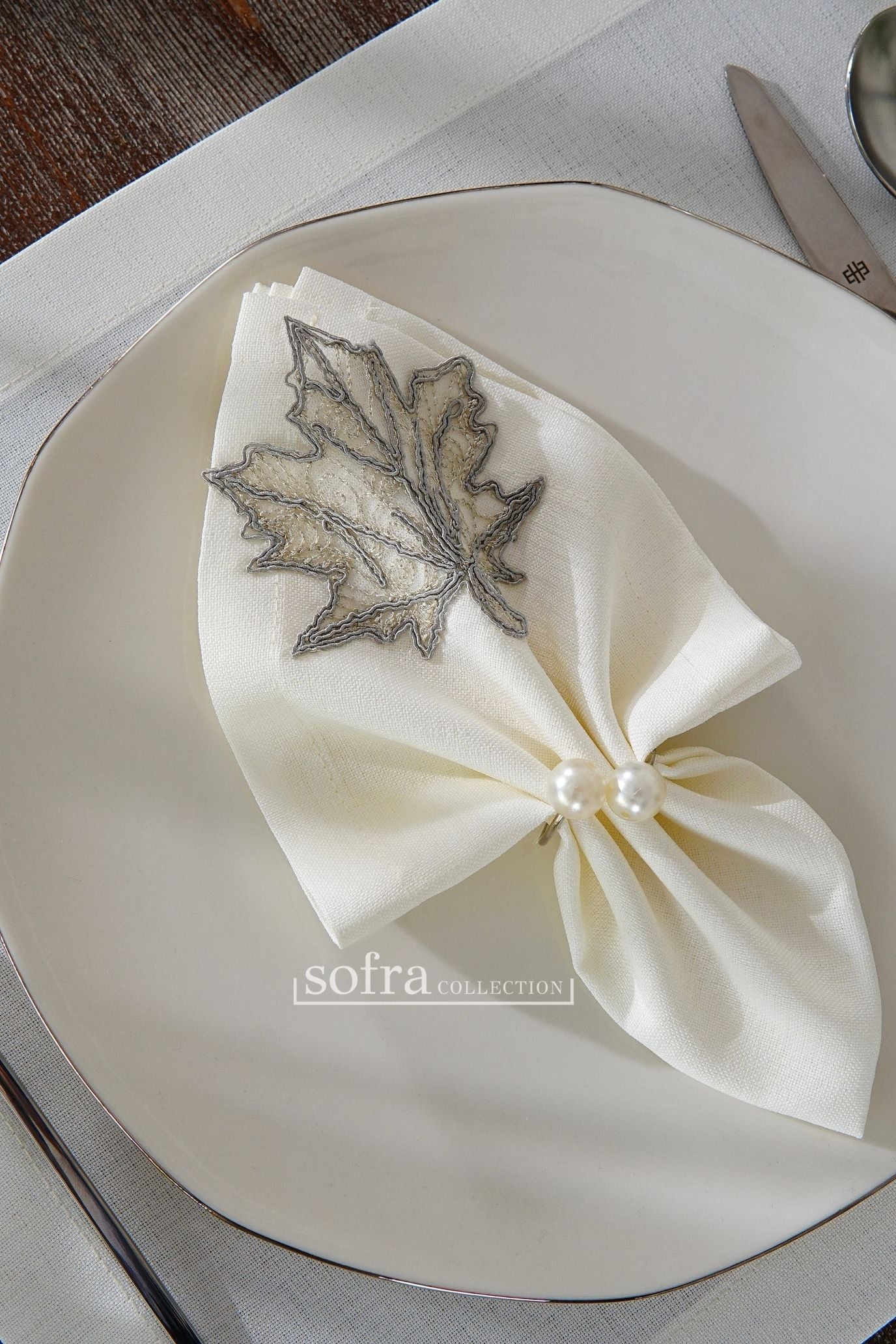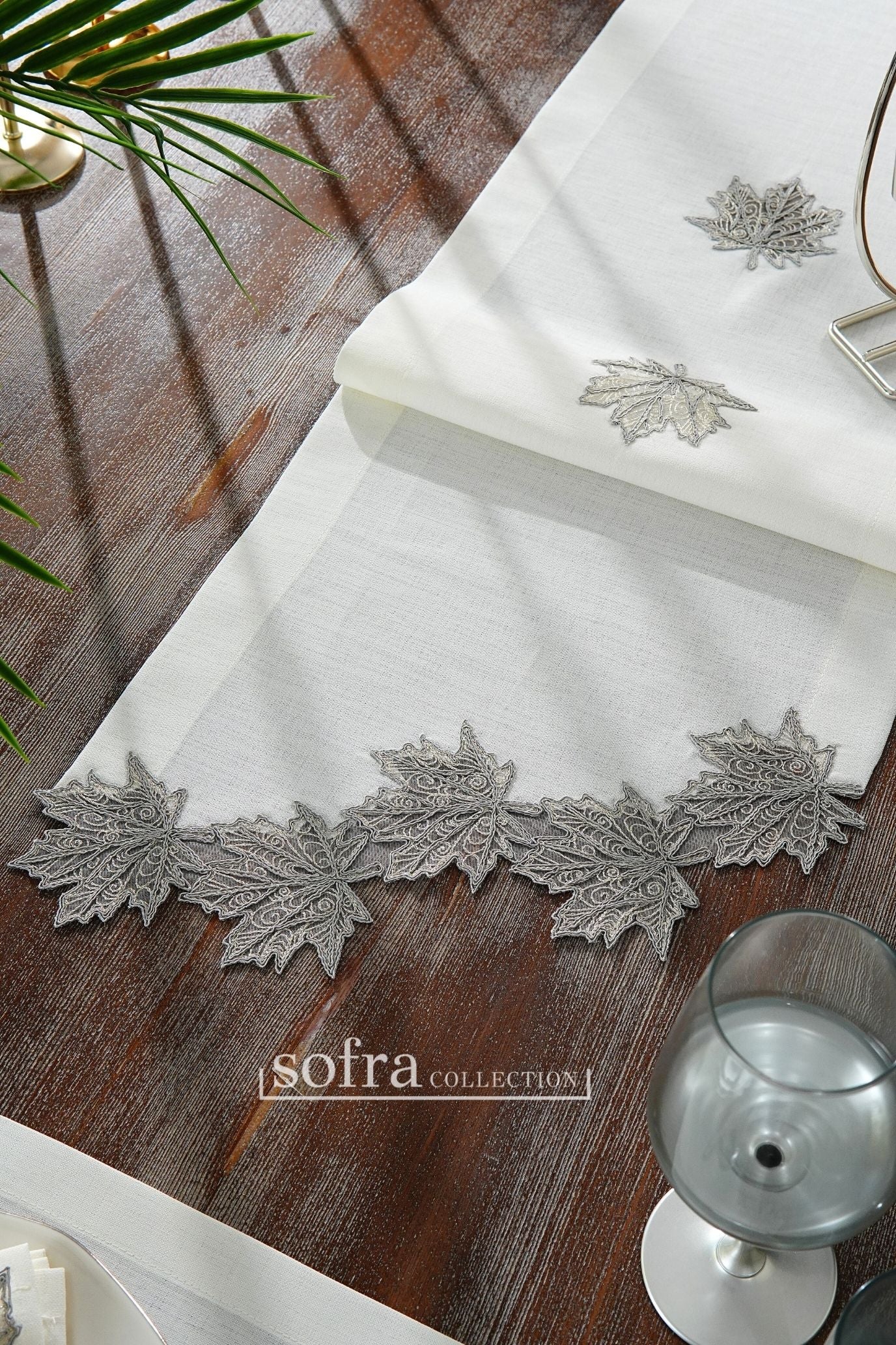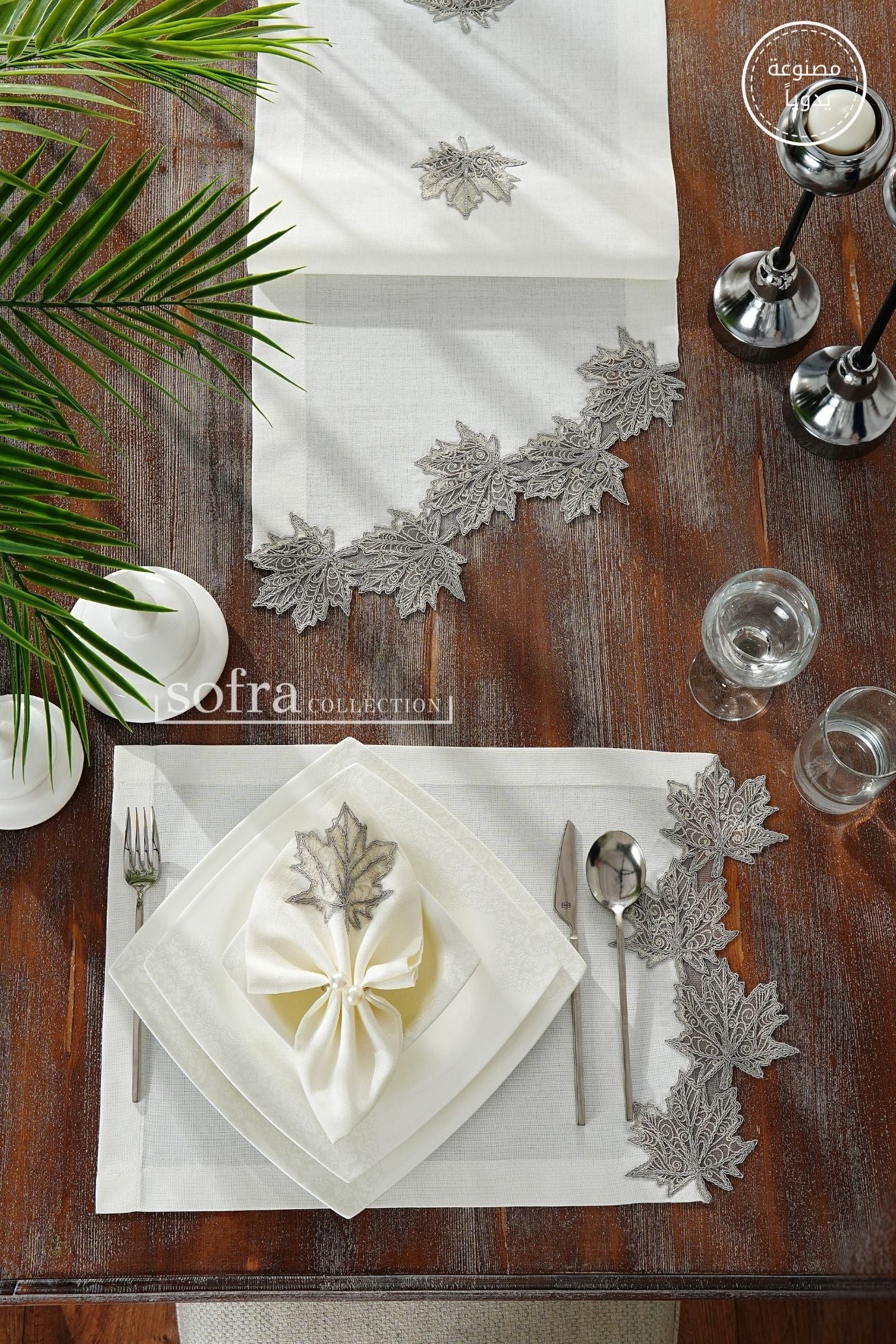 طقم مفارش سفرة مزين بدانتيل رمادى وفضى - موديل أوتمن – شامل المناديل - ٣٧ قطعة – ١٢ شخص - قماش كتان مقاوم للبقع