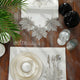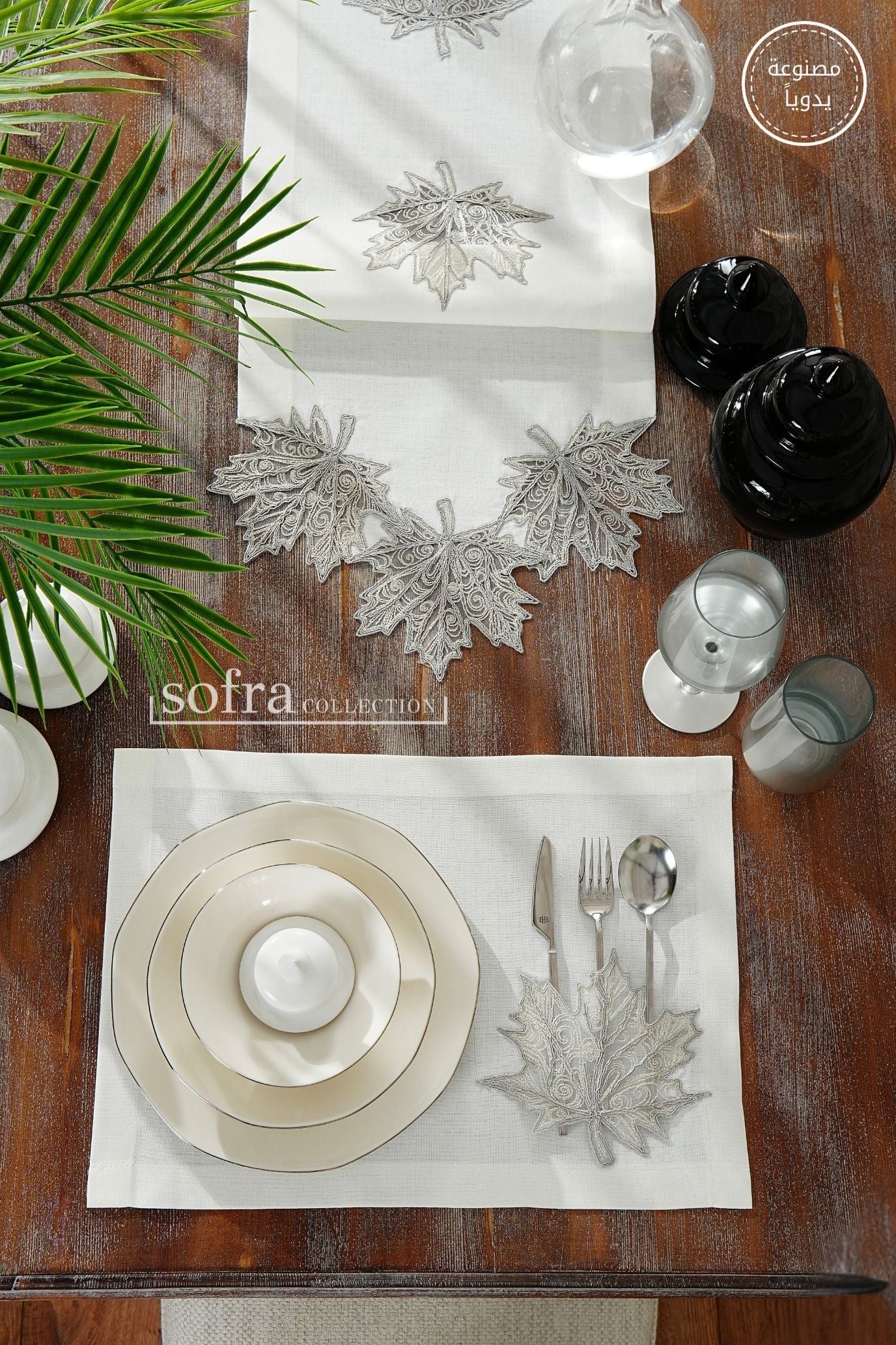 طقم مفارش سفرة مزين بدانتيل فضى ورمادى - موديل شنار – بدون مناديل - ١٣ قطعة – ١٢ شخص - قماش كتان مقاوم للبقع