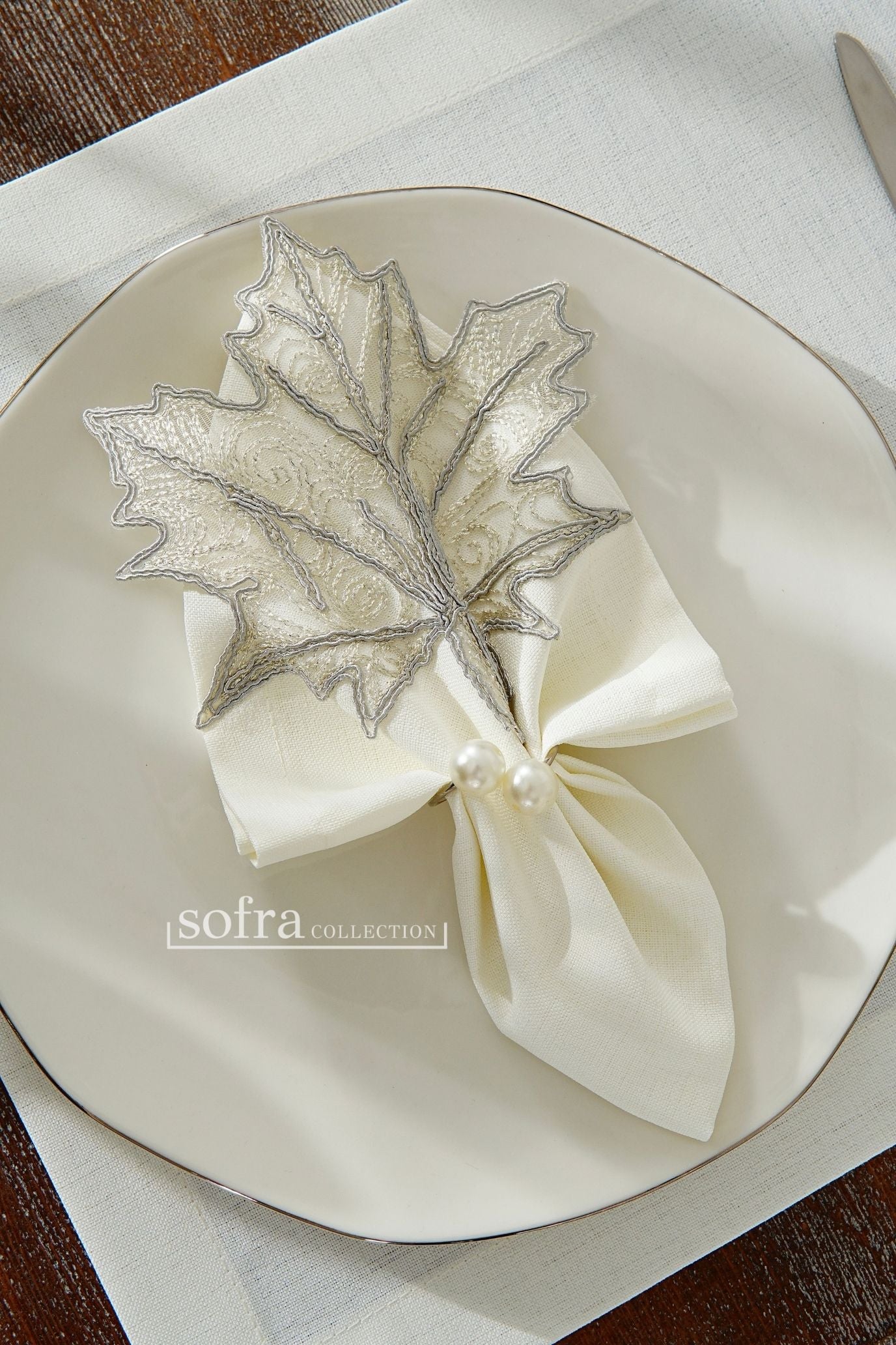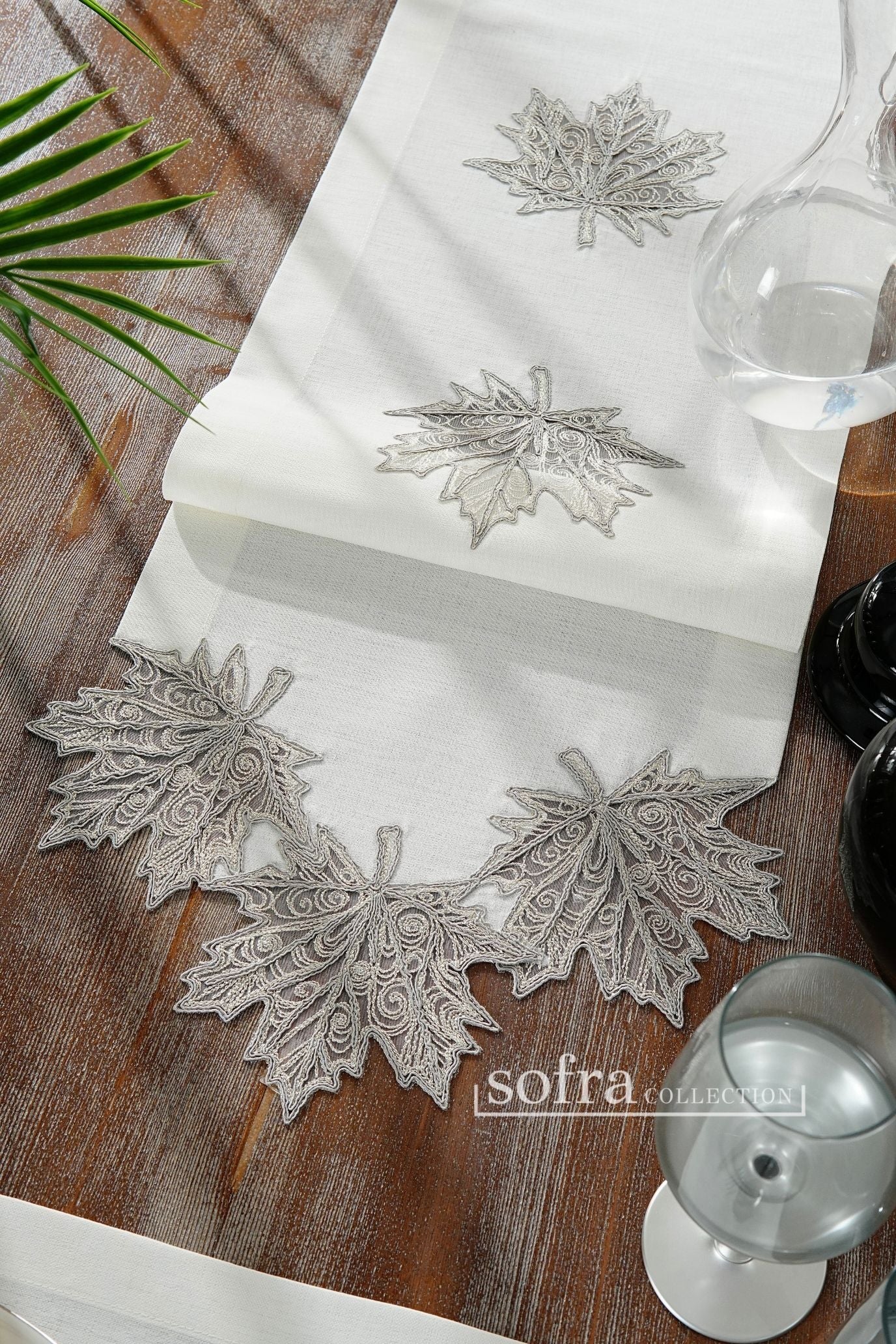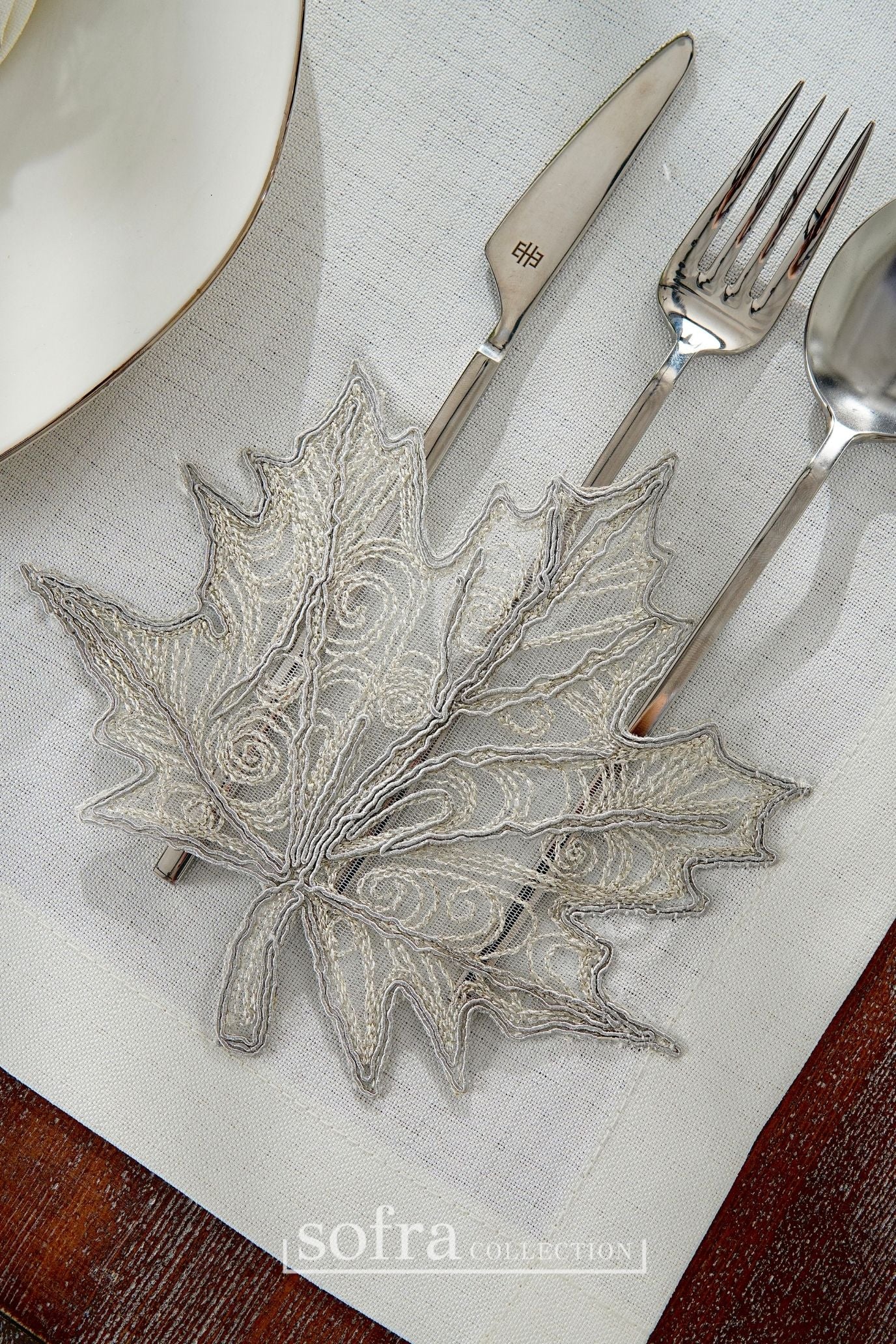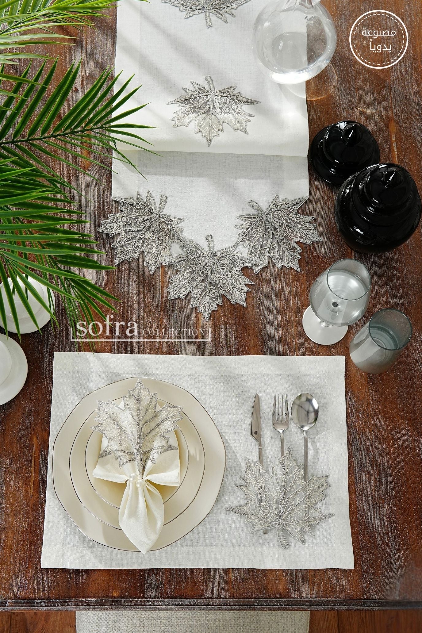 طقم مفارش سفرة مزين بدانتيل فضى ورمادى - موديل شنار – شامل المناديل - ٣٧ قطعة – ١٢ شخص - قماش كتان مقاوم للبقع