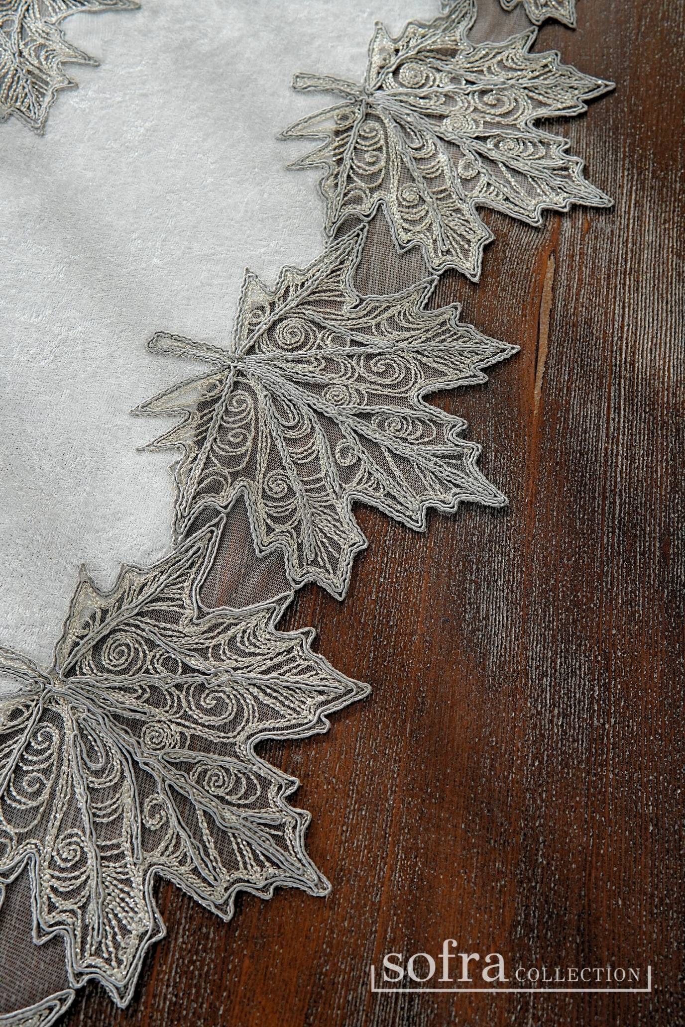 طقم مفارش صالون ٥ قطع مزين بدانتيل فضى ورمادى – موديل شنار – قماش قطيفة فاخر اوف وايت اللون