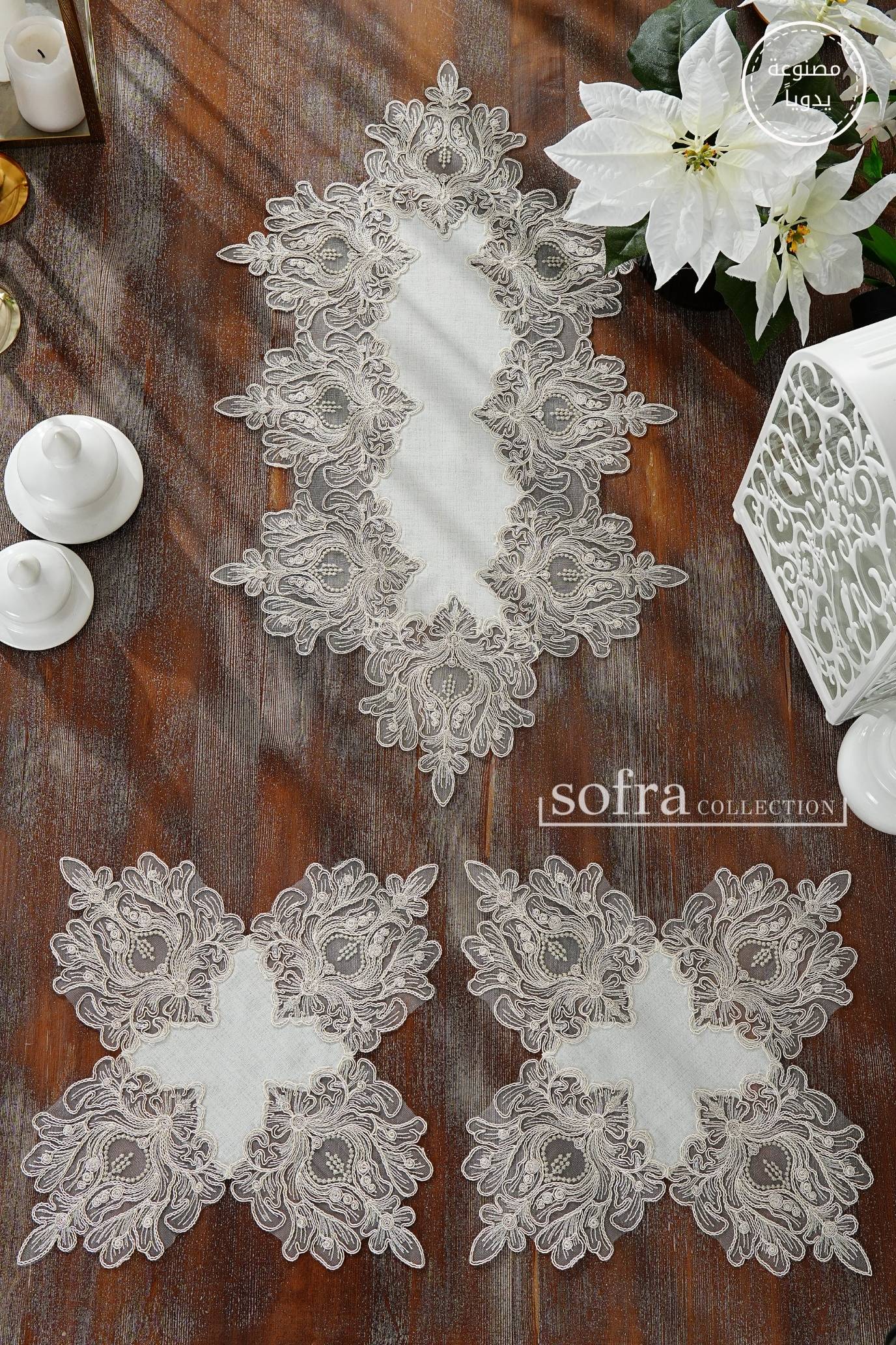 طقم مفارش ٣ قطع مزين بدانتيل فضى واوف وايت – موديل ورق الغار - قماش كتان فاخر مقاوم للبقع