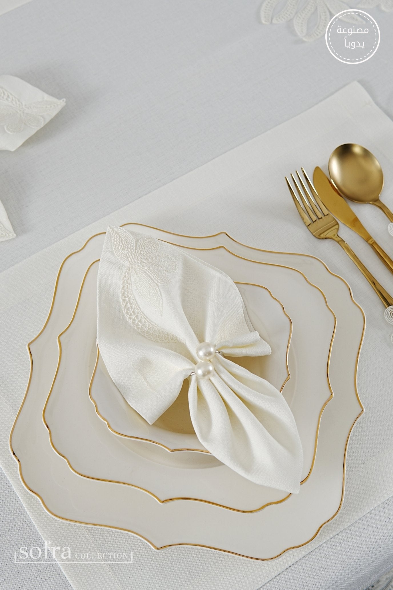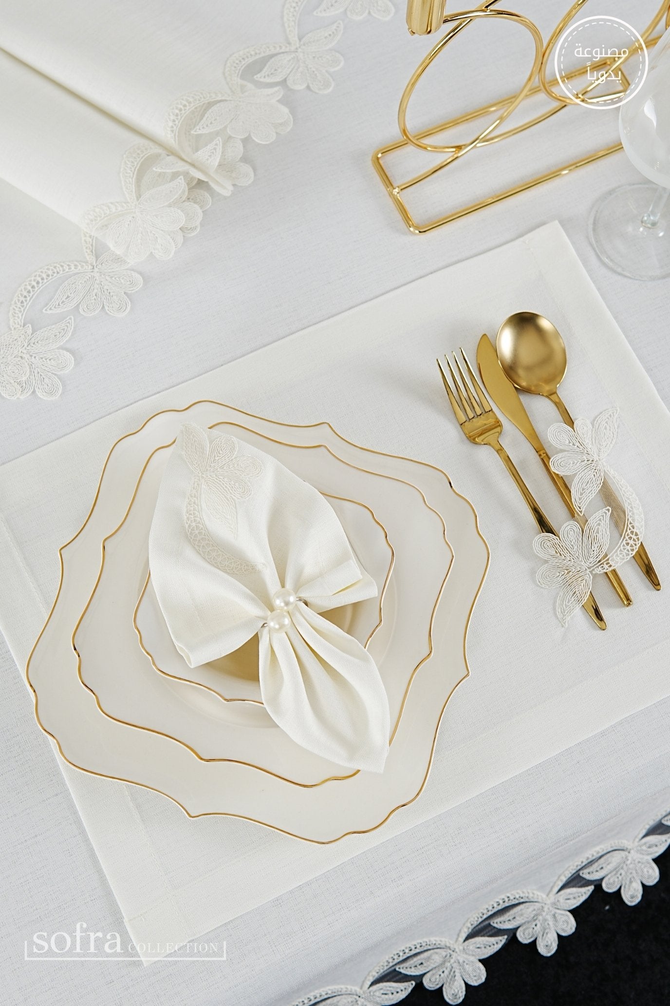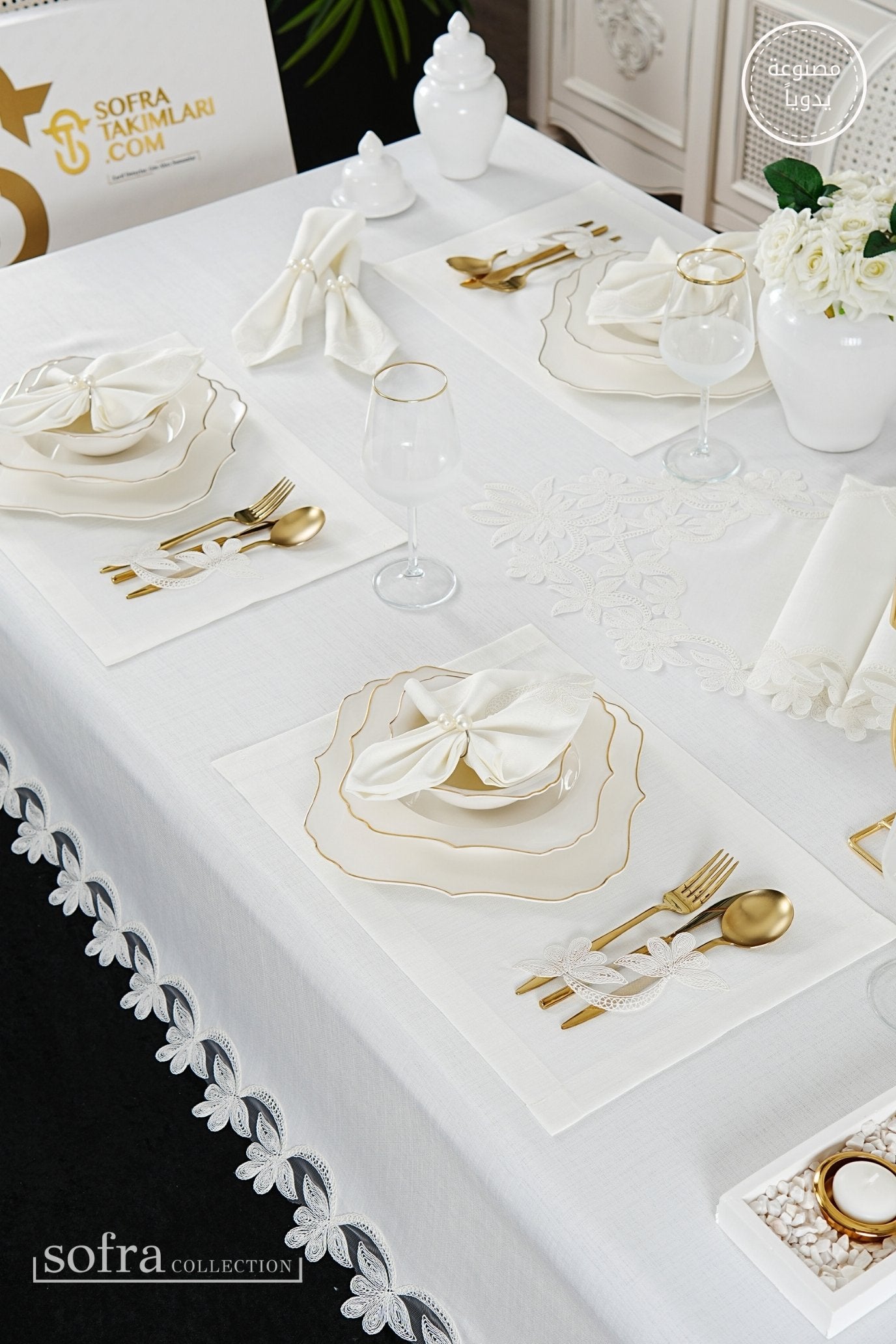 طقم مفارش سفرة كامل مزين بدانتيل اوف وايت - موديل دينا – ٣٨ قطعة – ١٢ شخص - قماش كتان مقاوم للبقع