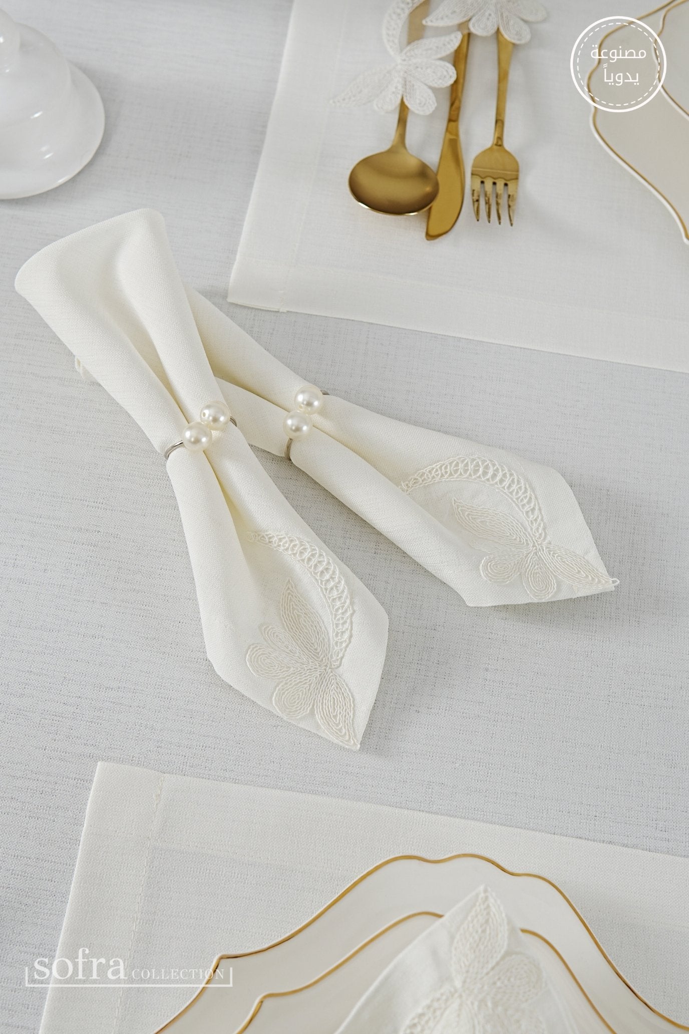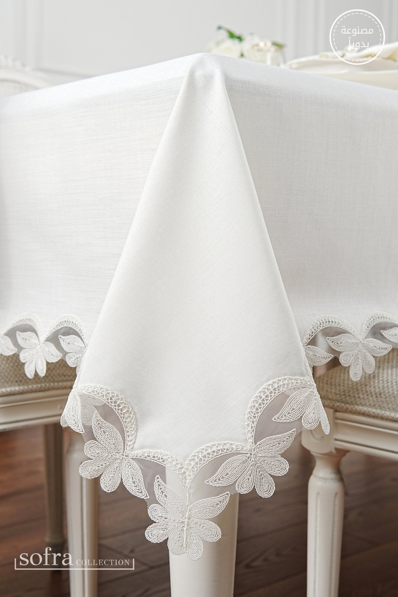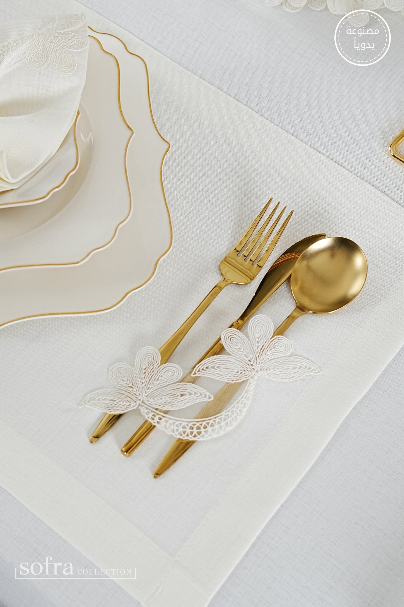 طقم مفارش سفرة كامل مزين بدانتيل اوف وايت - موديل دينا – ٣٨ قطعة – ١٢ شخص - قماش كتان مقاوم للبقع