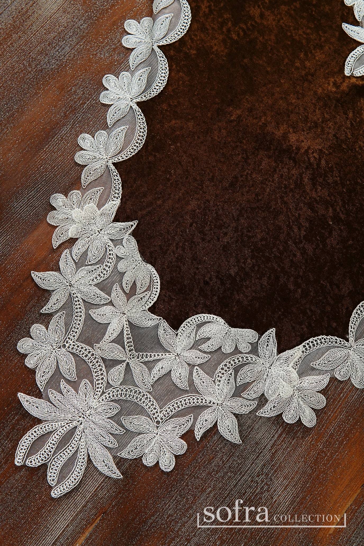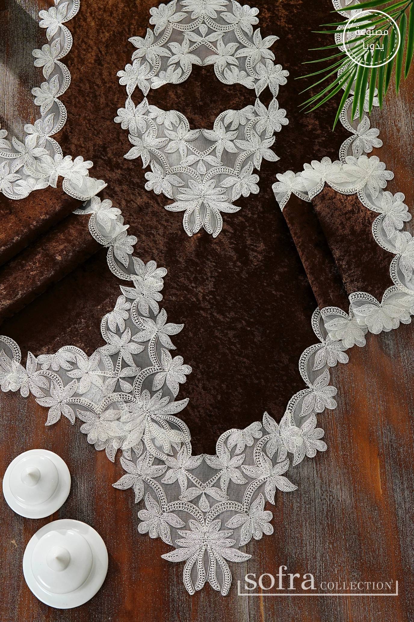 طقم مفارش صالون ٥ قطع مزين بدانتيل اوف وايت – موديل دينا – قماش قطيفة فاخر بنى اللون
