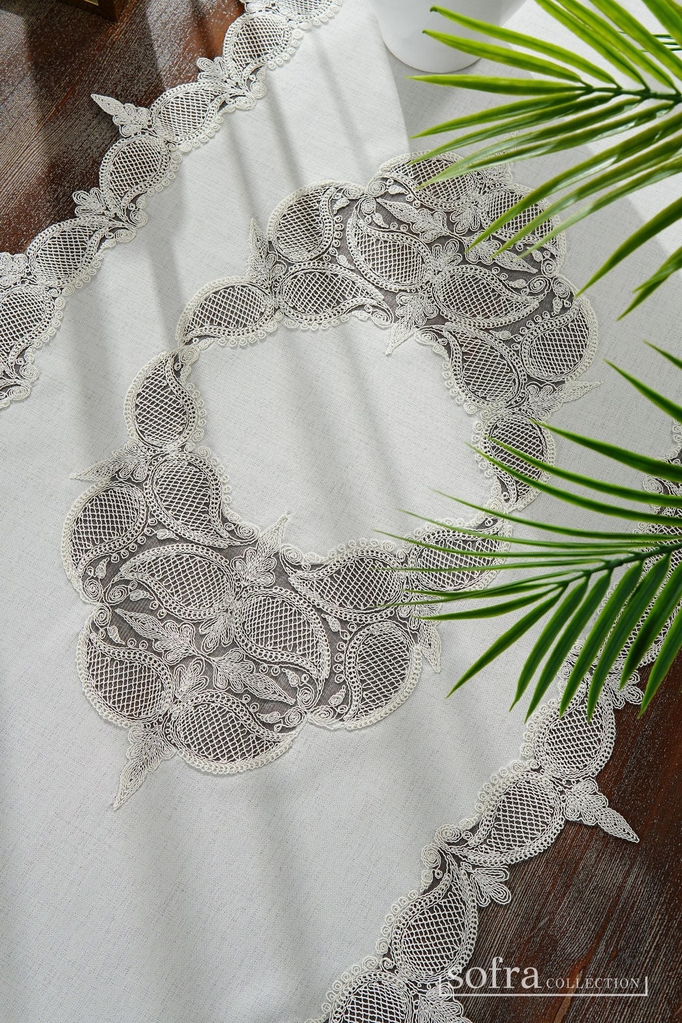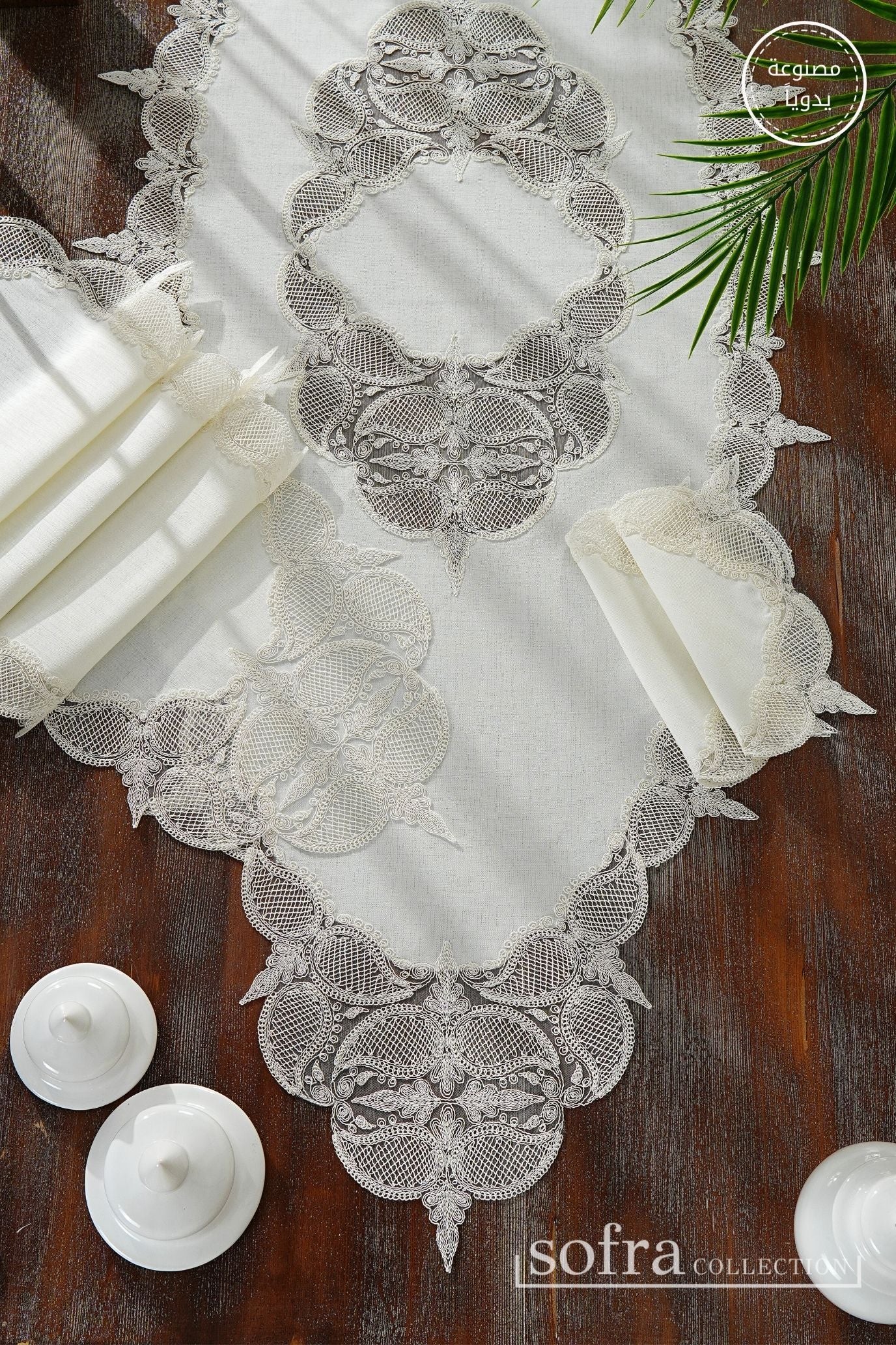 طقم مفارش صالون ٥ قطع مزين بدانتيل اوف وايت – موديل إيلا - قماش كتان فاخر مقاوم للبقع