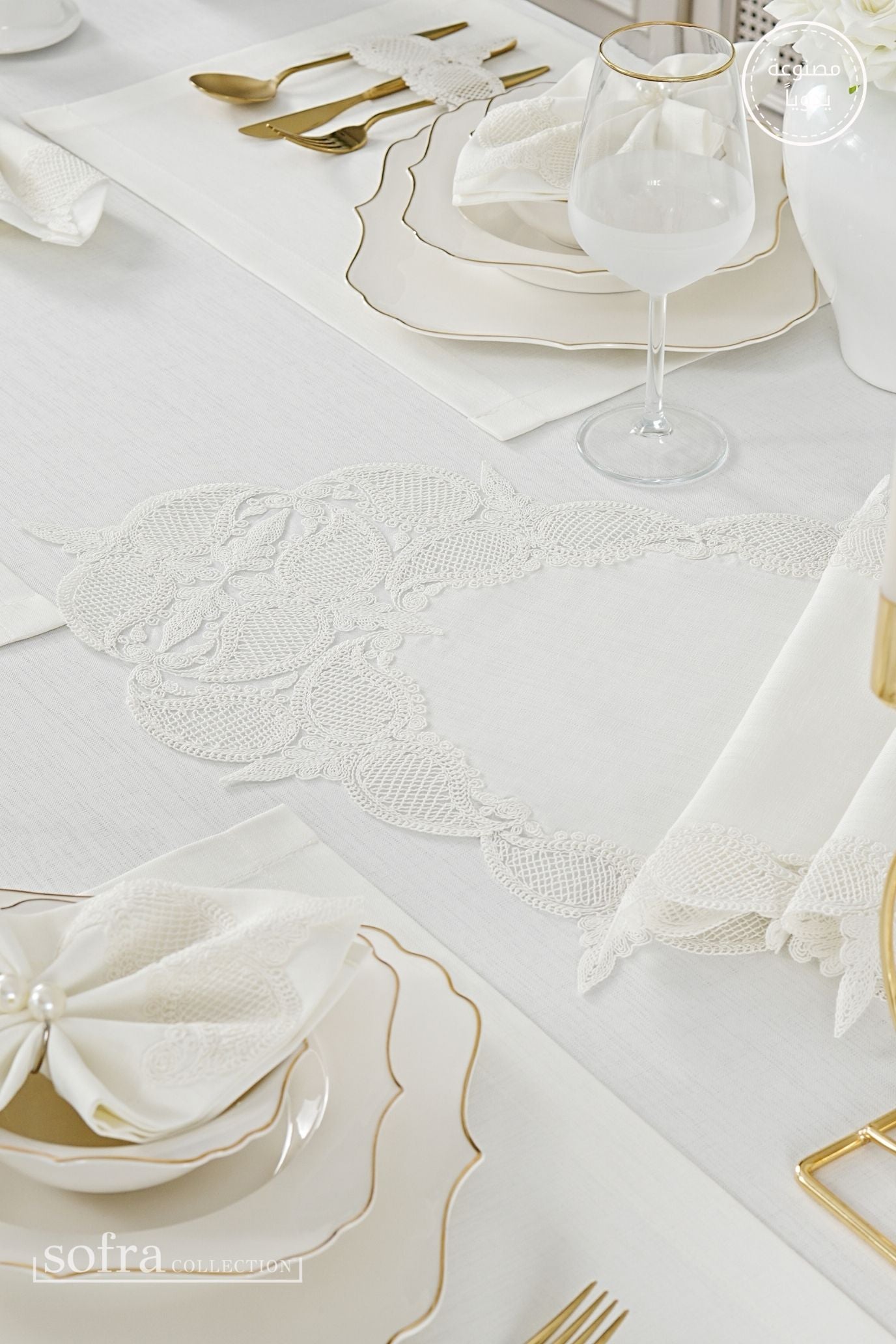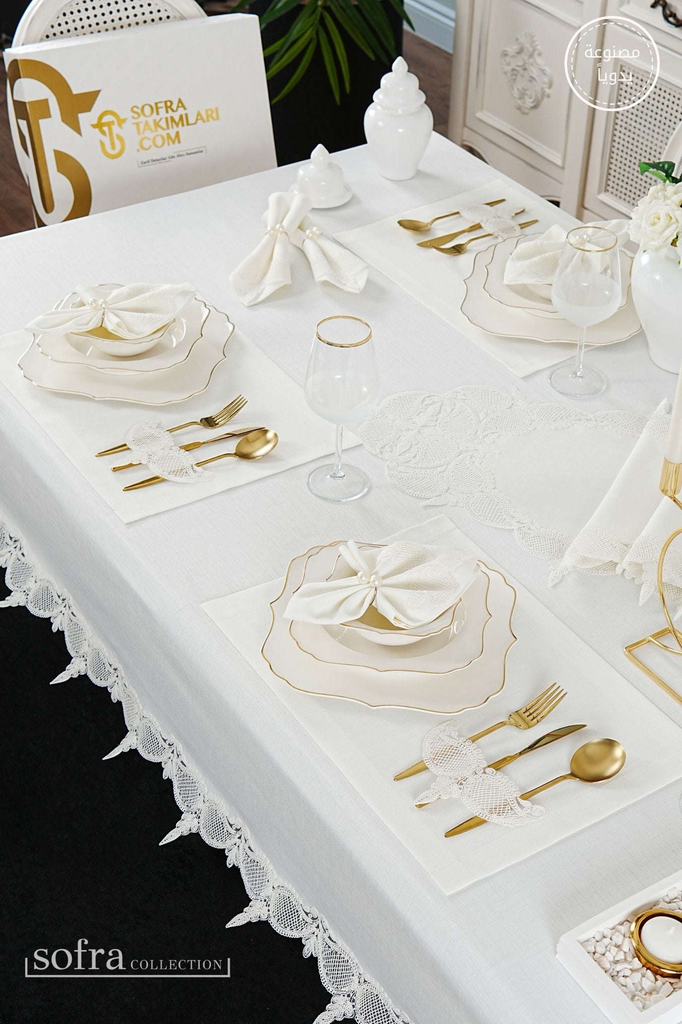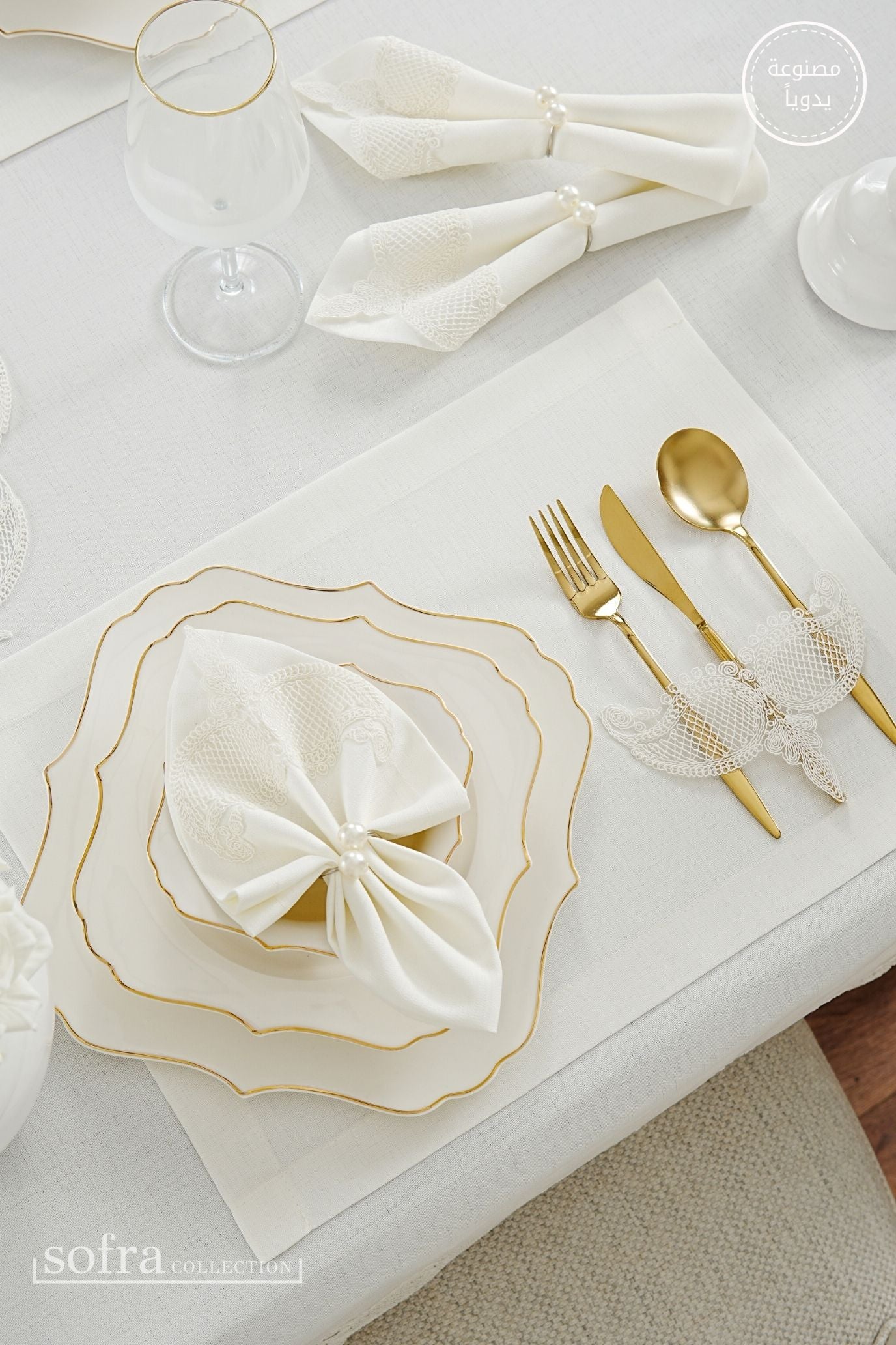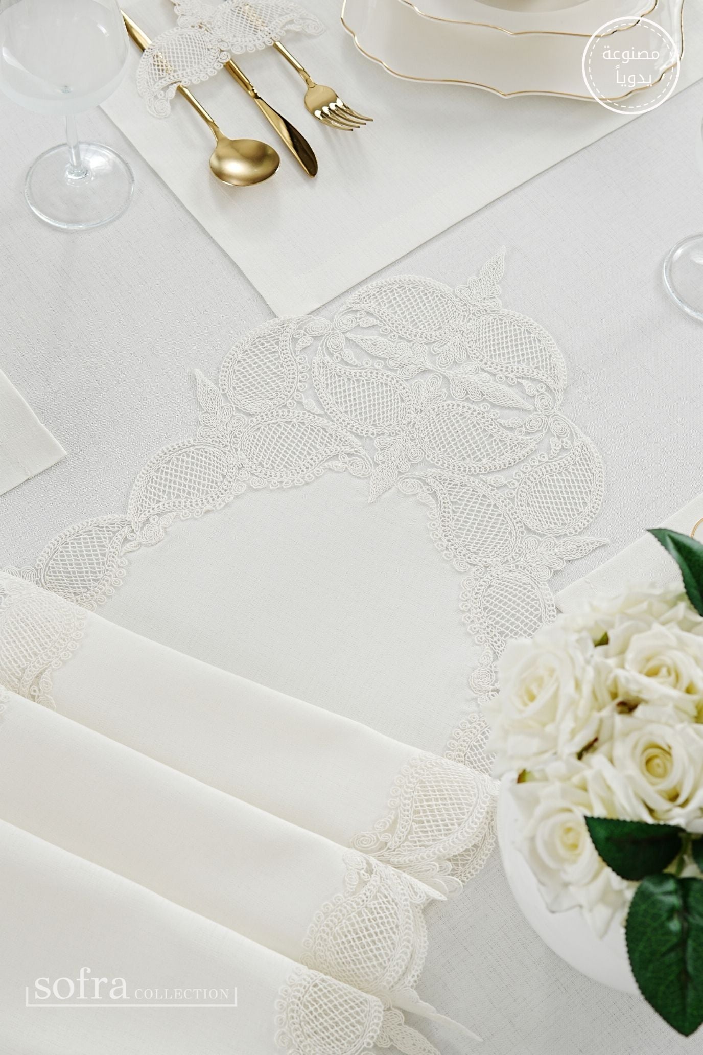 طقم مفارش سفرة كامل مزين بدانتيل اوف وايت - موديل ايلا – ٣٨ قطعة – ١٢ شخص - قماش كتان مقاوم للبقع