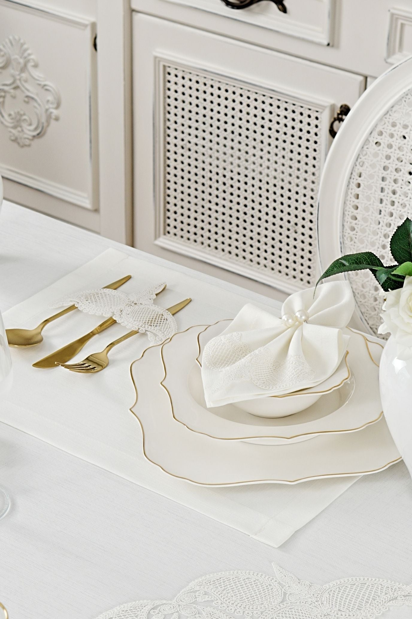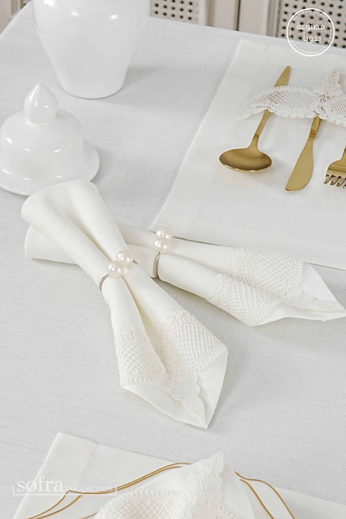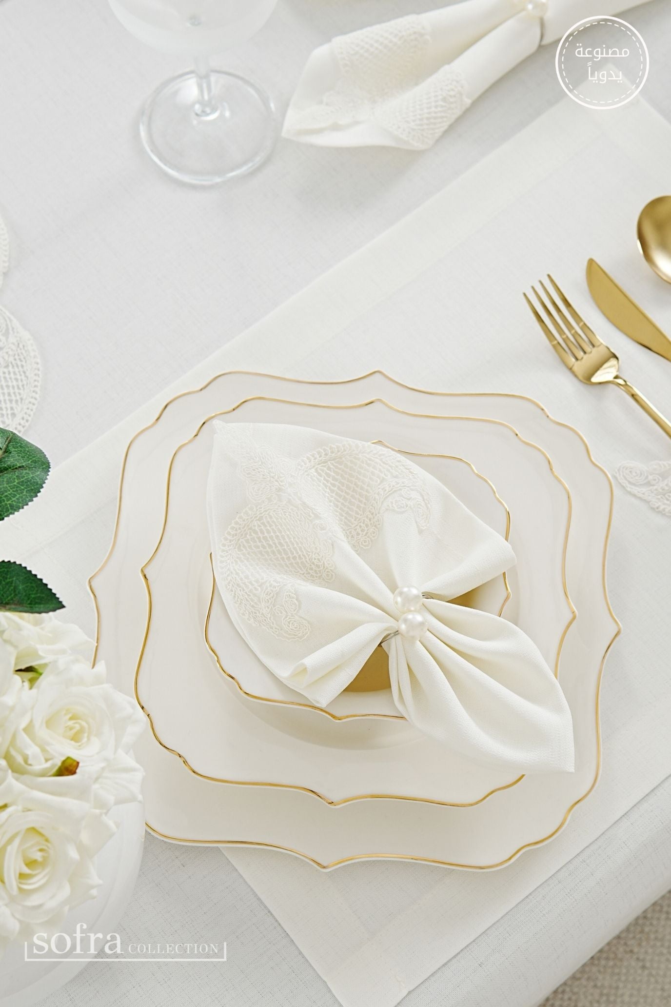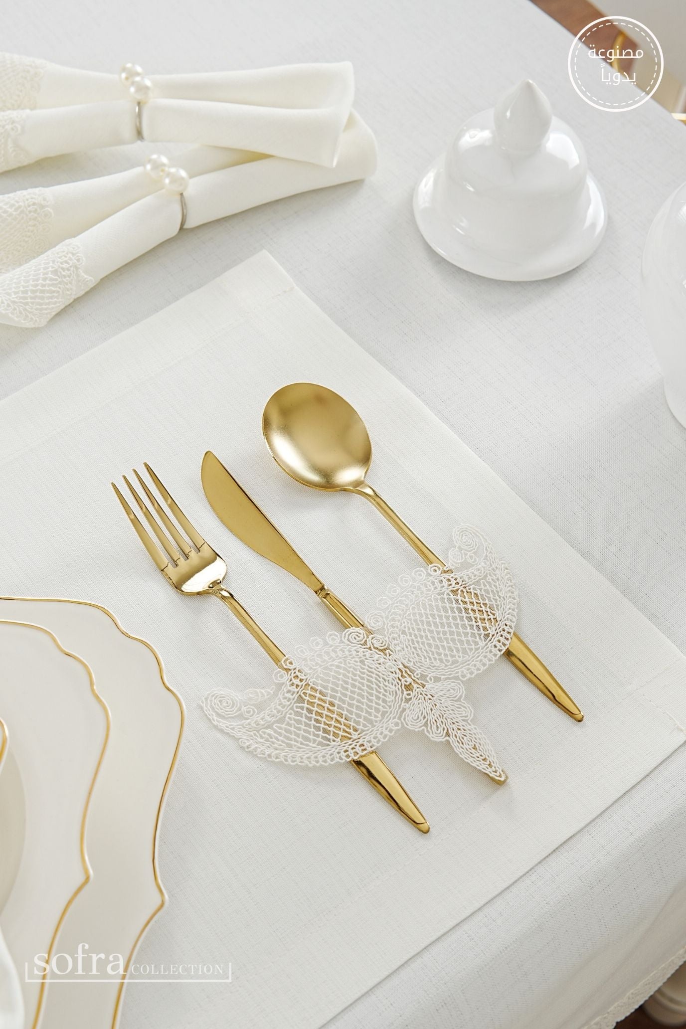 طقم مفارش سفرة كامل مزين بدانتيل اوف وايت - موديل ايلا – ٣٨ قطعة – ١٢ شخص - قماش كتان مقاوم للبقع