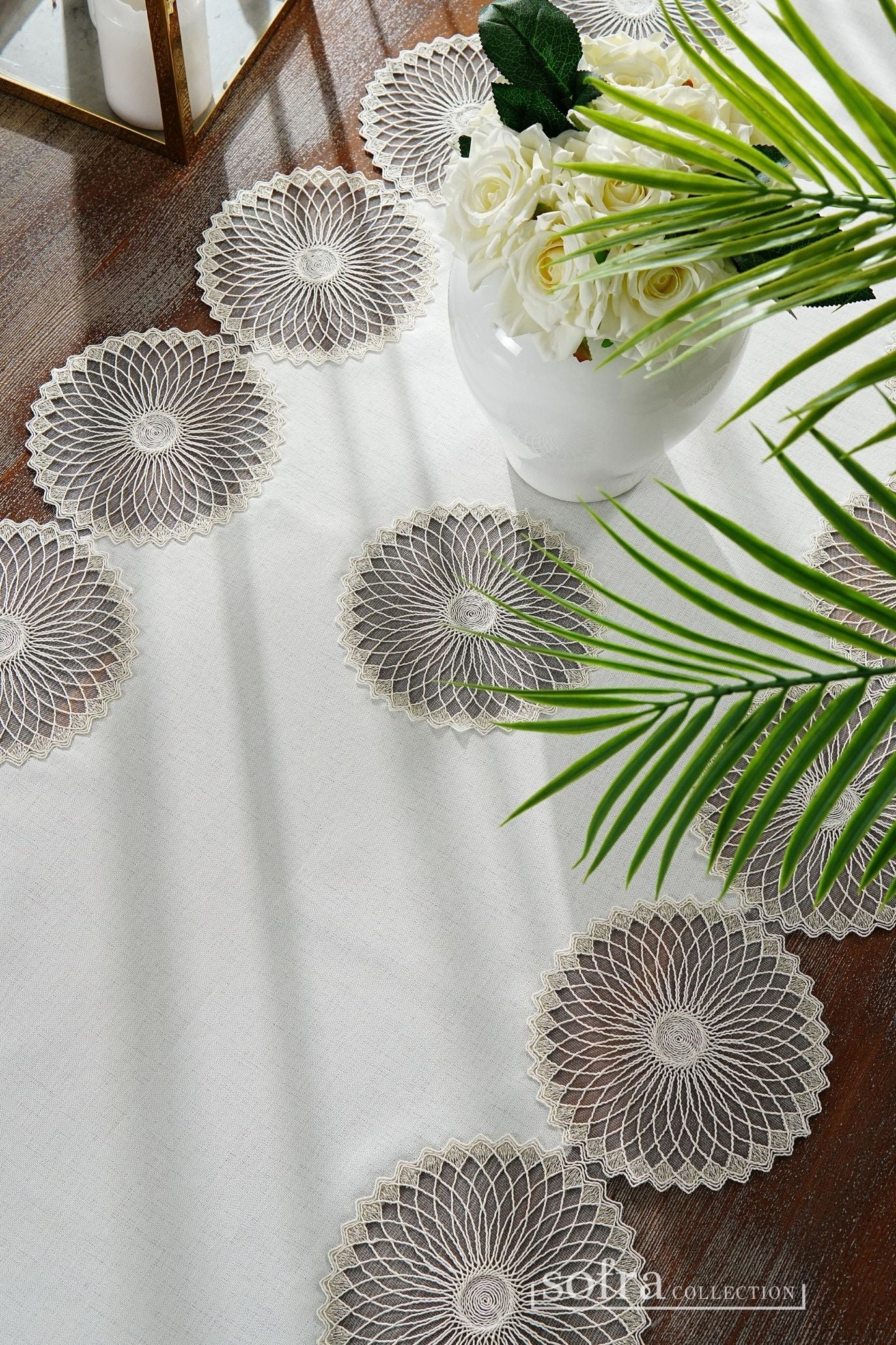 طقم مفارش صالون ٥ قطع مزين بدانتيل فضى واوف وايت – موديل ايفا - قماش كتان فاخر مقاوم للبقع