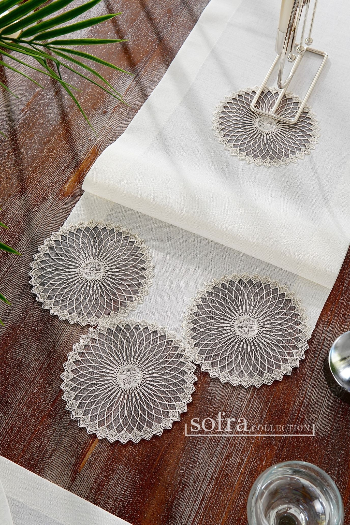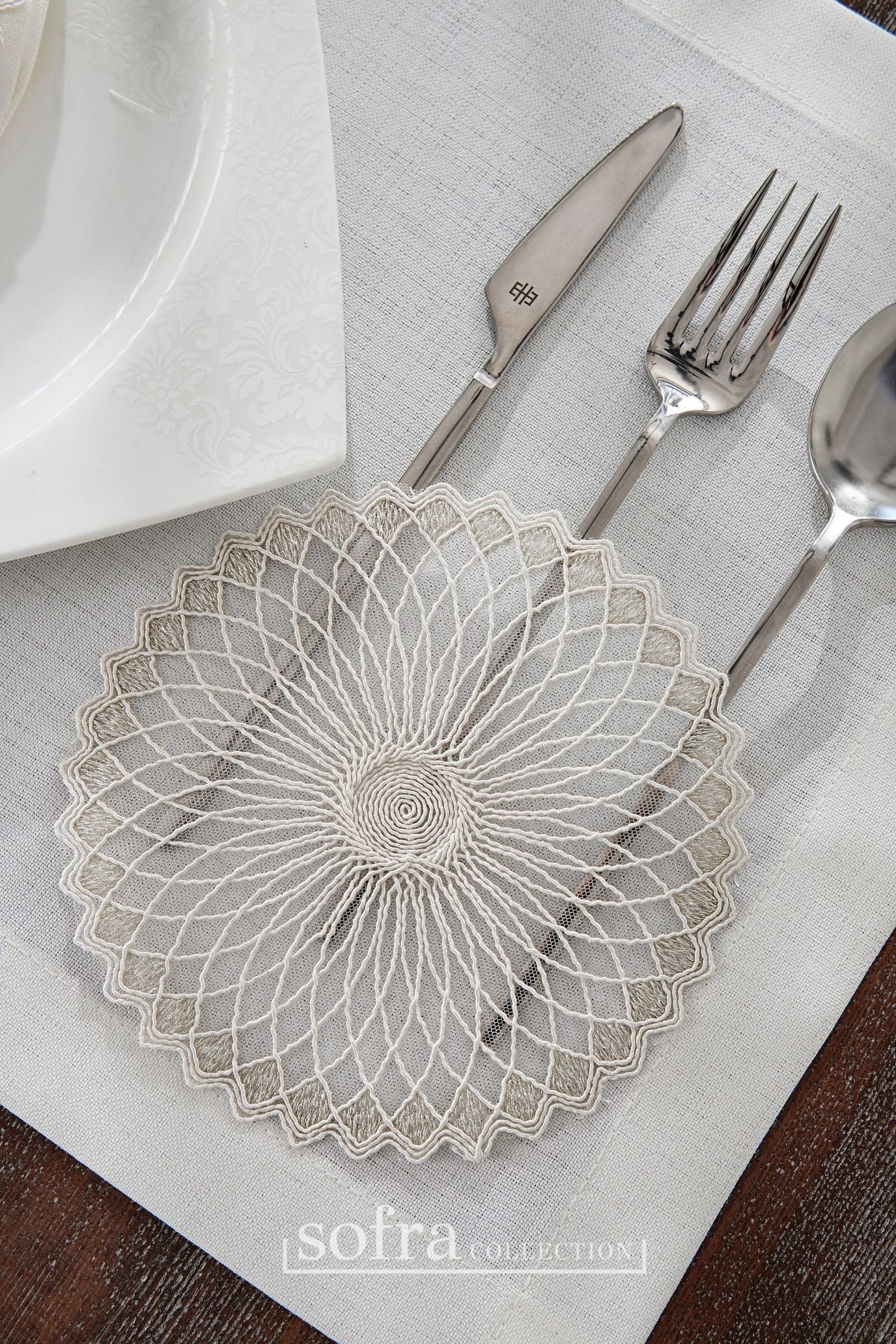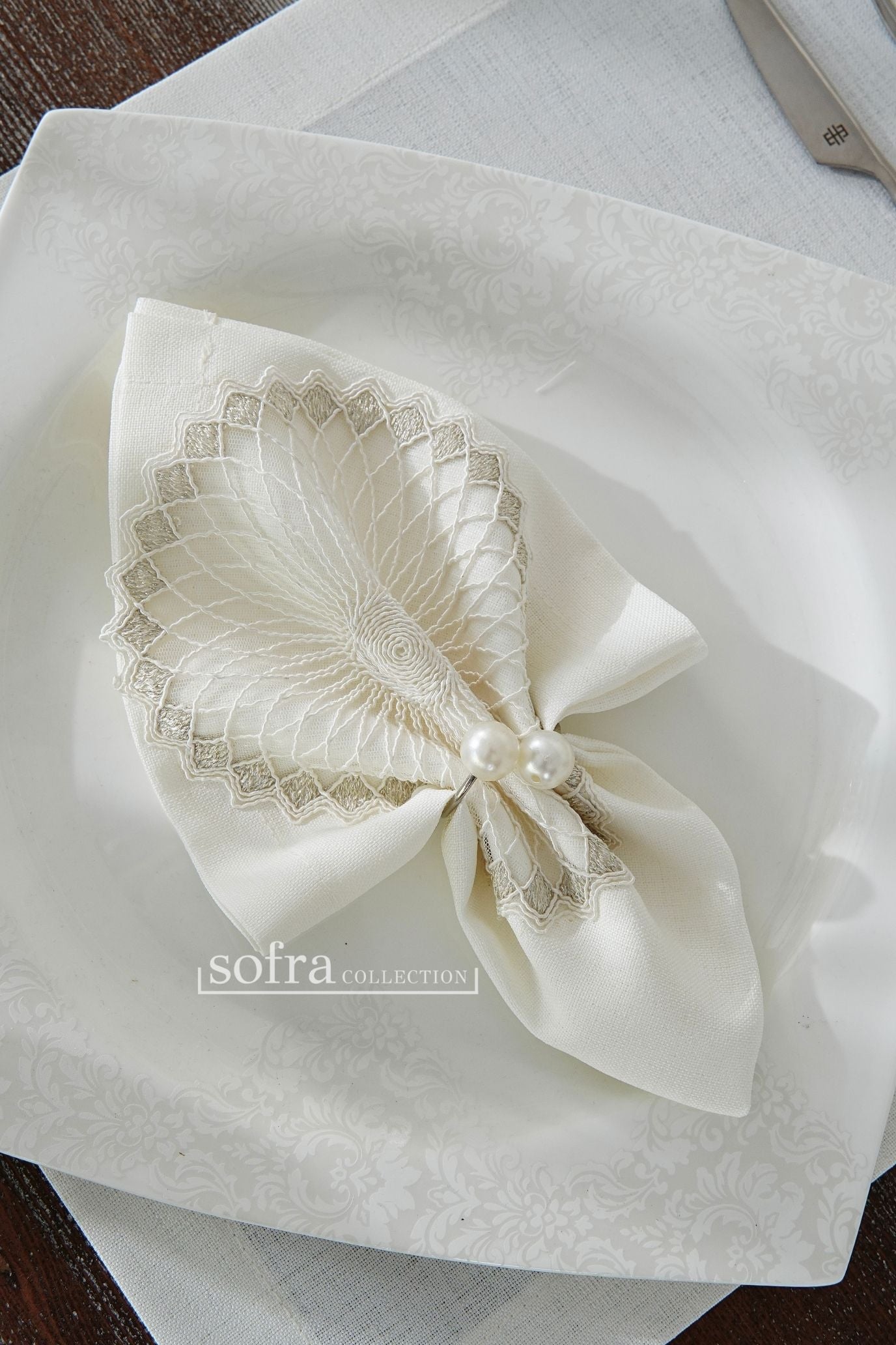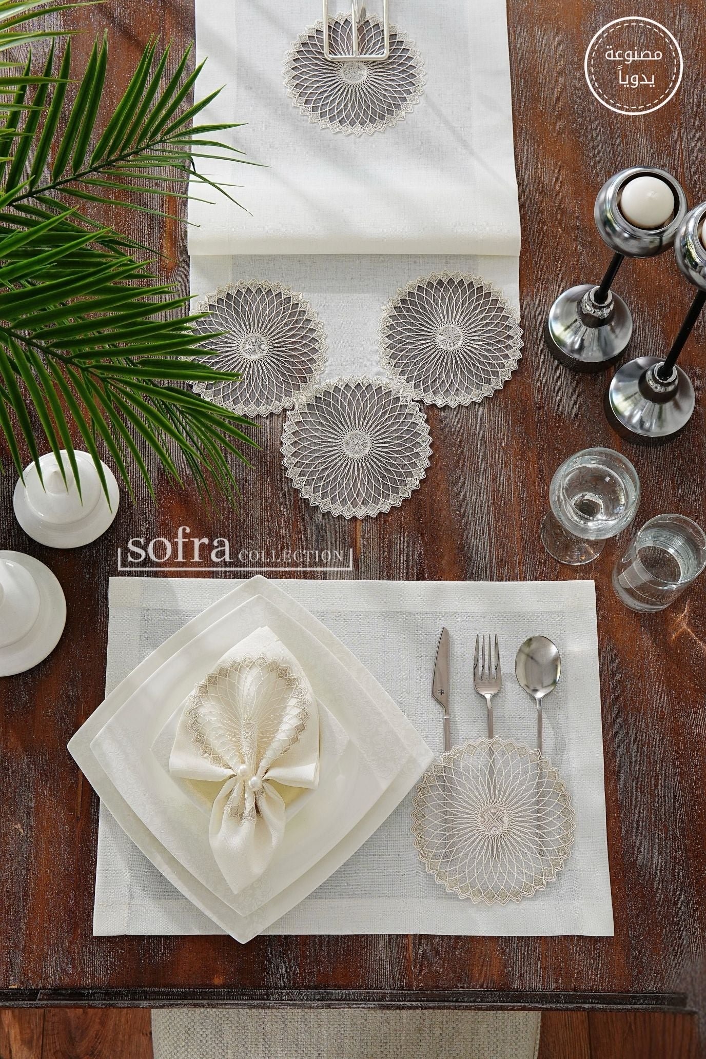 طقم مفارش سفرة مزين بدانتيل فضى واوف وايت - موديل ايفا – شامل المناديل - ٣٧ قطعة – ١٢ شخص - قماش كتان مقاوم للبقع