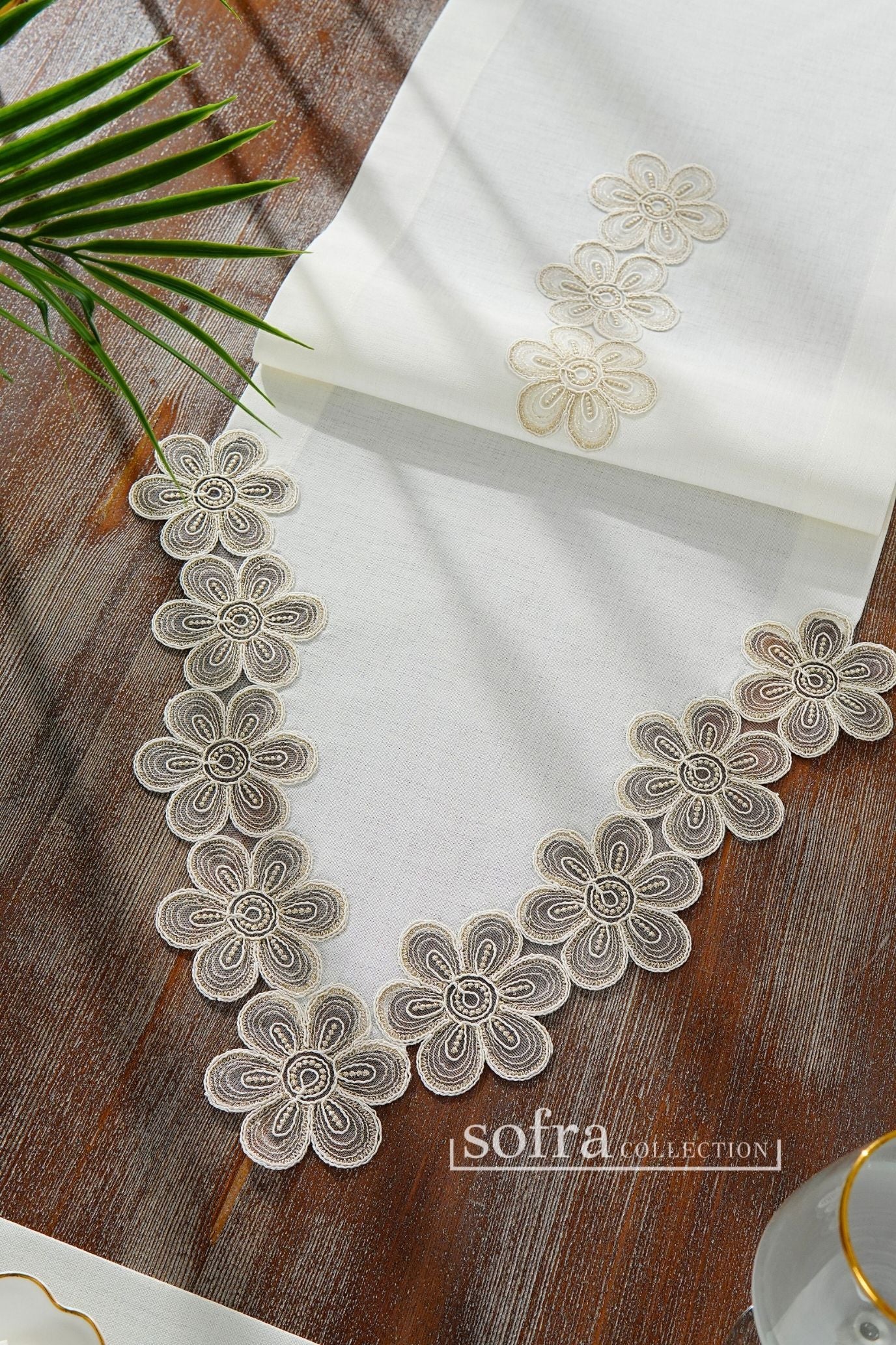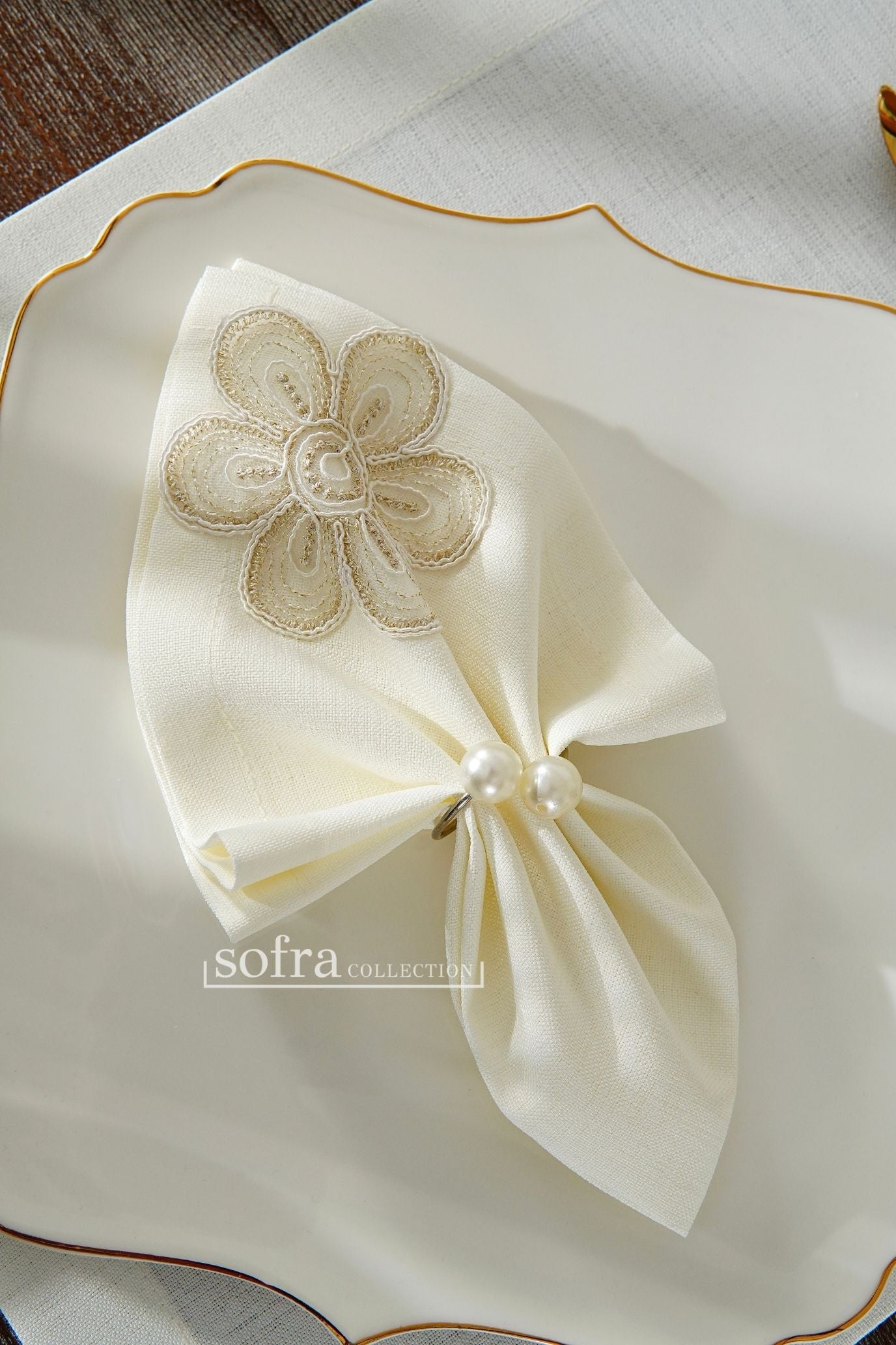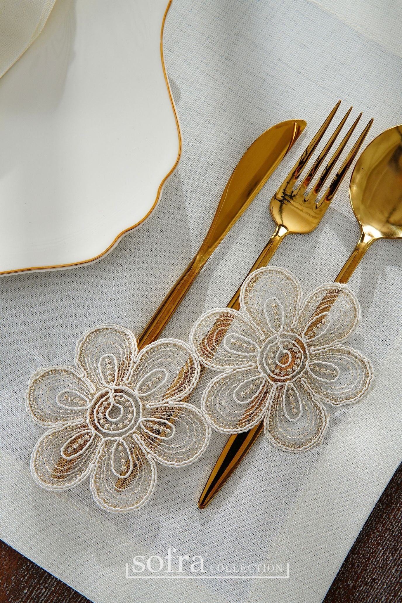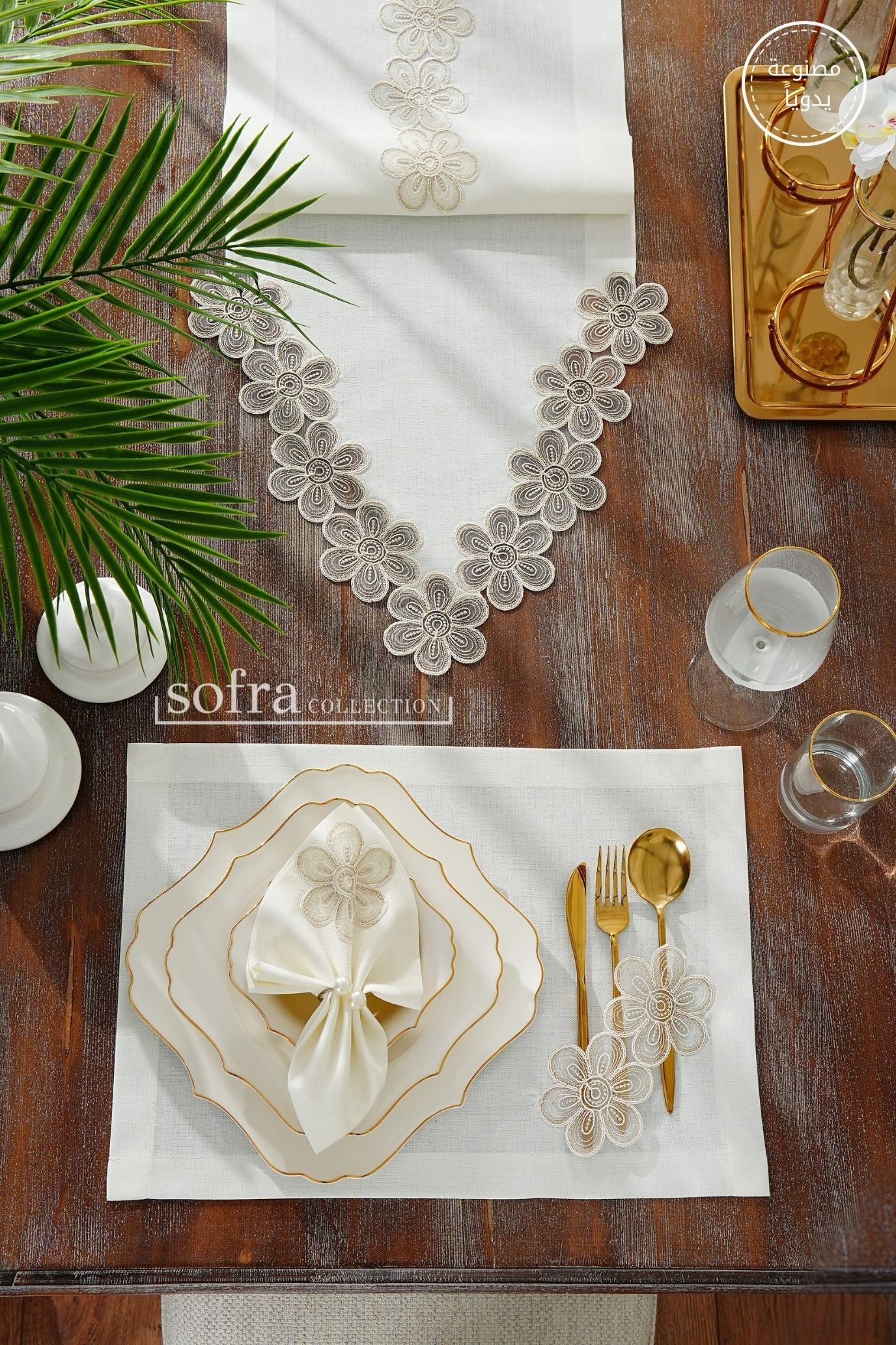 طقم مفارش سفرة مزين بدانتيل ذهبى - موديل فونيا – شامل المناديل - ٣٧ قطعة – ١٢ شخص - قماش كتان مقاوم للبقع