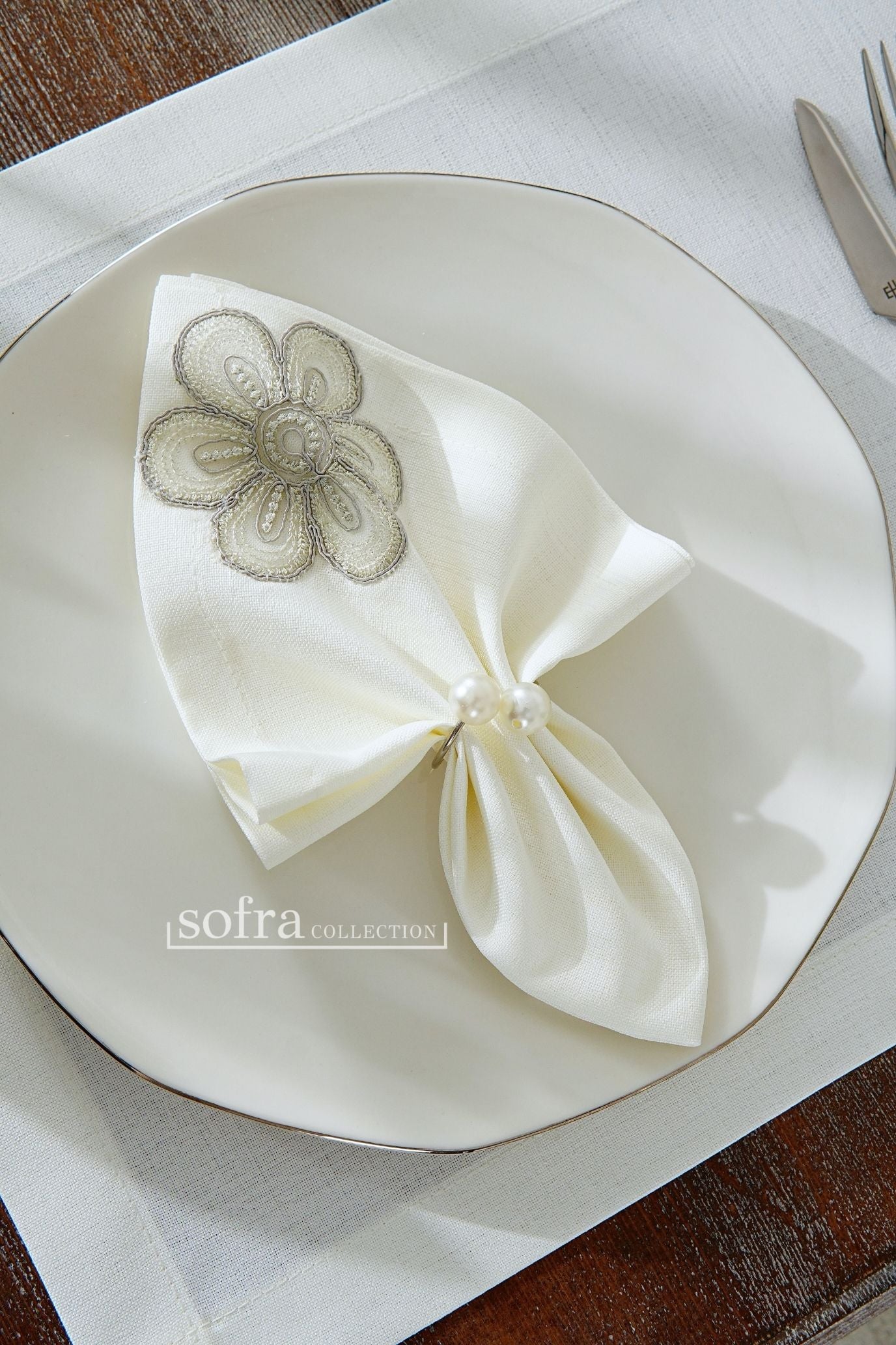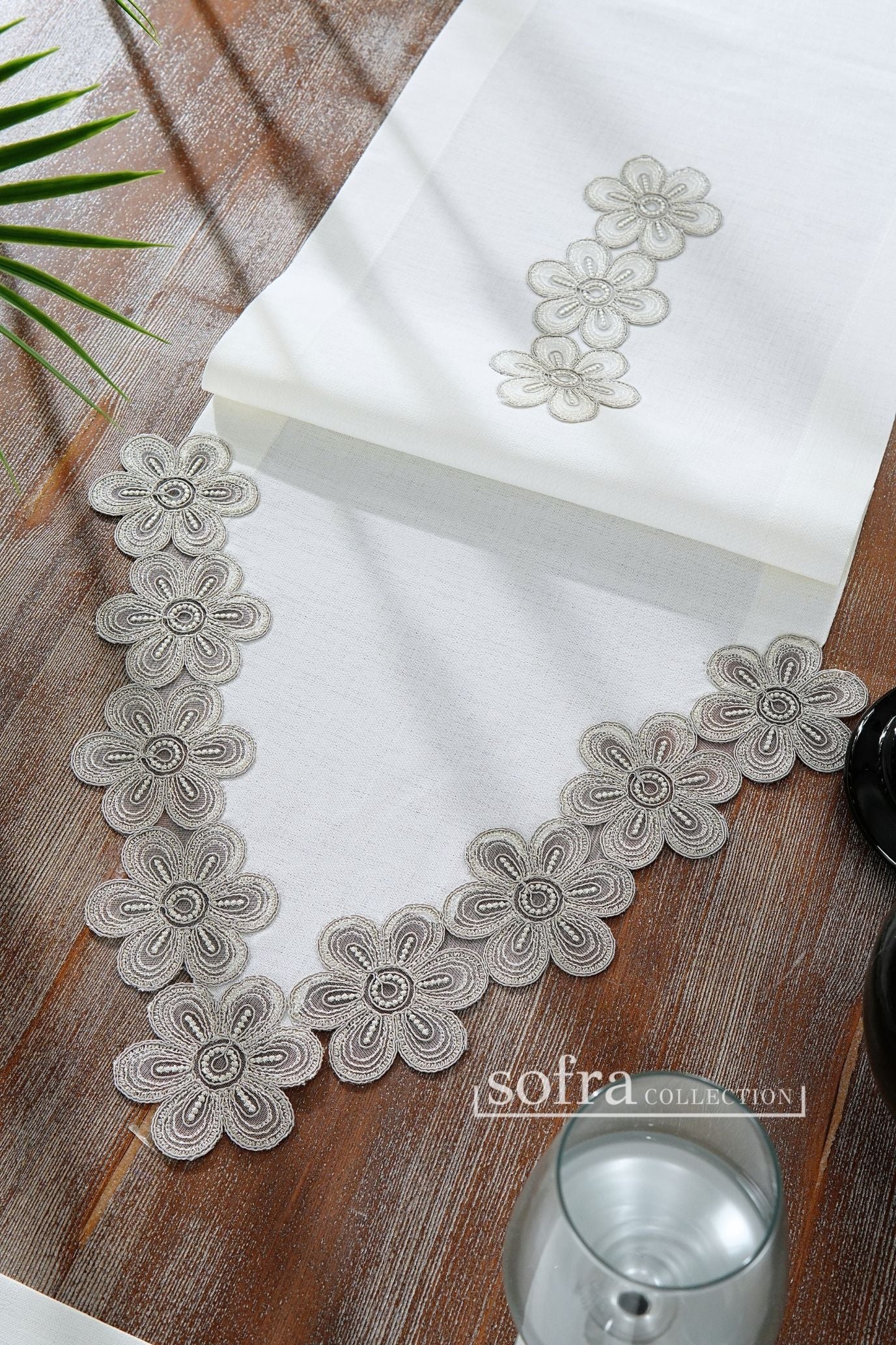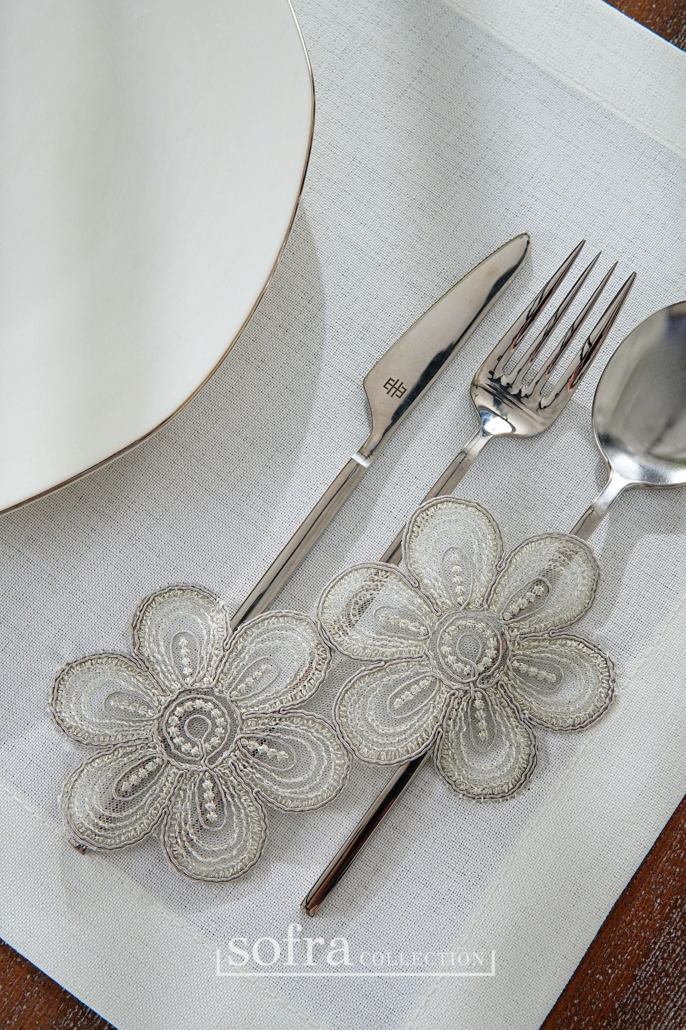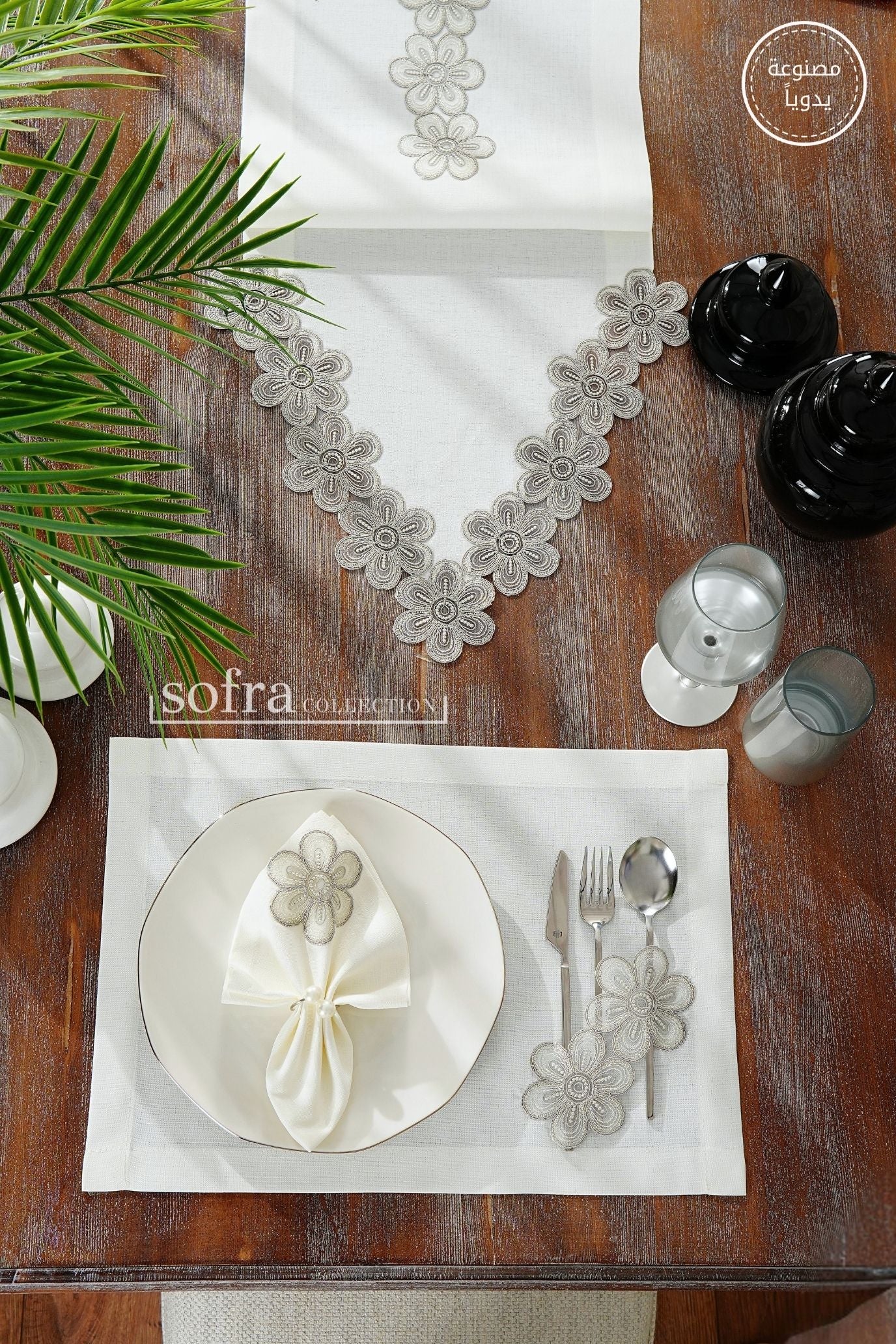طقم مفارش سفرة مزين بدانتيل فضى - موديل فونيا – شامل المناديل - ٣٧ قطعة – ١٢ شخص - قماش كتان مقاوم للبقع