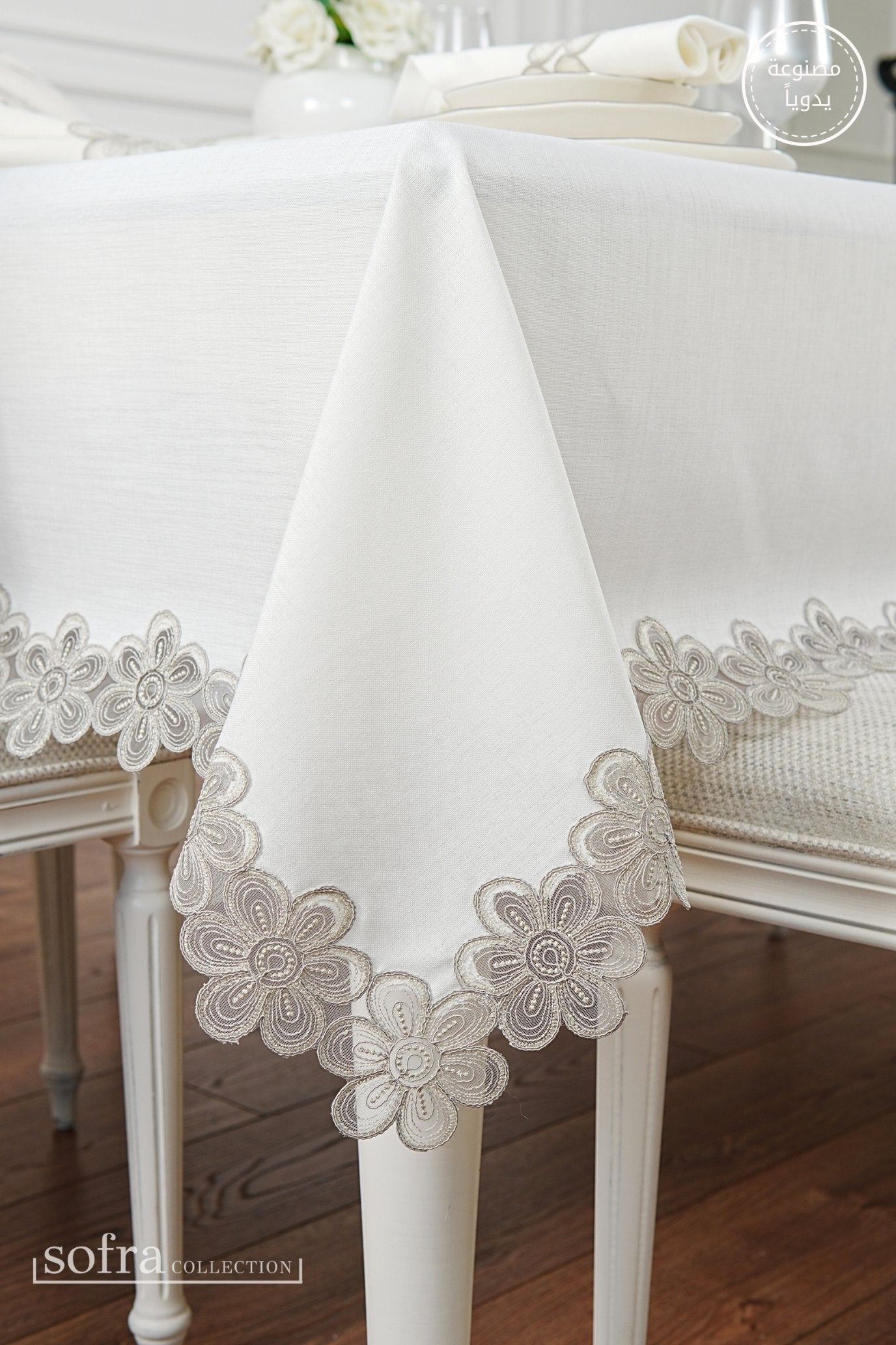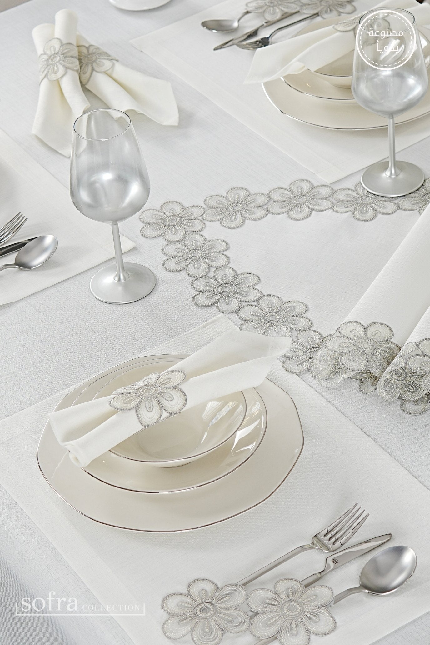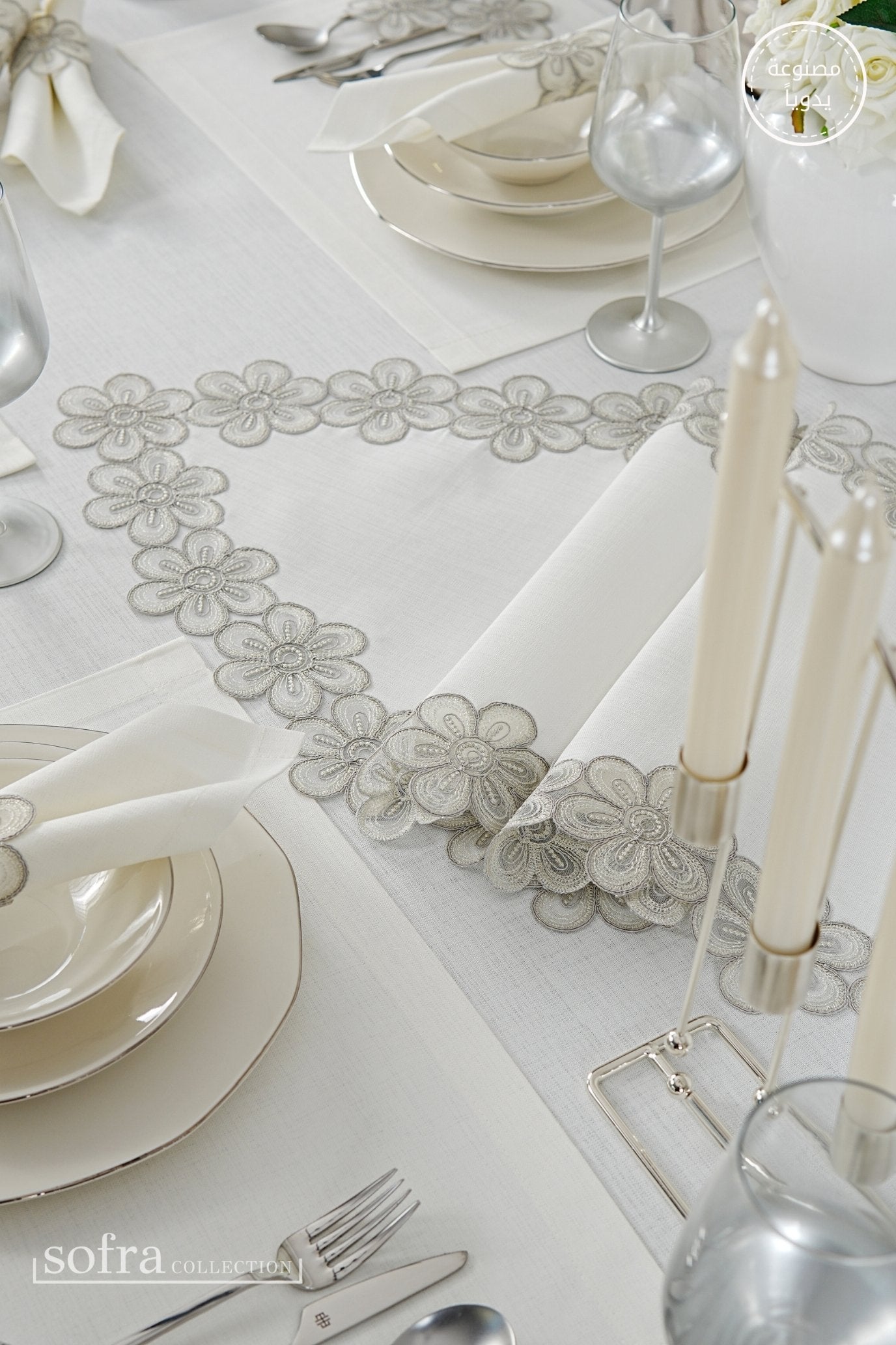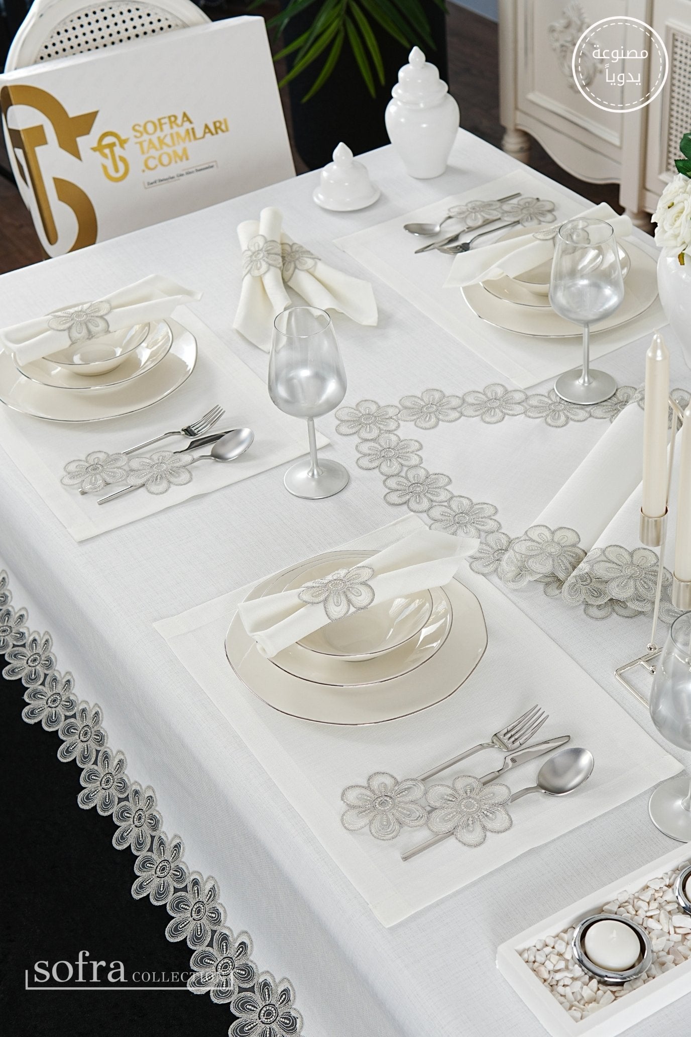 طقم مفارش سفرة مزين بدانتيل فضى - موديل فونيا – شامل المناديل - ٣٨ قطعة – ١٢ شخص - قماش كتان مقاوم للبقع
