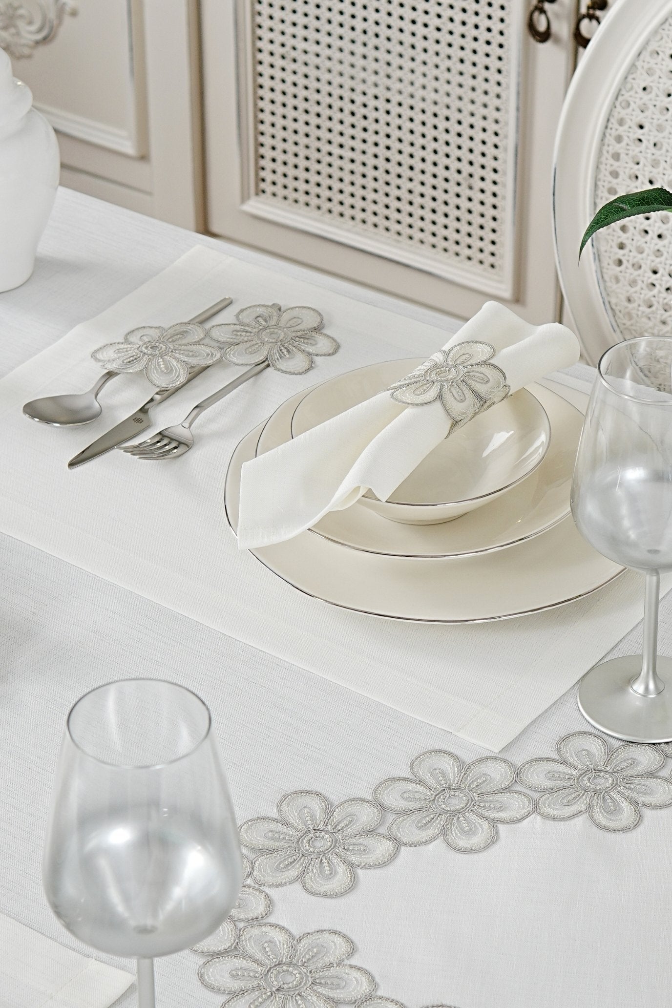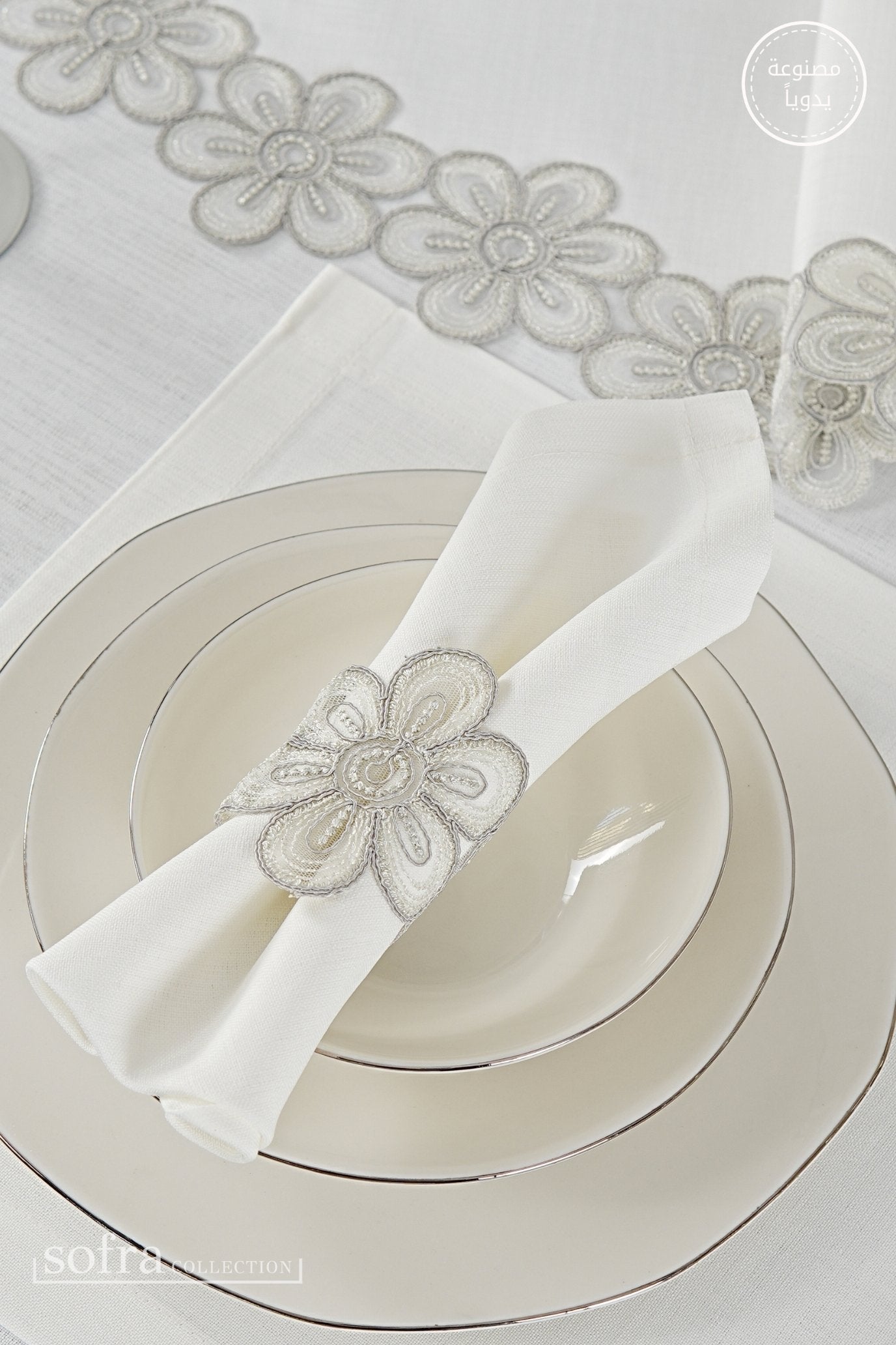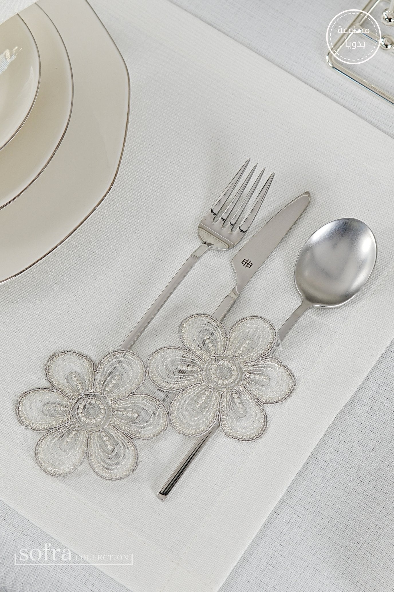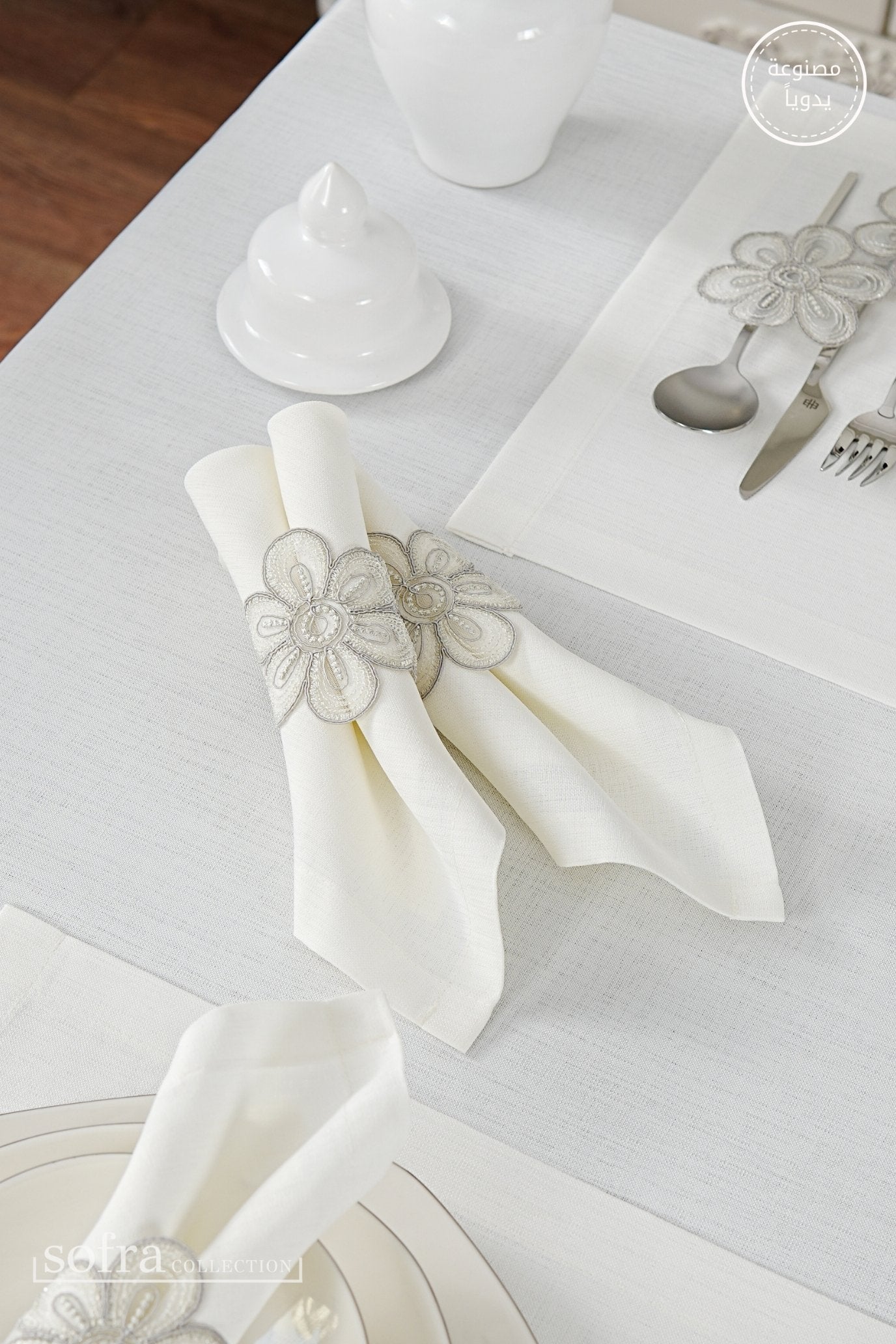 طقم مفارش سفرة مزين بدانتيل فضى - موديل فونيا – شامل المناديل - ٣٨ قطعة – ١٢ شخص - قماش كتان مقاوم للبقع