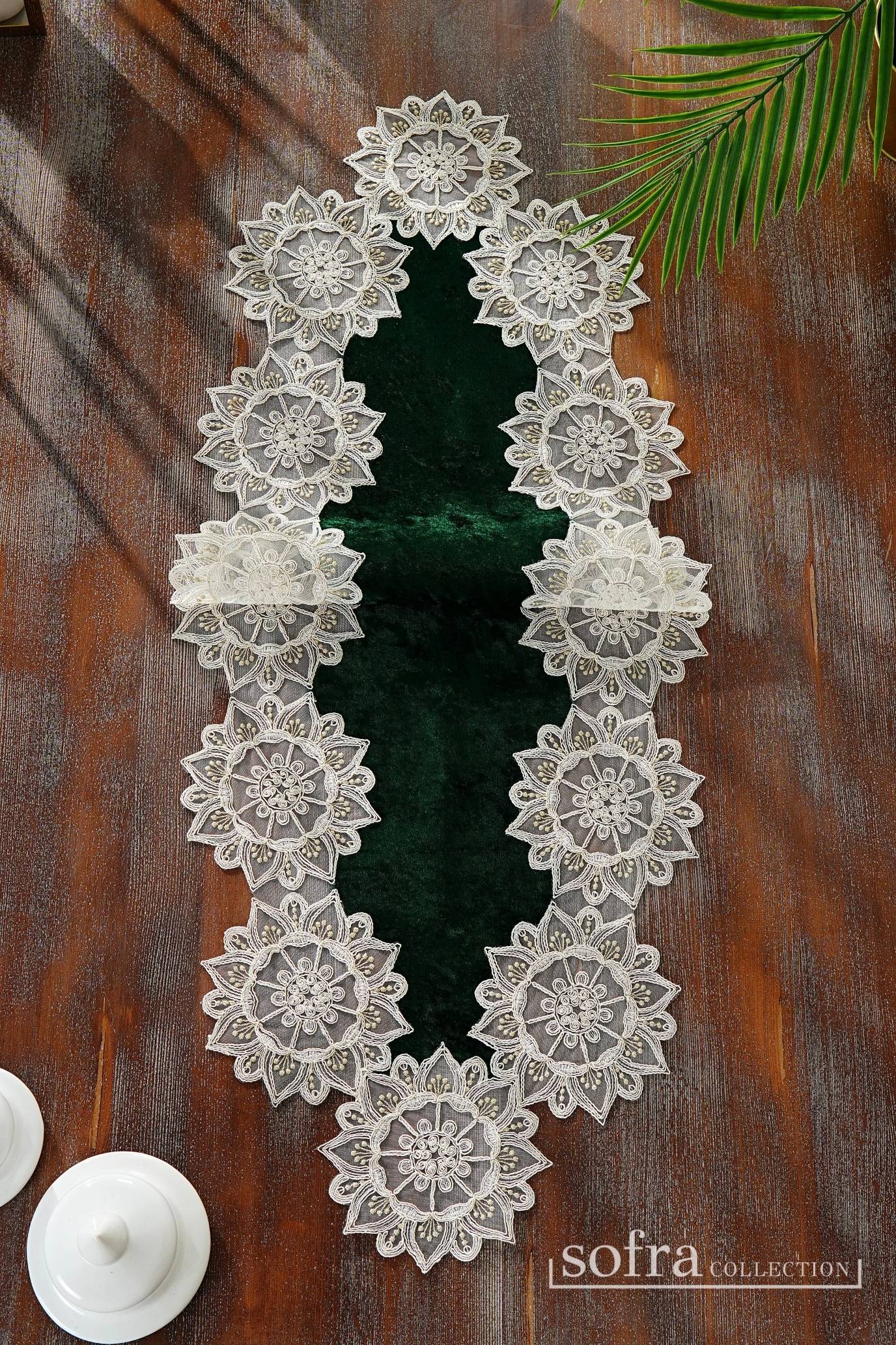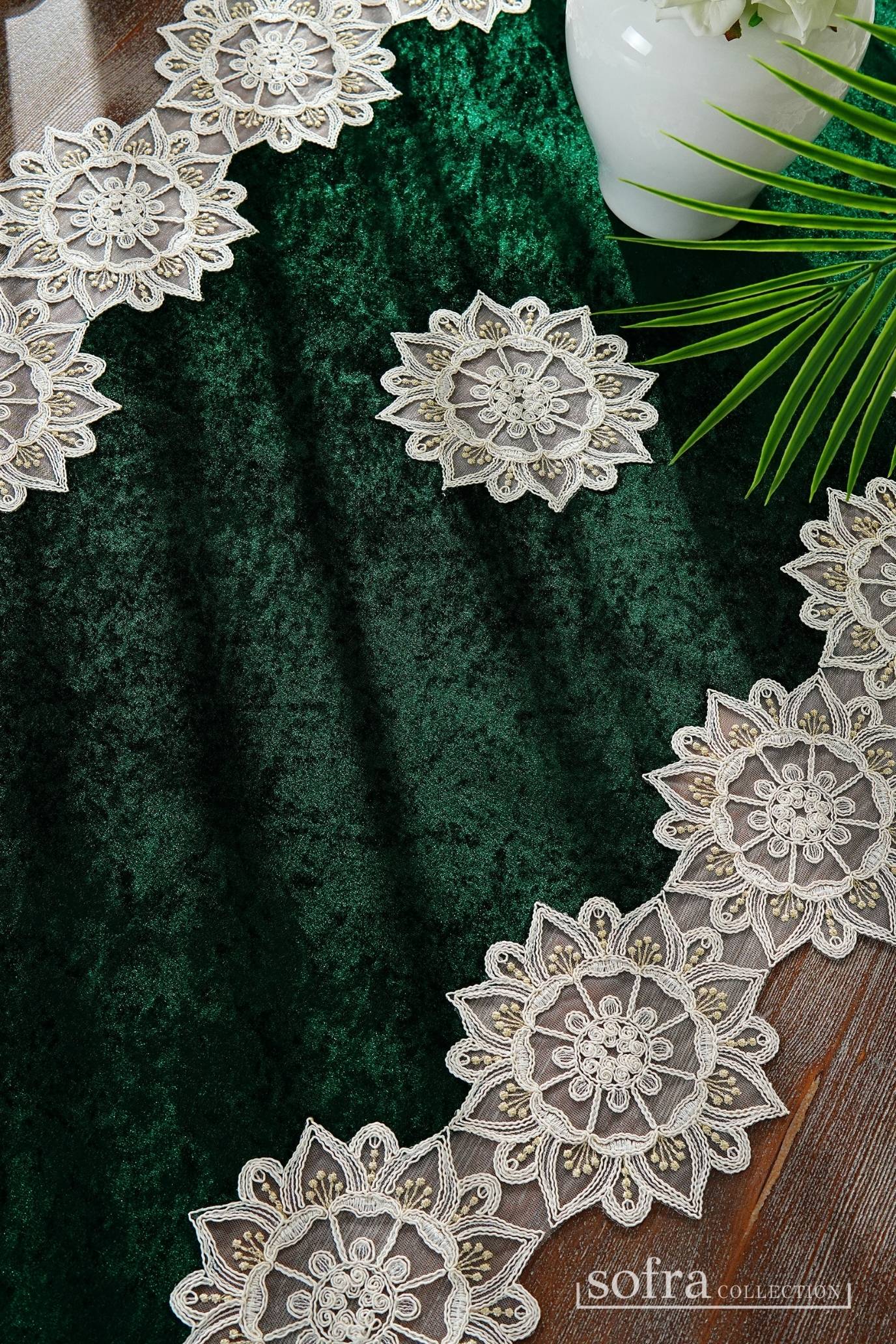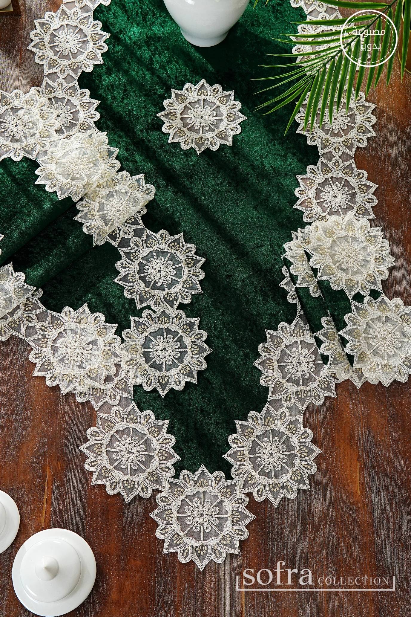 طقم مفارش صالون ٥ قطع مزين بدانتيل اوف وايت – موديل شمس – قماش قطيفة فاخر أخضر اللون