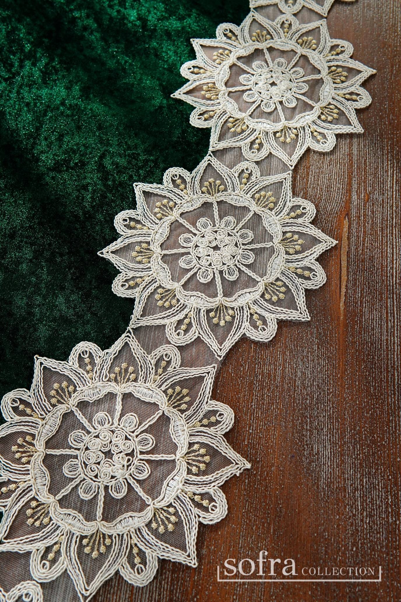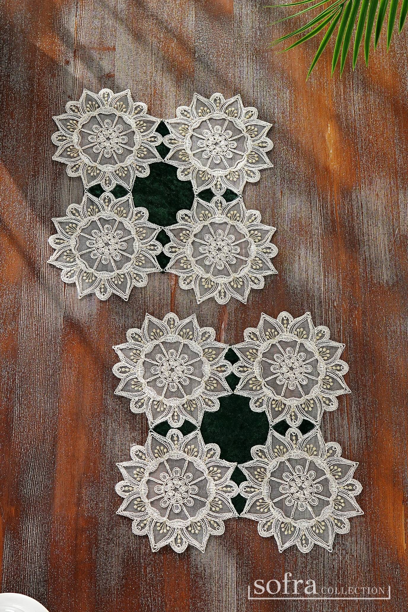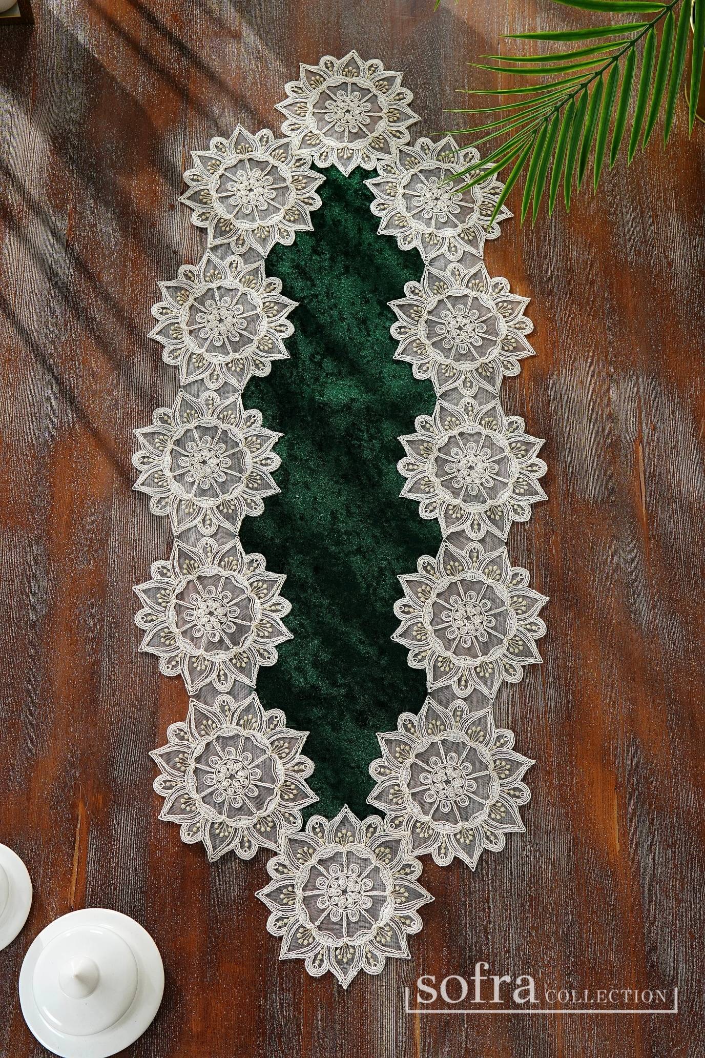 طقم مفارش صالون ٥ قطع مزين بدانتيل اوف وايت – موديل شمس – قماش قطيفة فاخر أخضر اللون