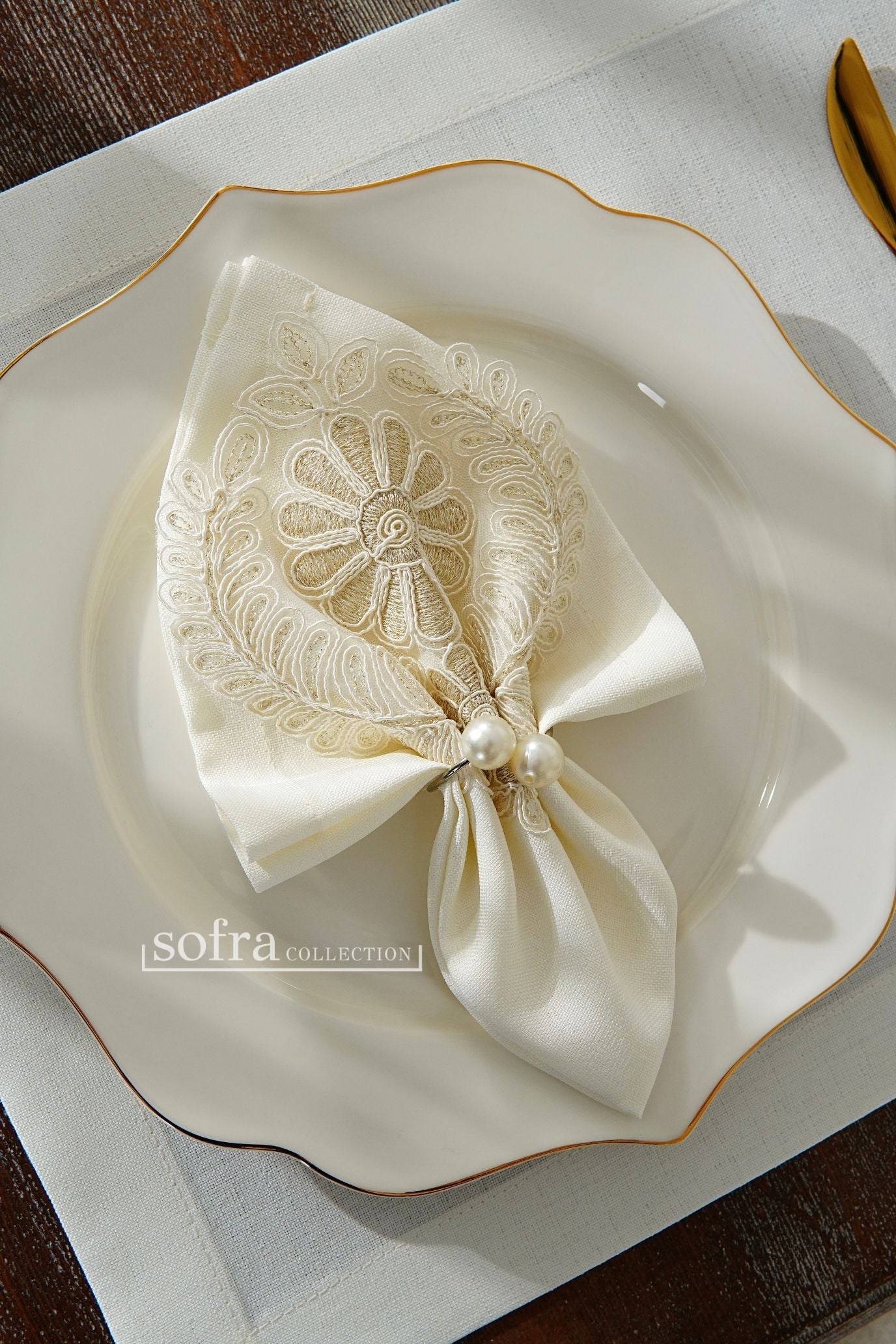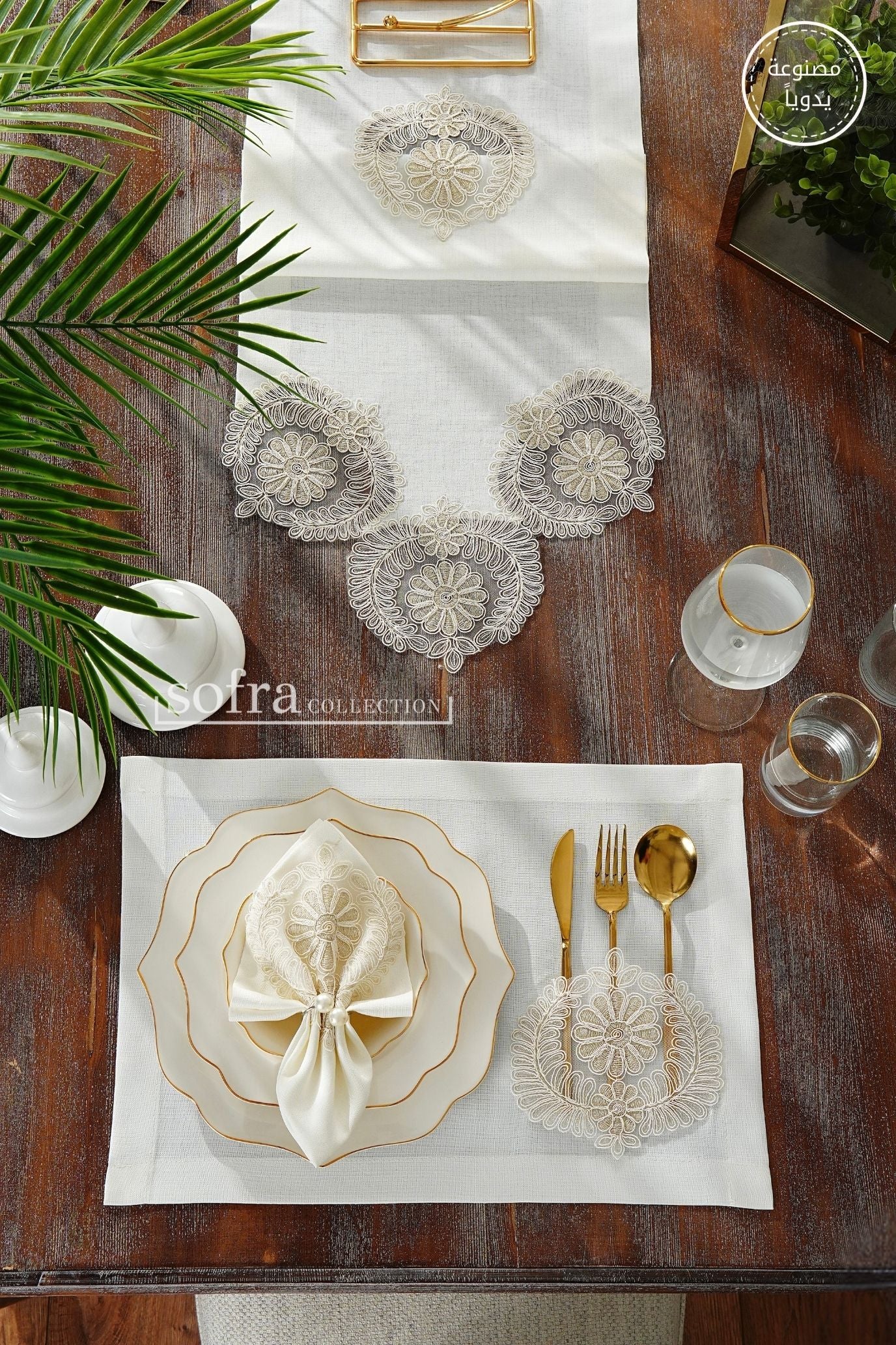 طقم مفارش سفرة مزين بدانتيل ذهبى - موديل هيلين – شامل المناديل - ٣٧ قطعة – ١٢ شخص - قماش كتان مقاوم للبقع
