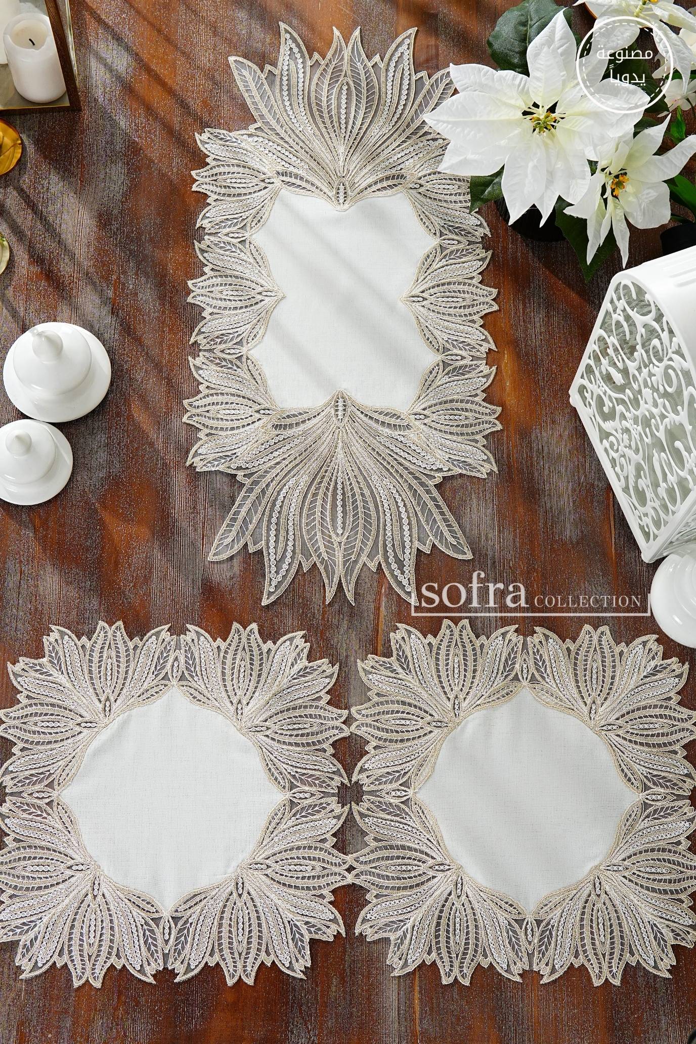 طقم مفارش ٣ قطع مزين بدانتيل ذهبى – موديل كاكتوس - قماش كتان فاخر مقاوم للبقع