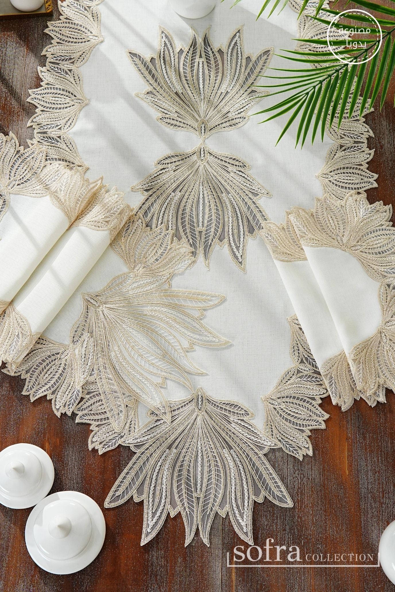 طقم مفارش صالون ٥ قطع مزين بدانتيل ذهبى – موديل كاكتوس - قماش كتان فاخر مقاوم للبقع