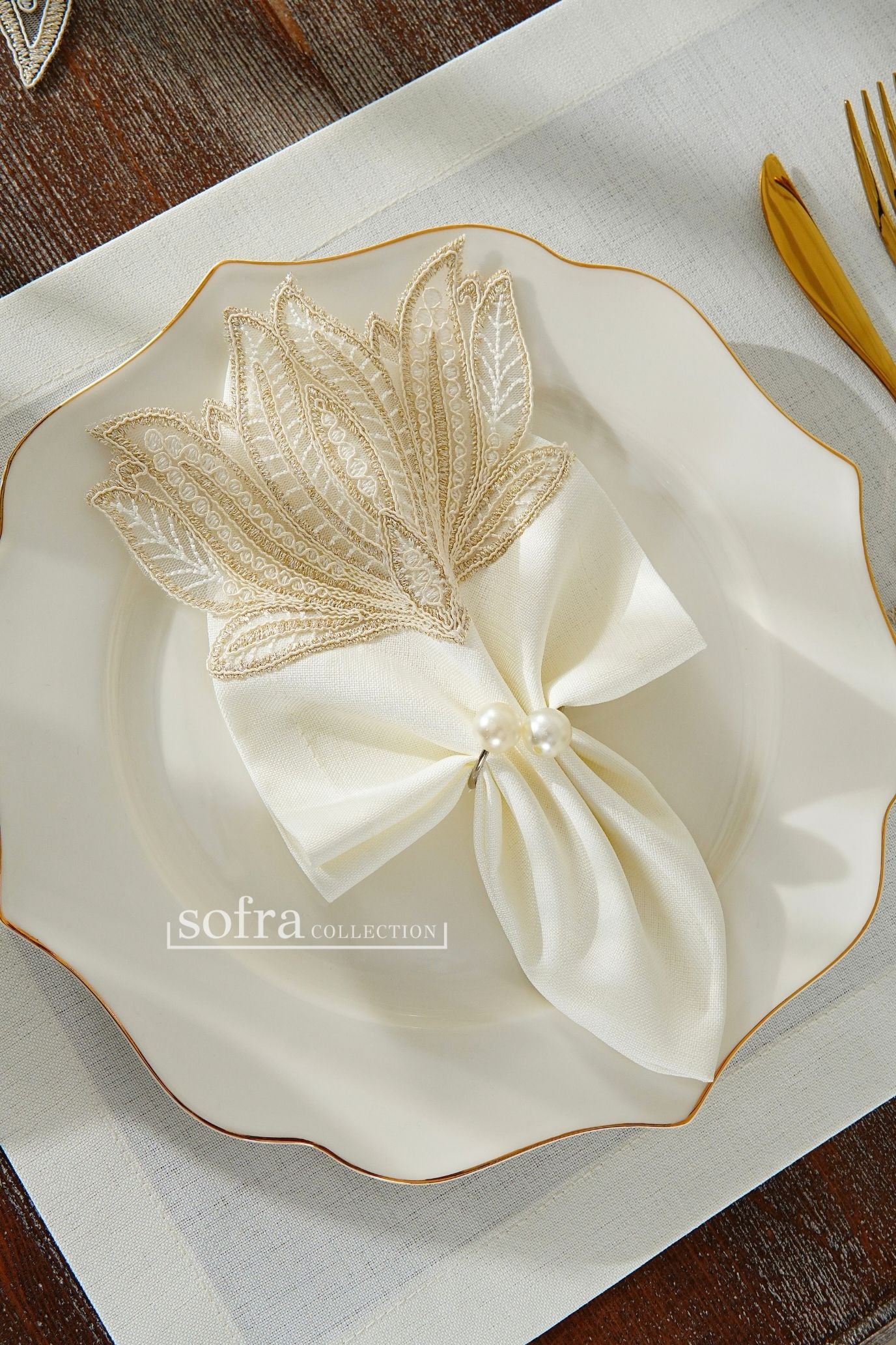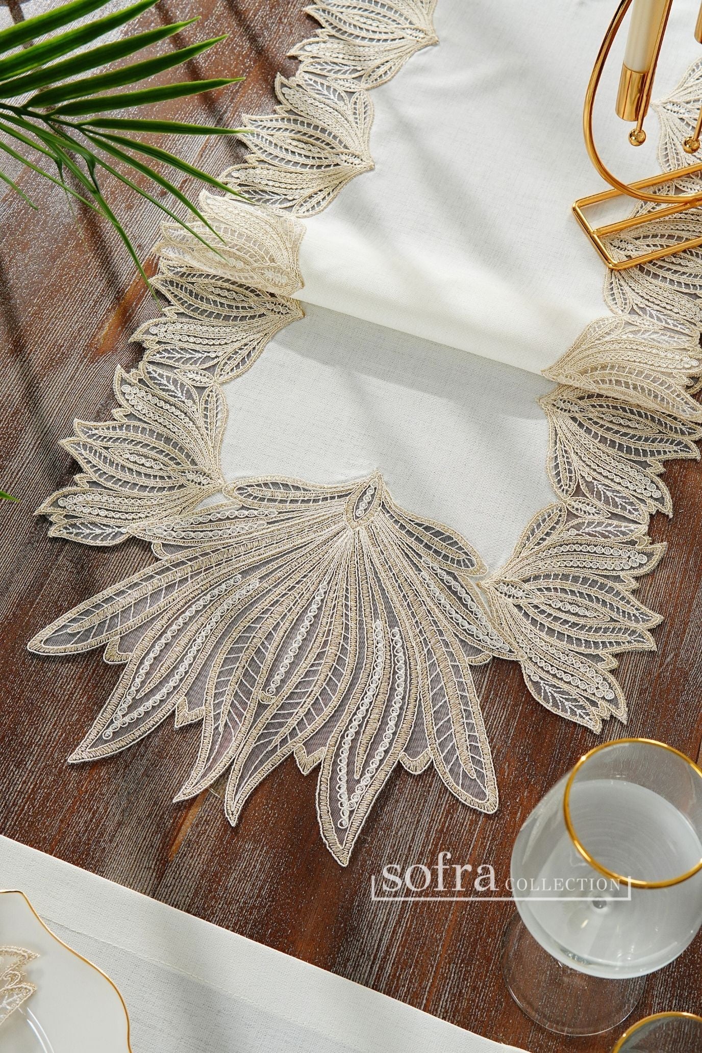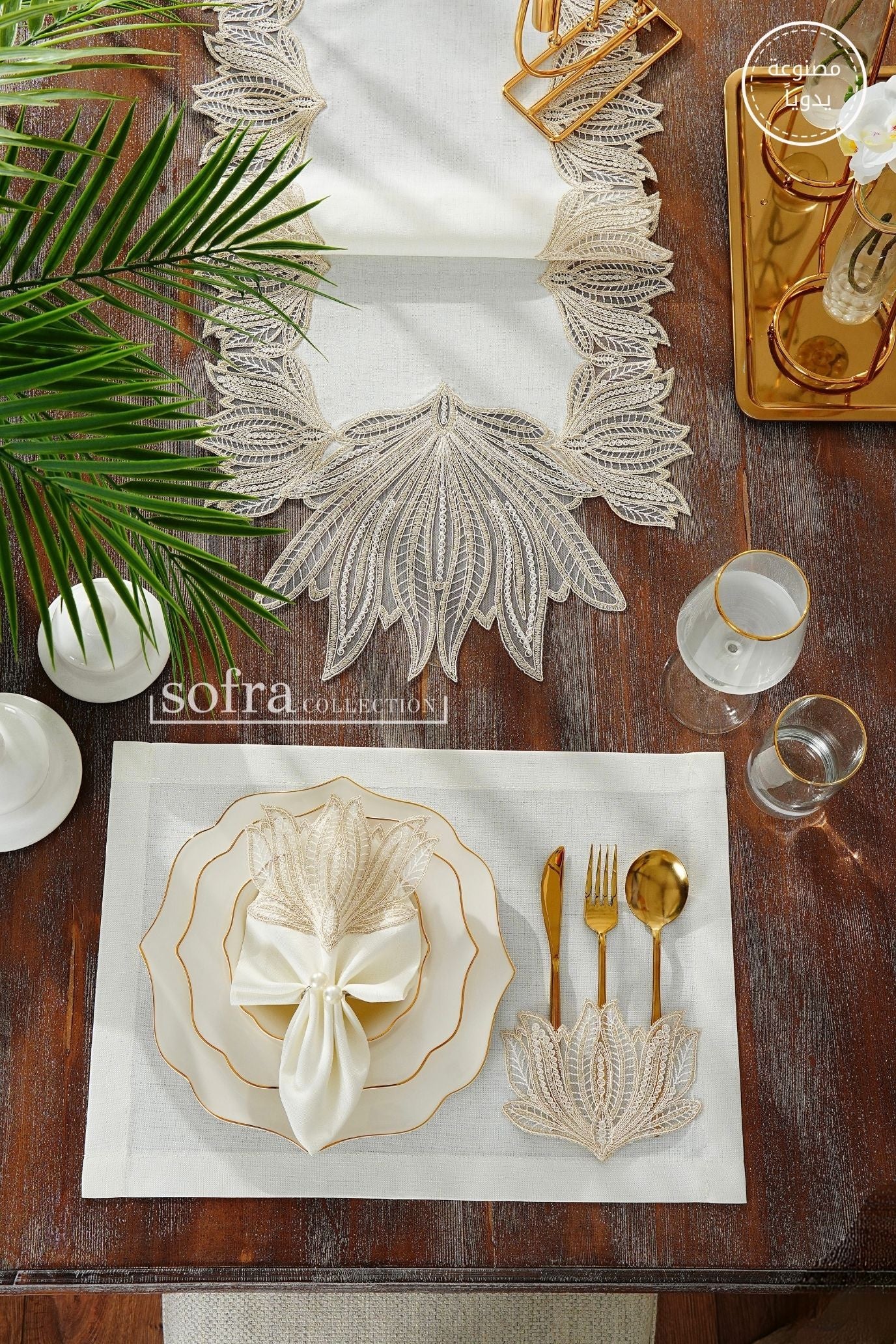 طقم مفارش سفرة مزين بدانتيل ذهبى - تصميم كاكتوس – شامل المناديل - ٣٧ قطعة – ١٢ شخص - قماش كتان مقاوم للبقع